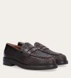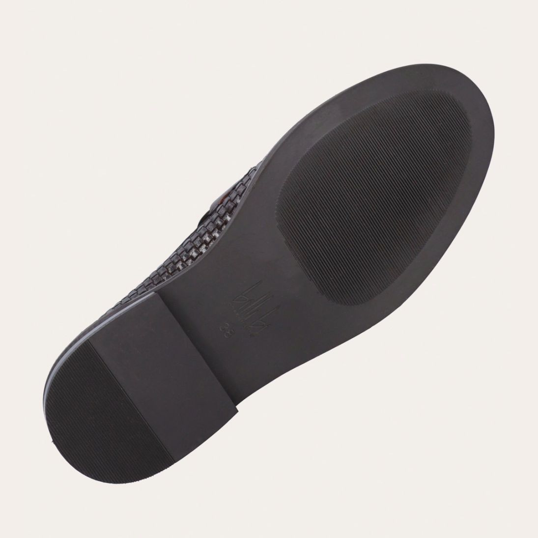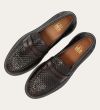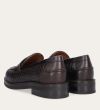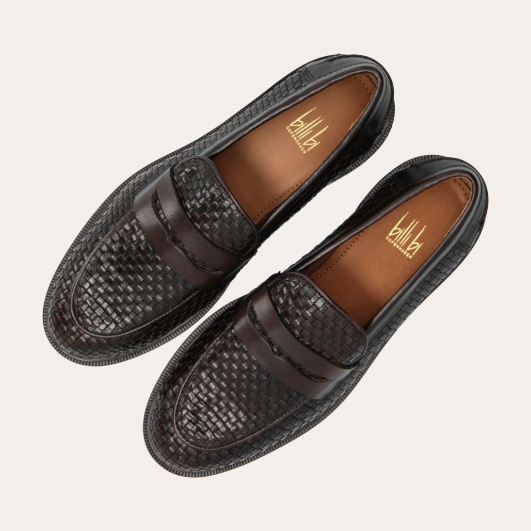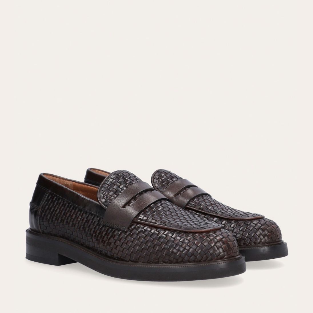 Håndlavet loafer udført i mørkebrunt flettet skind, rund tå og et dekorativt cut-out henover fronten.