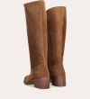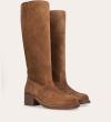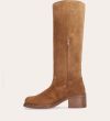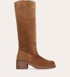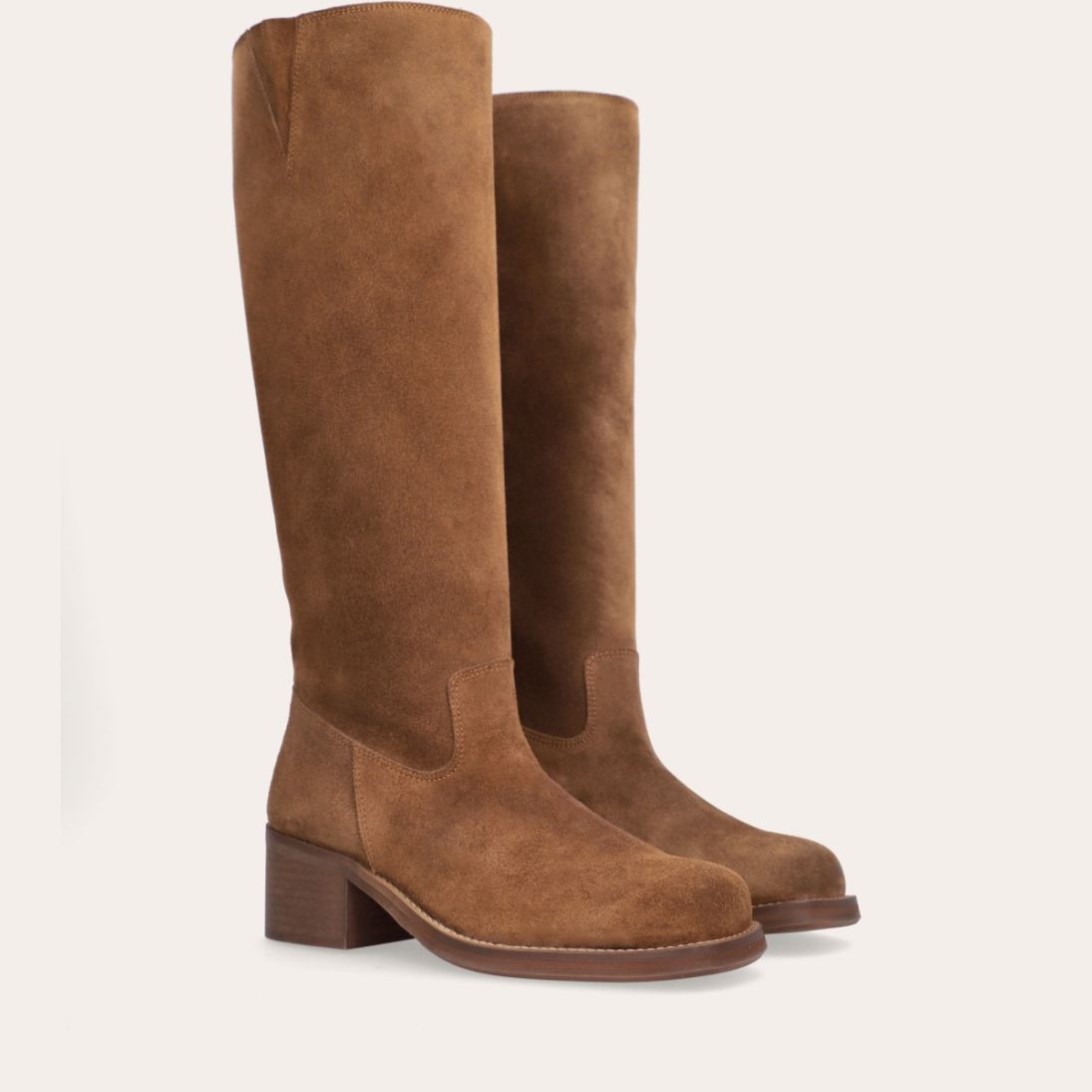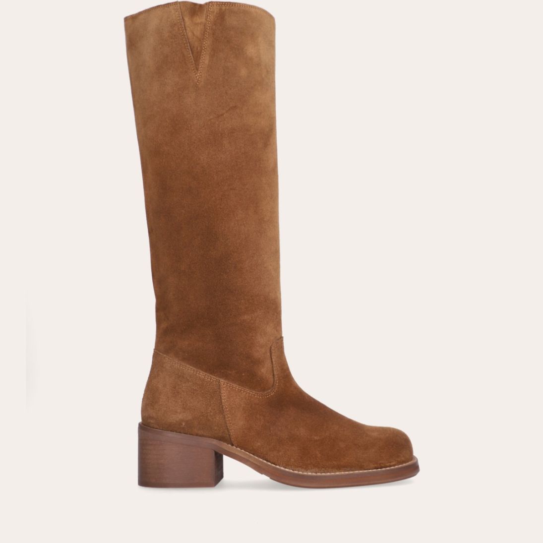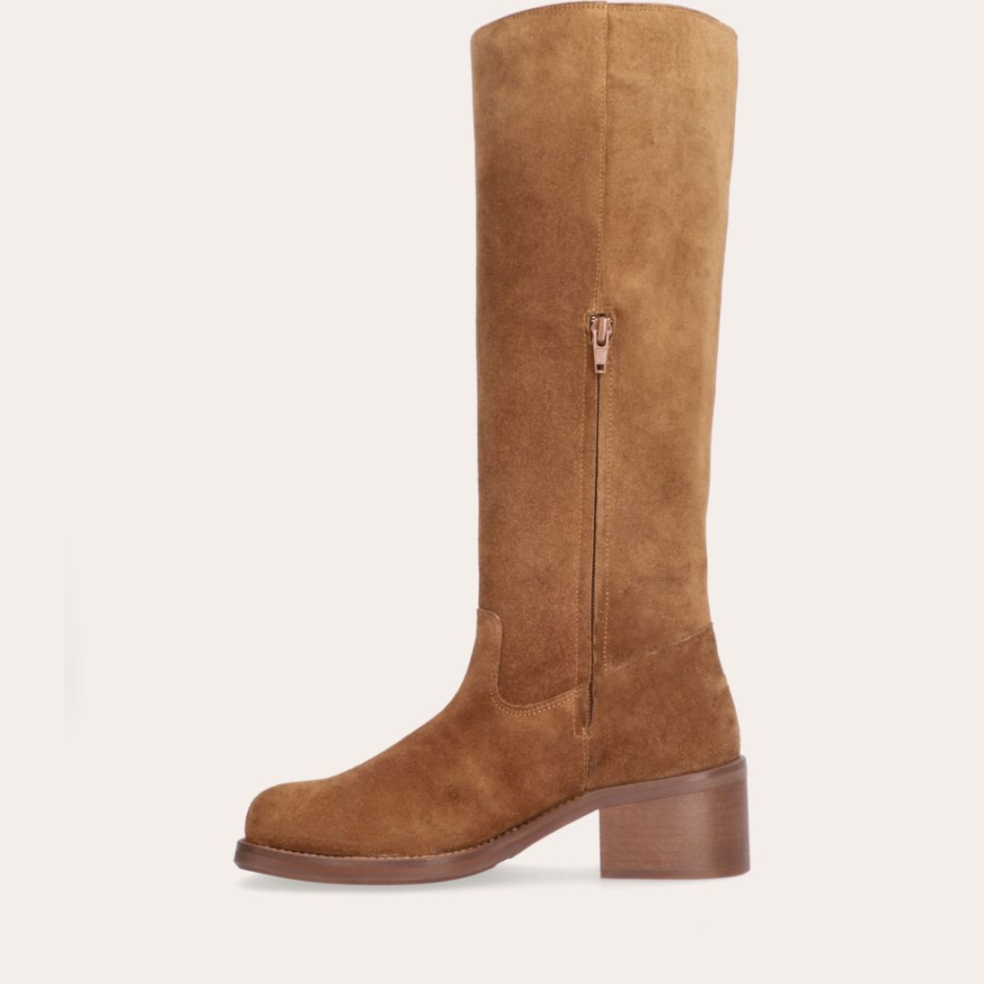 Håndlavet langskaftet støvle, udført i cognac-farvet ruskind med firkantet tå. Støvlen er dekoreret med syninger foran og langs skaftet samt en strop bagpå. På ydersiden øverst er et indsnit. Støvlen har en mellemhøj blokhæl og lukkes med en diskret lynlås på indersiden.