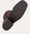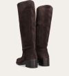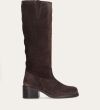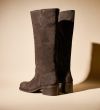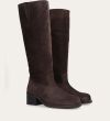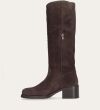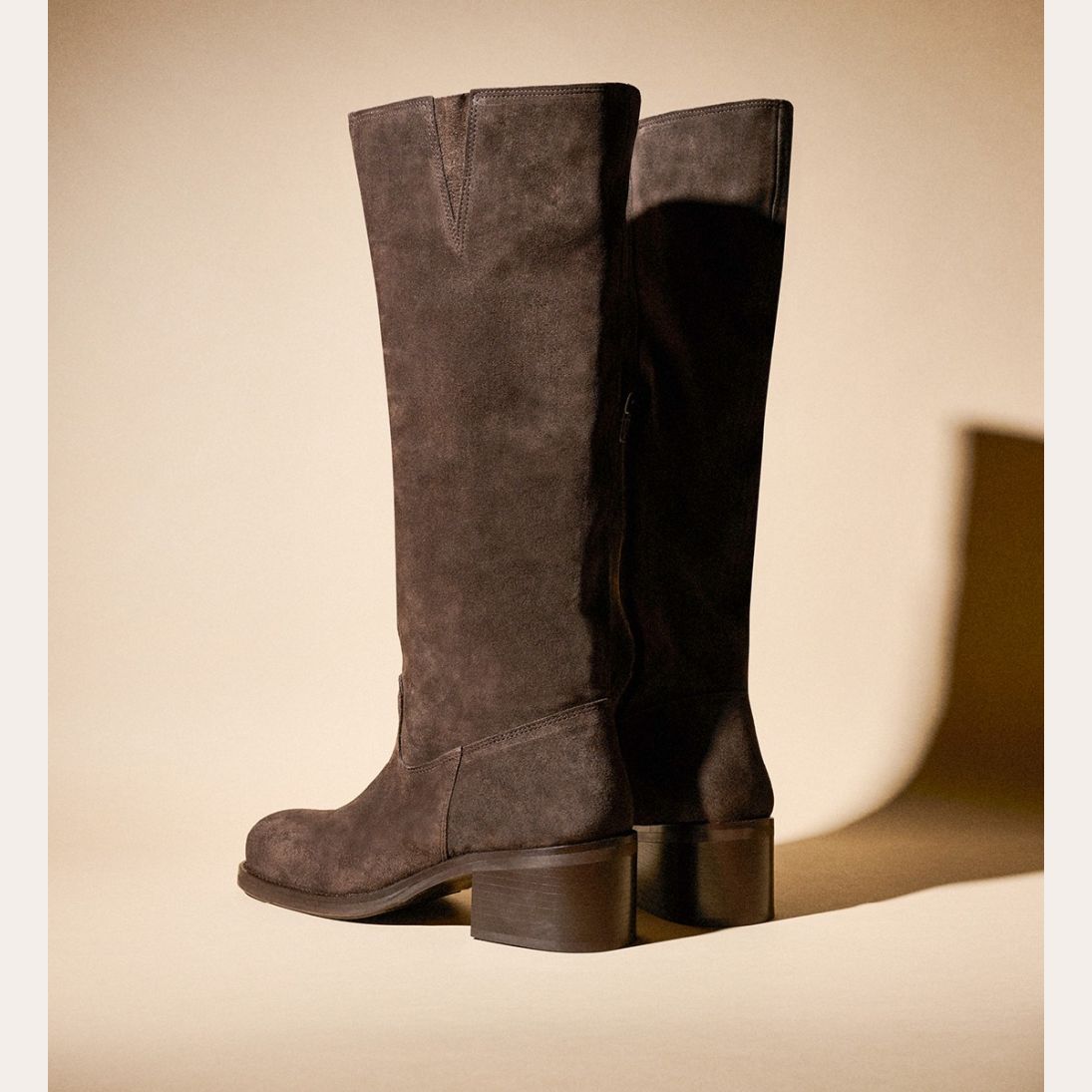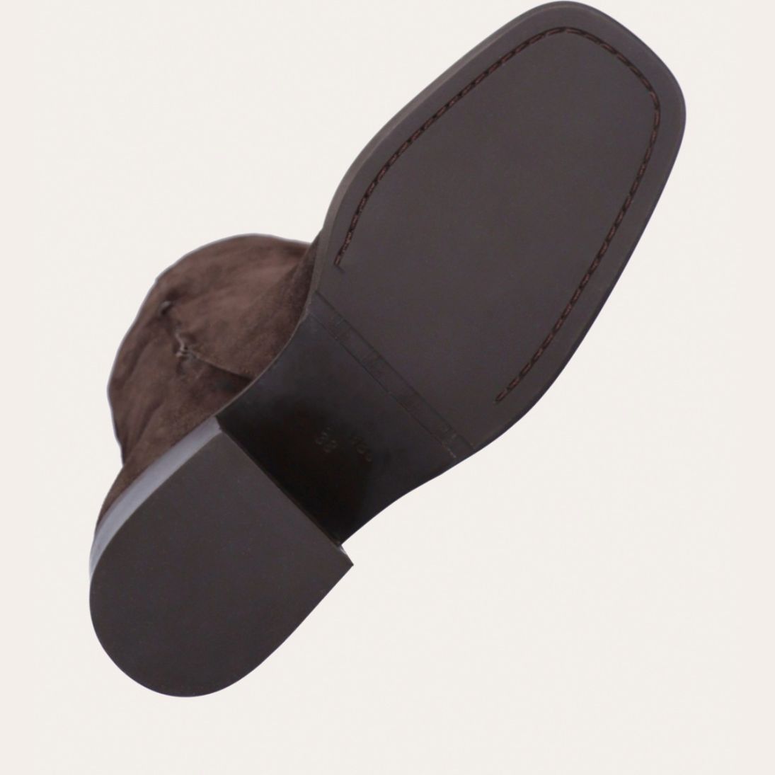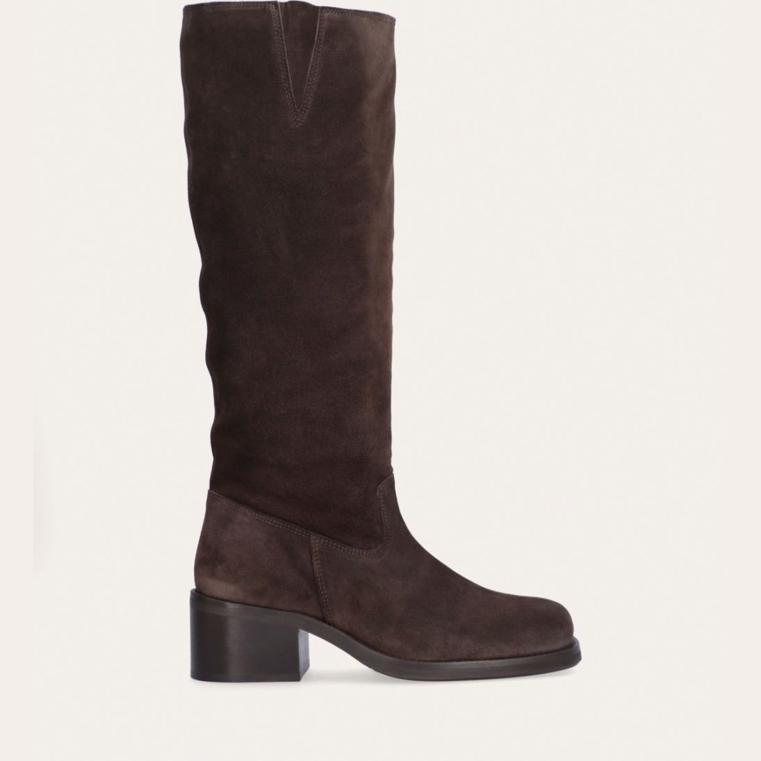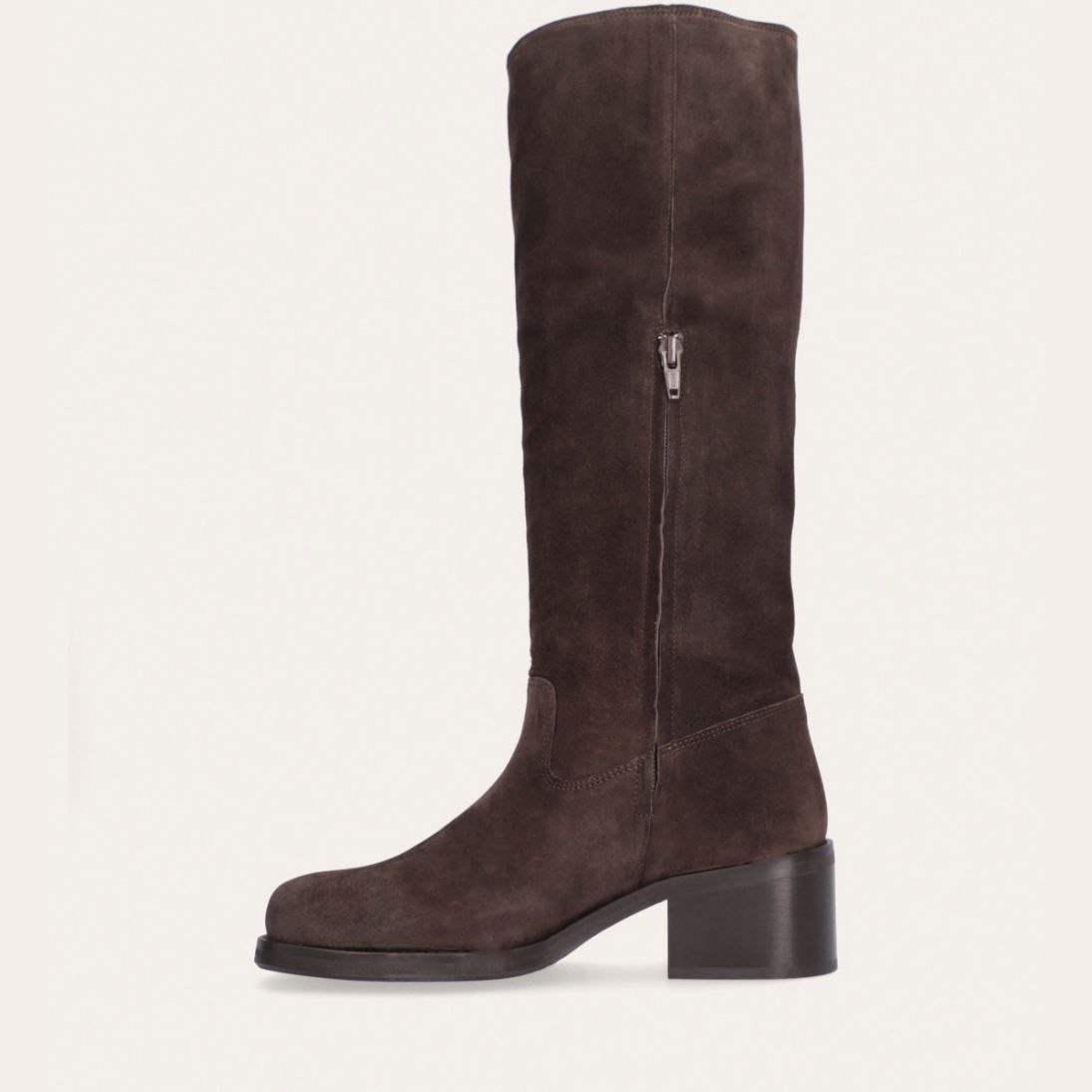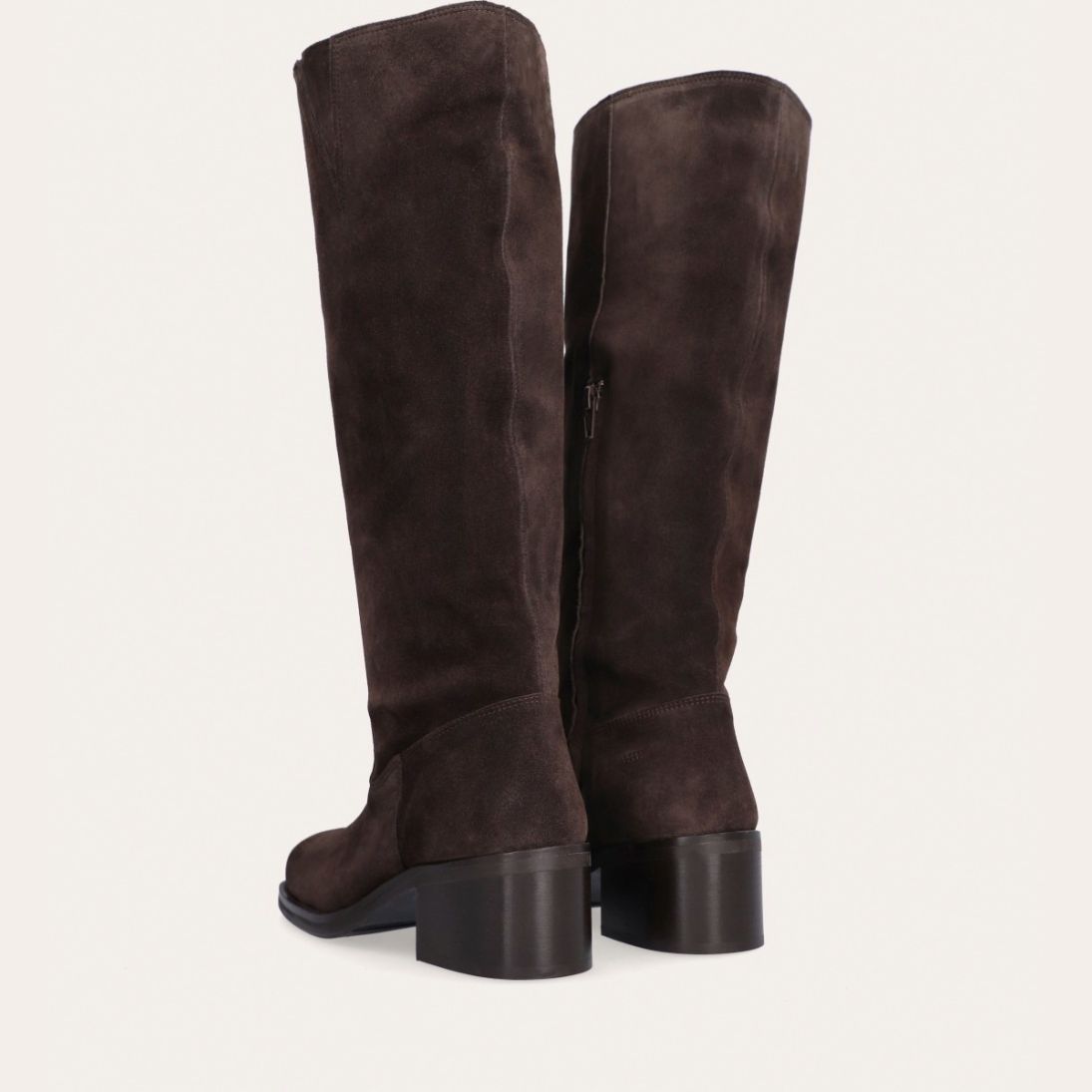 Håndlavet langskaftet støvle, udført i mørkebrunt ruskind med firkantet tå. Støvlen er dekoreret med syninger foran og langs skaftet samt en strop bagpå. På ydersiden øverst er et indsnit. Støvlen har en mellemhøj blokhæl og lukkes med en diskret lynlås på indersiden.