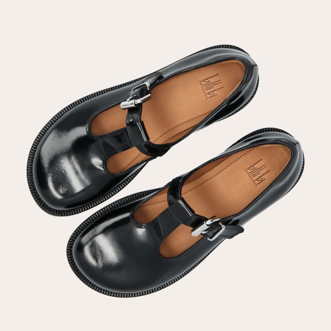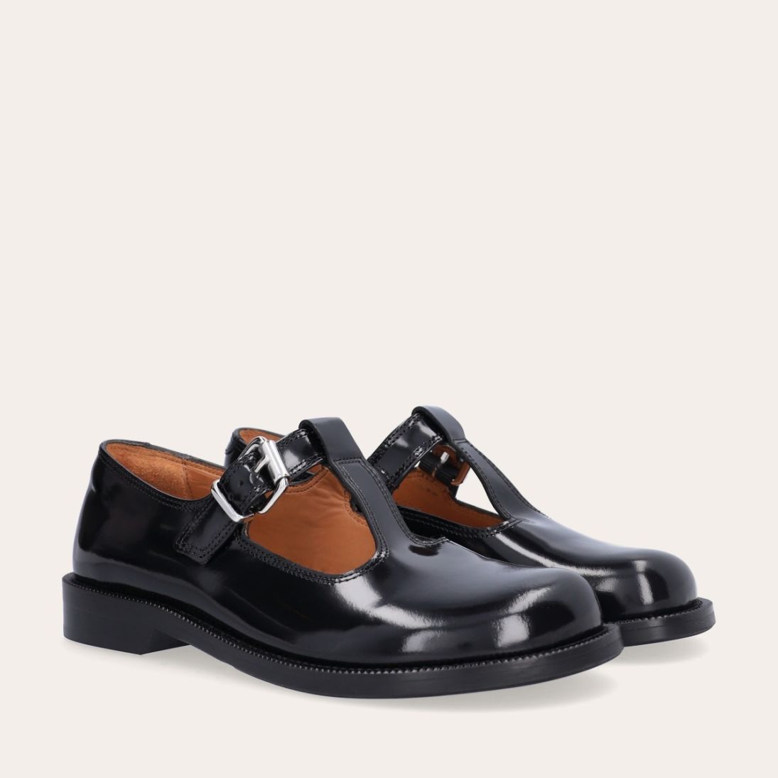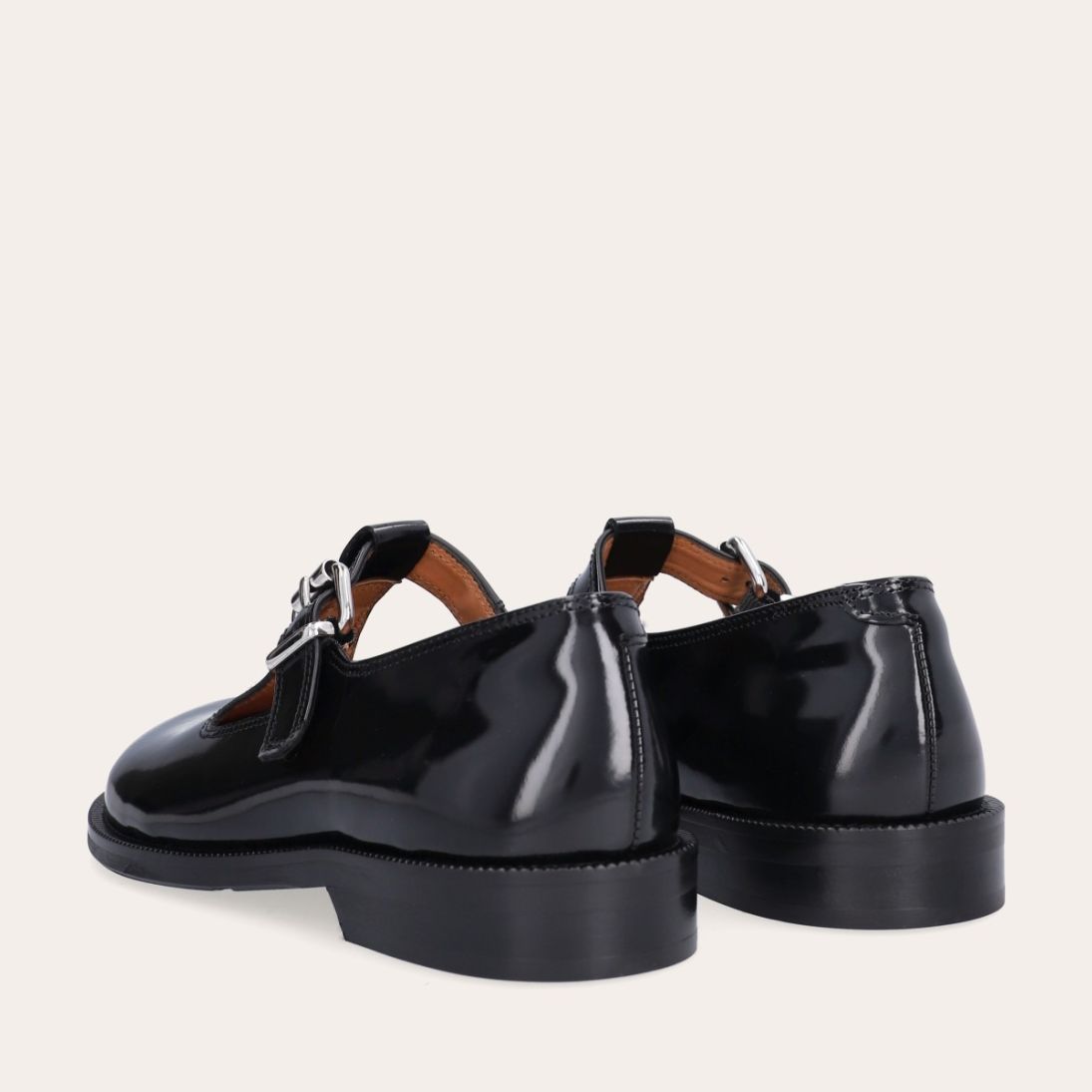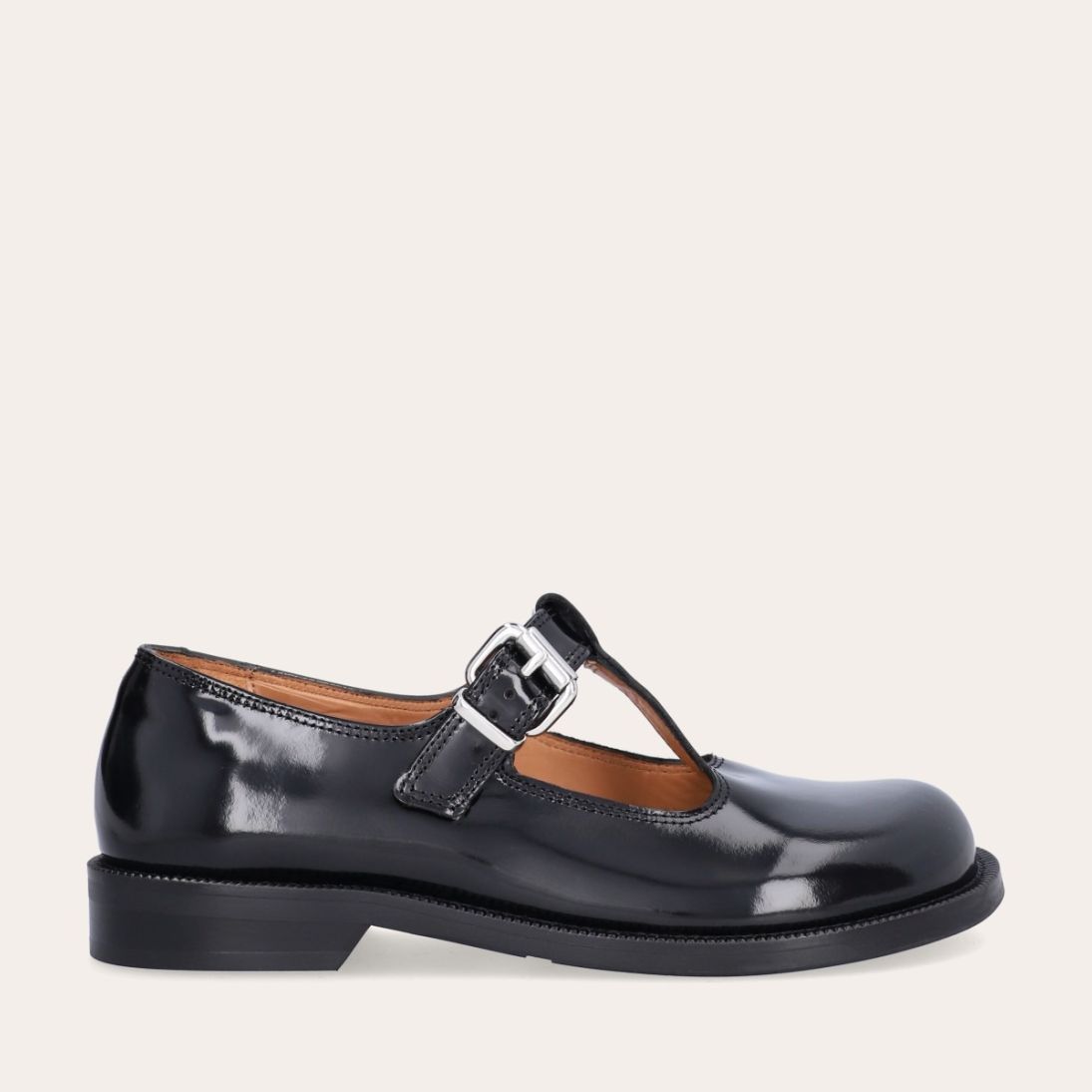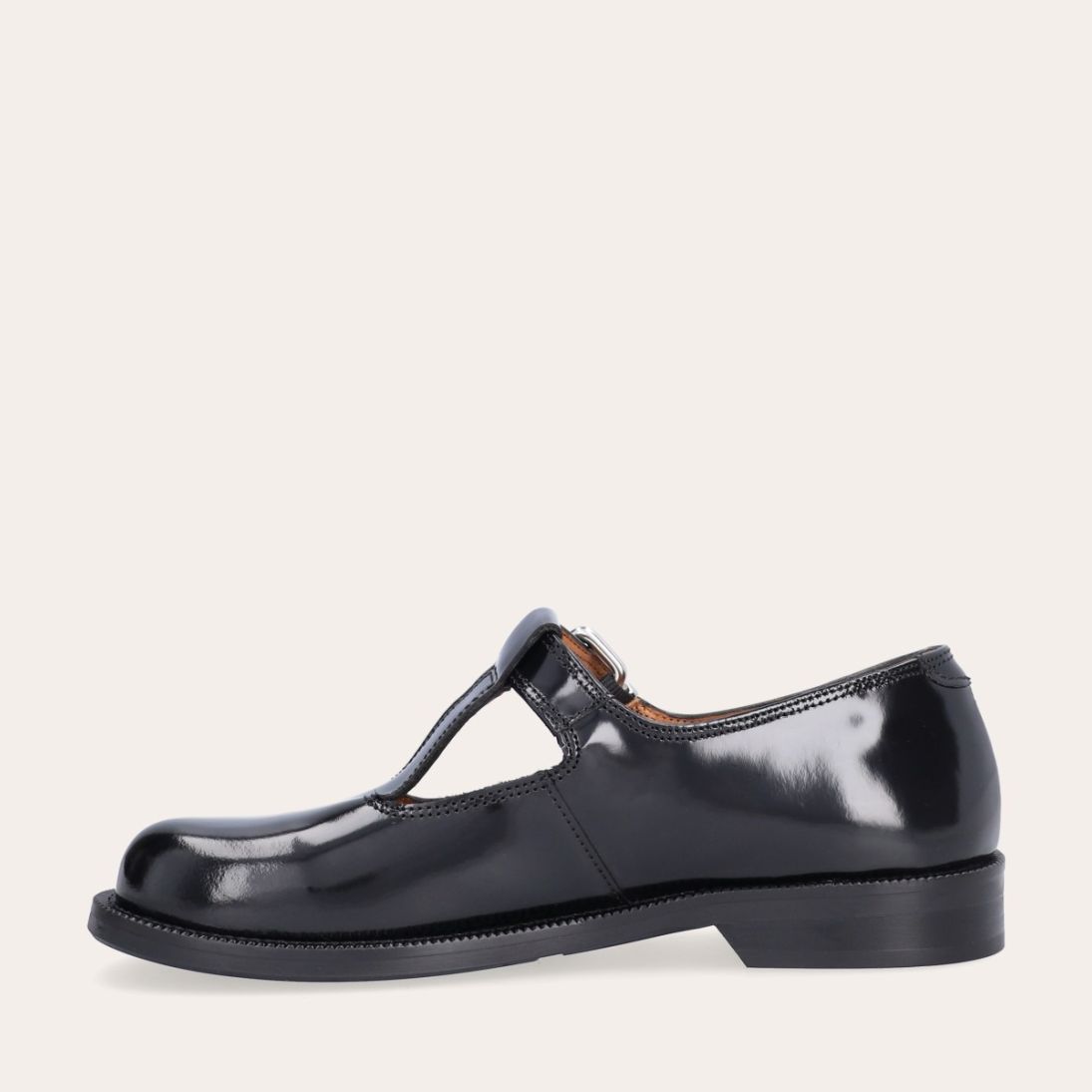 Håndlavet Mary Jane loafer, udført i sort polido skind med en rund tå. Den har en t-strop henover fronten, som lukkes med et sølvspænde.