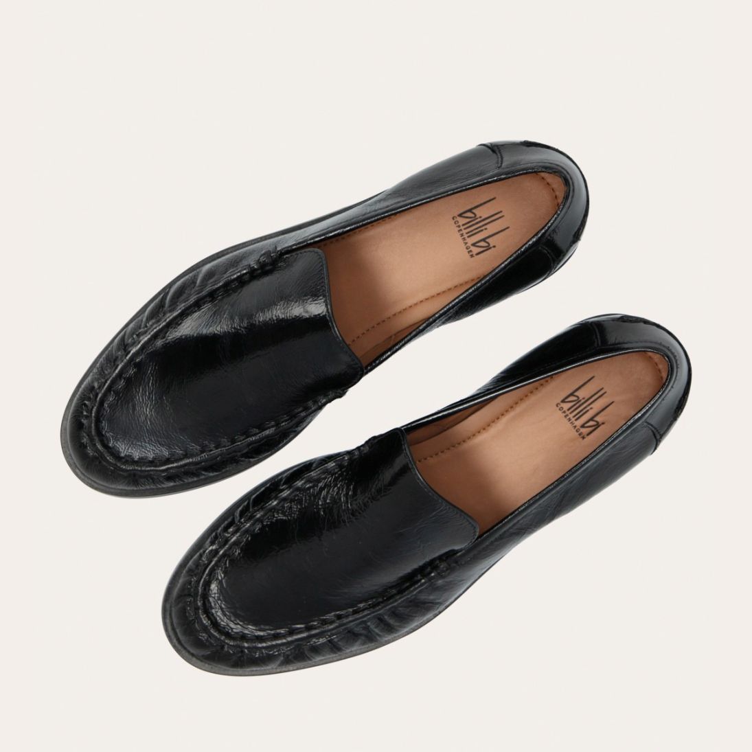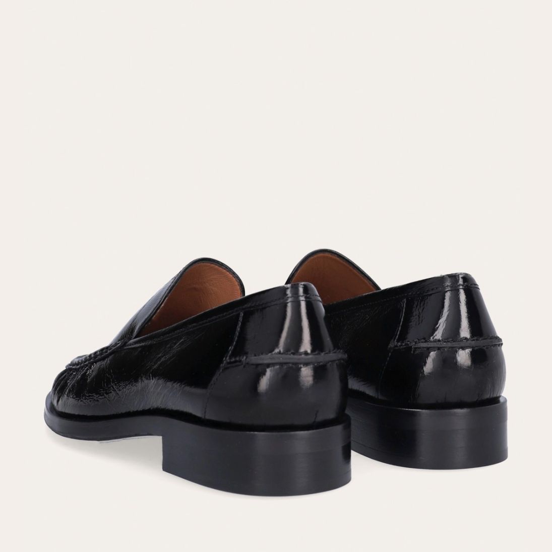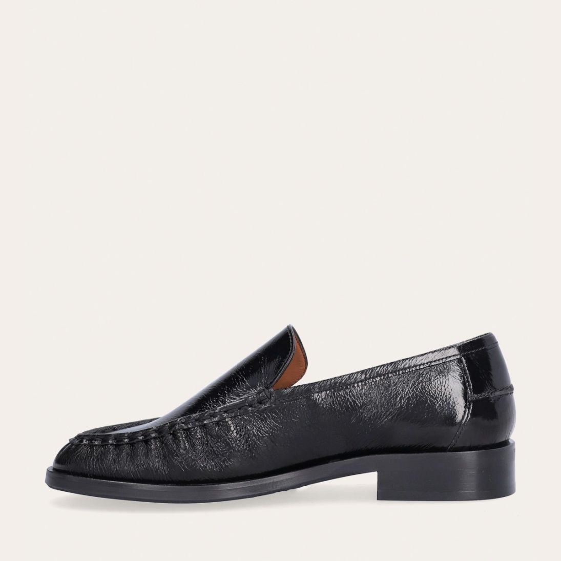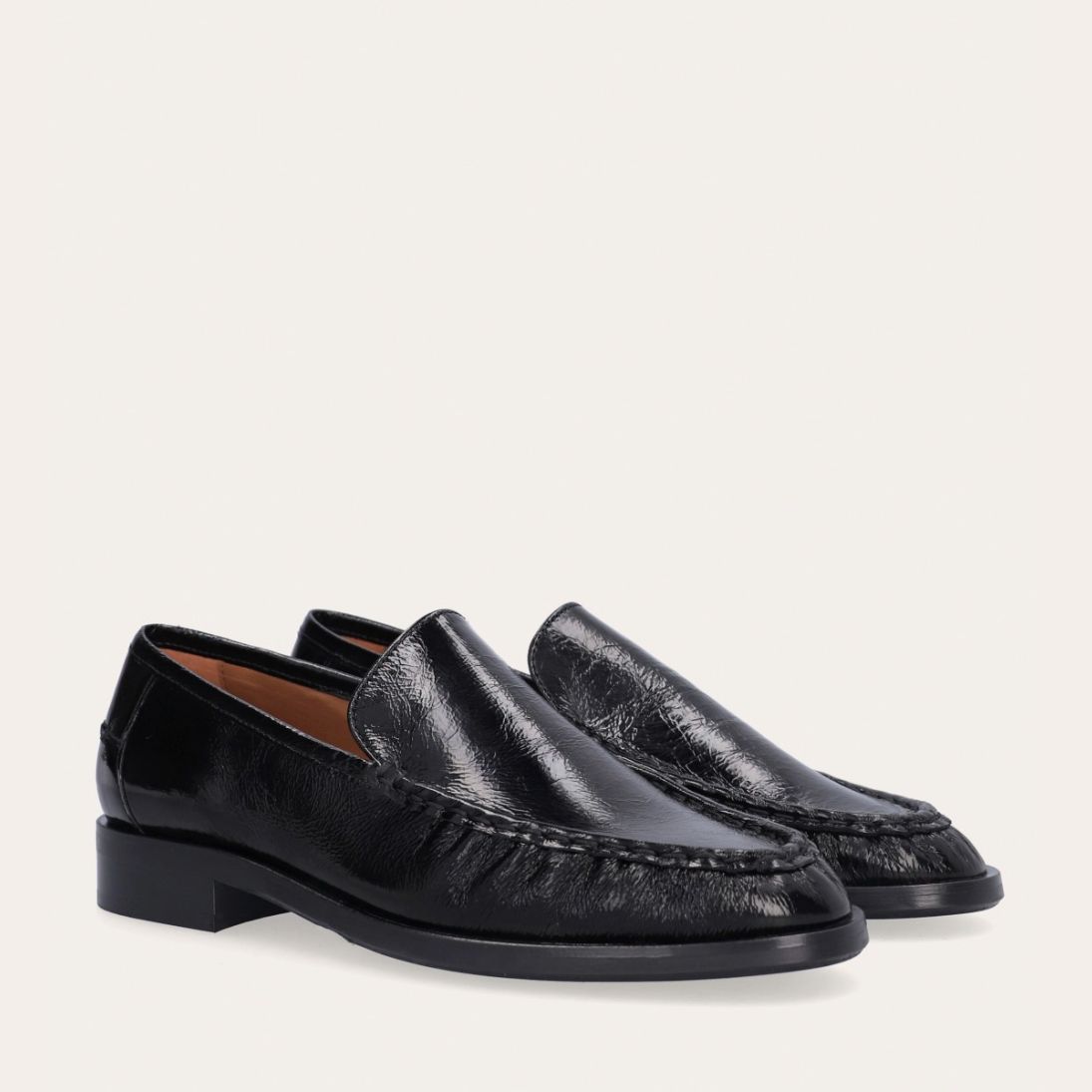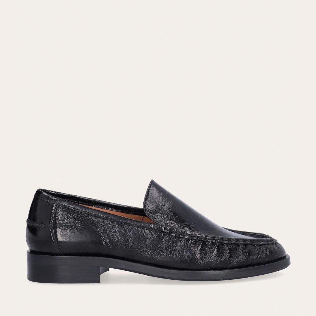 Håndlavet loafer, udført i sort lakeret skind med rund tå. Foran er loaferen dekoreret med en markeret stikning, hvor skindet danner en let rynkning, der understreger den håndværksmæssige finish.
