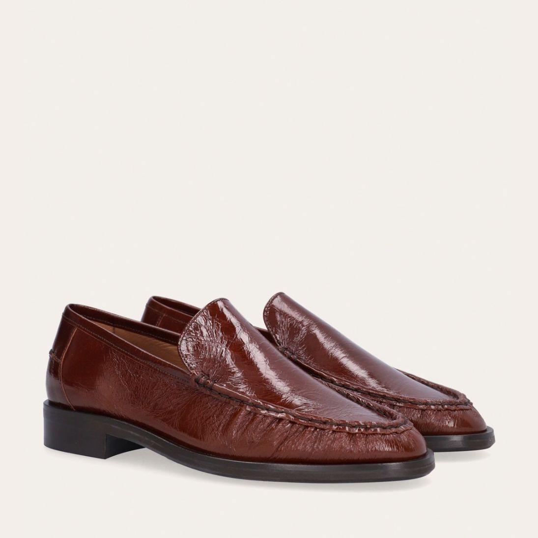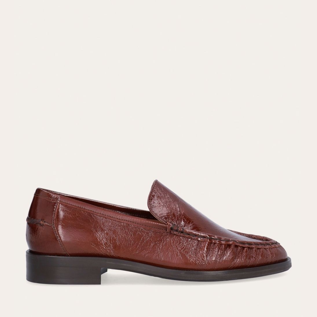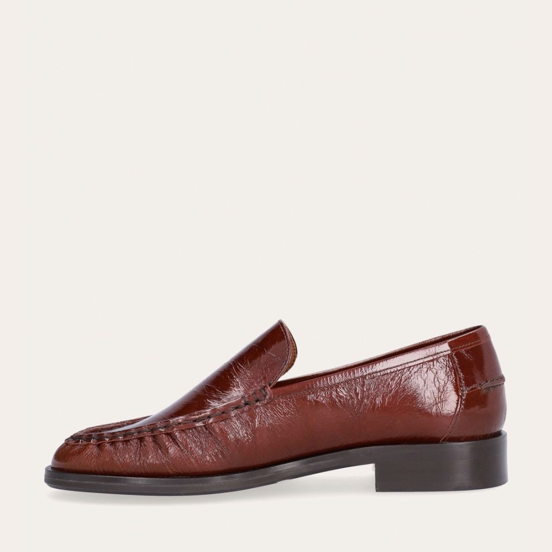 Håndlavet loafer, udført i kastanjebrunt lakeret skind med rund tå. Foran er loaferen dekoreret med en markeret stikning, hvor skindet danner en let rynkning, der understreger den håndværksmæssige finish.