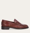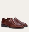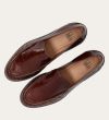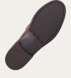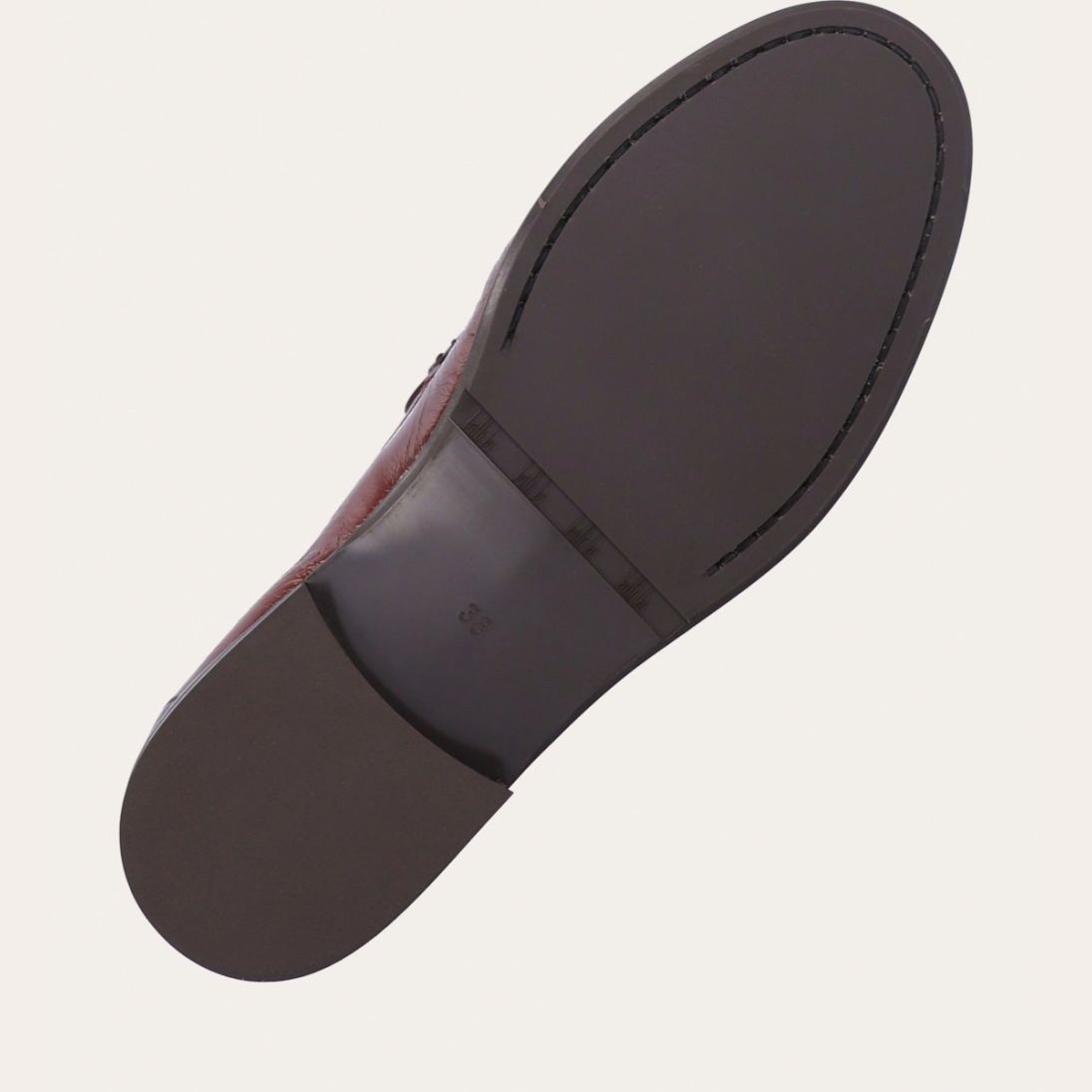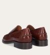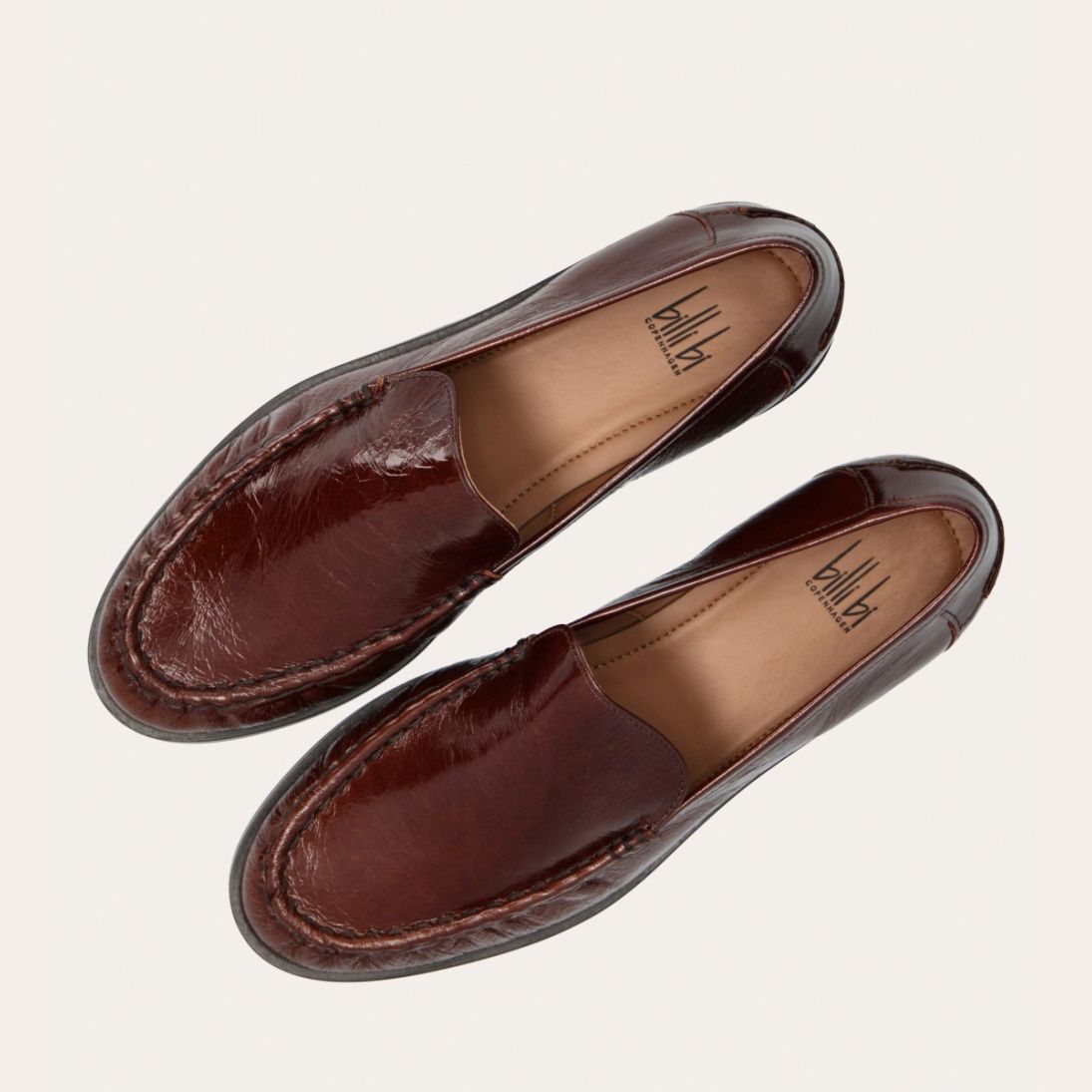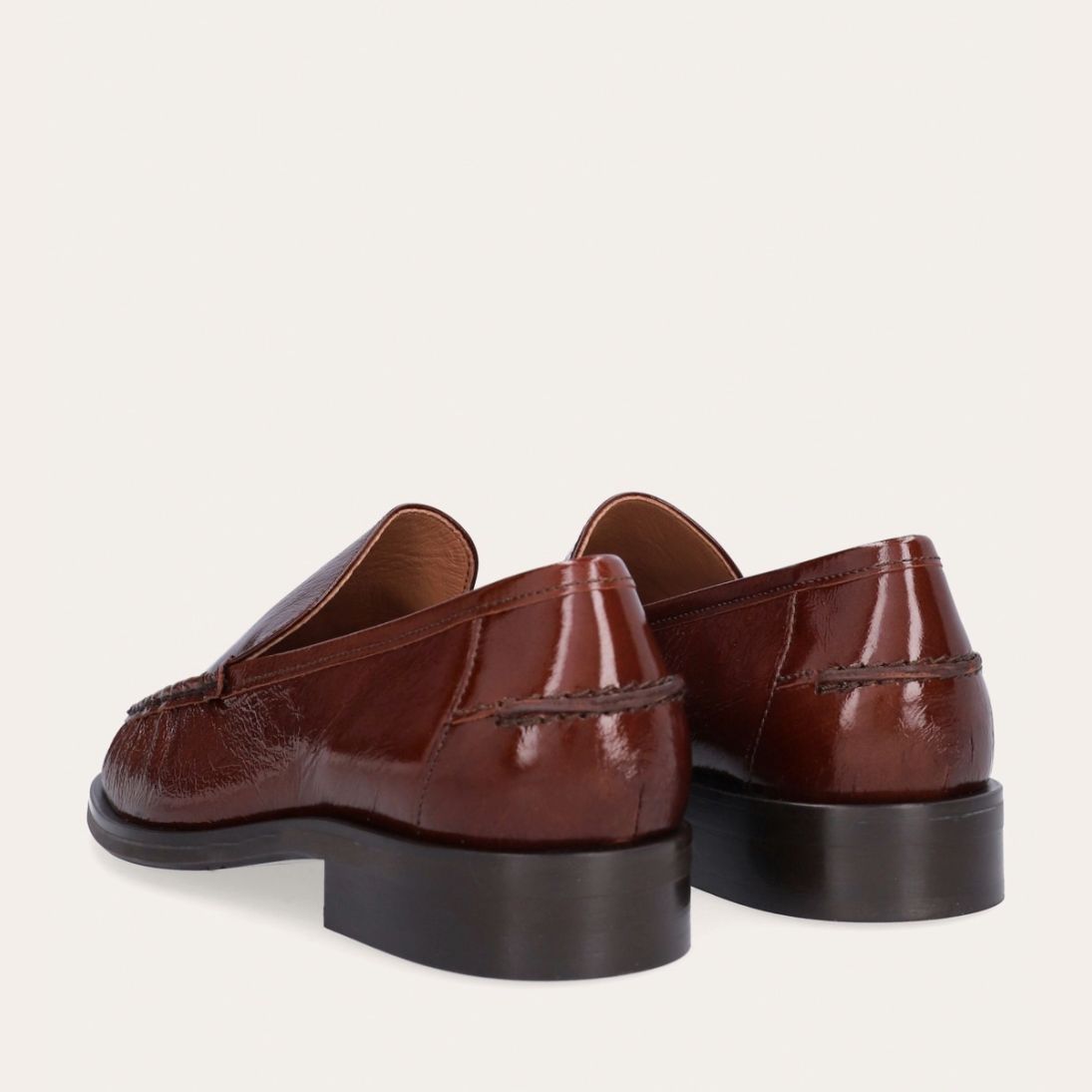 Håndlavet loafer, udført i kastanjebrunt lakeret skind med rund tå. Foran er loaferen dekoreret med en markeret stikning, hvor skindet danner en let rynkning, der understreger den håndværksmæssige finish.