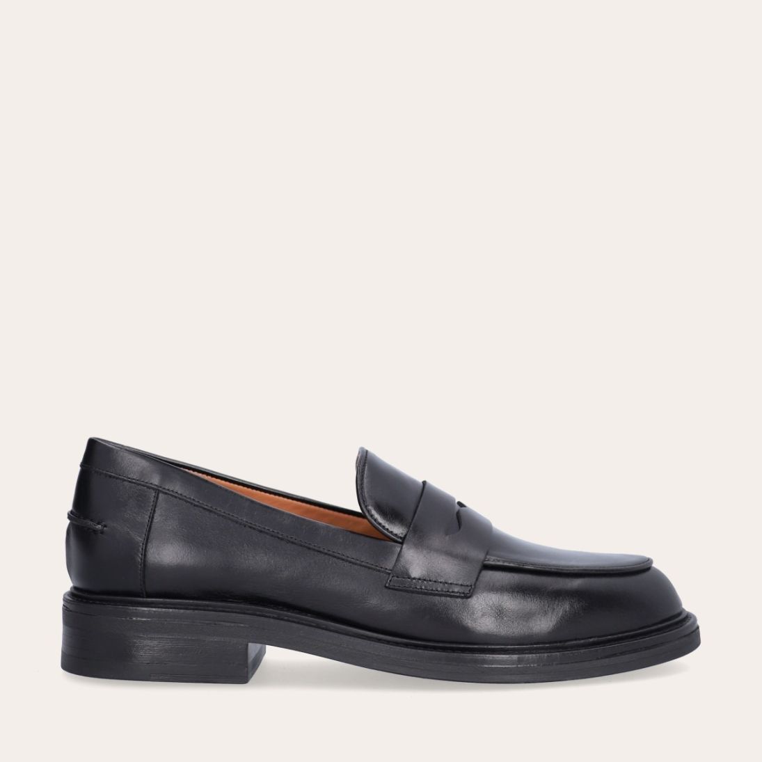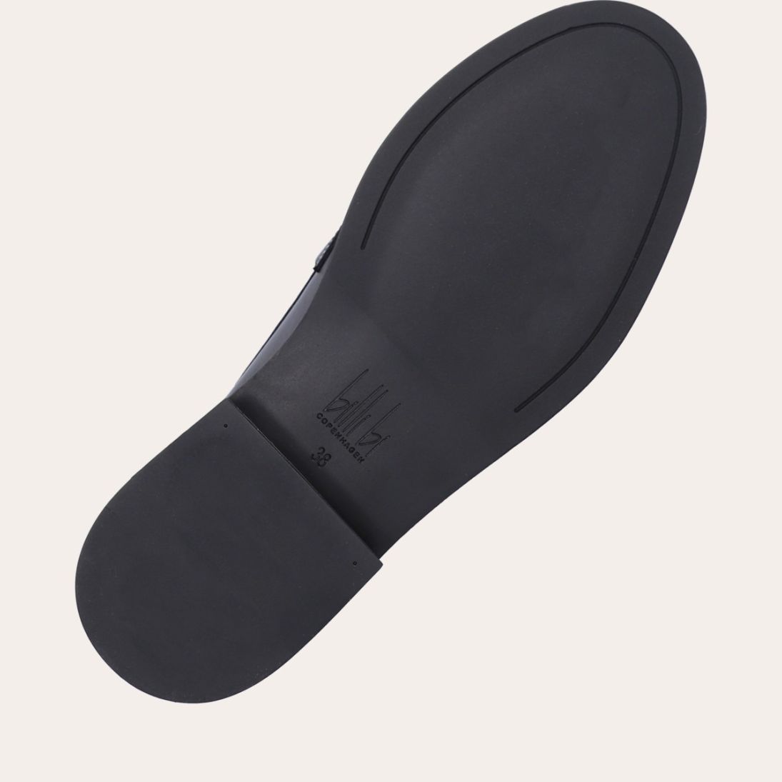 Håndlavet loafer udført i sort glat skind med rund tå samt et dekorativt cut-out henover fronten.