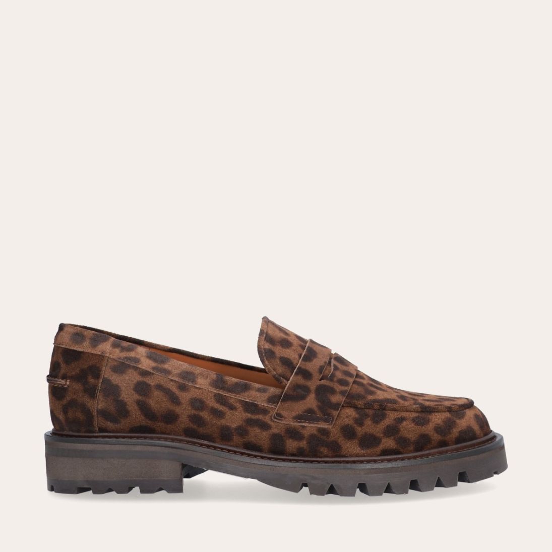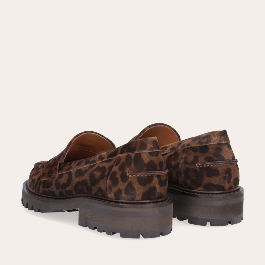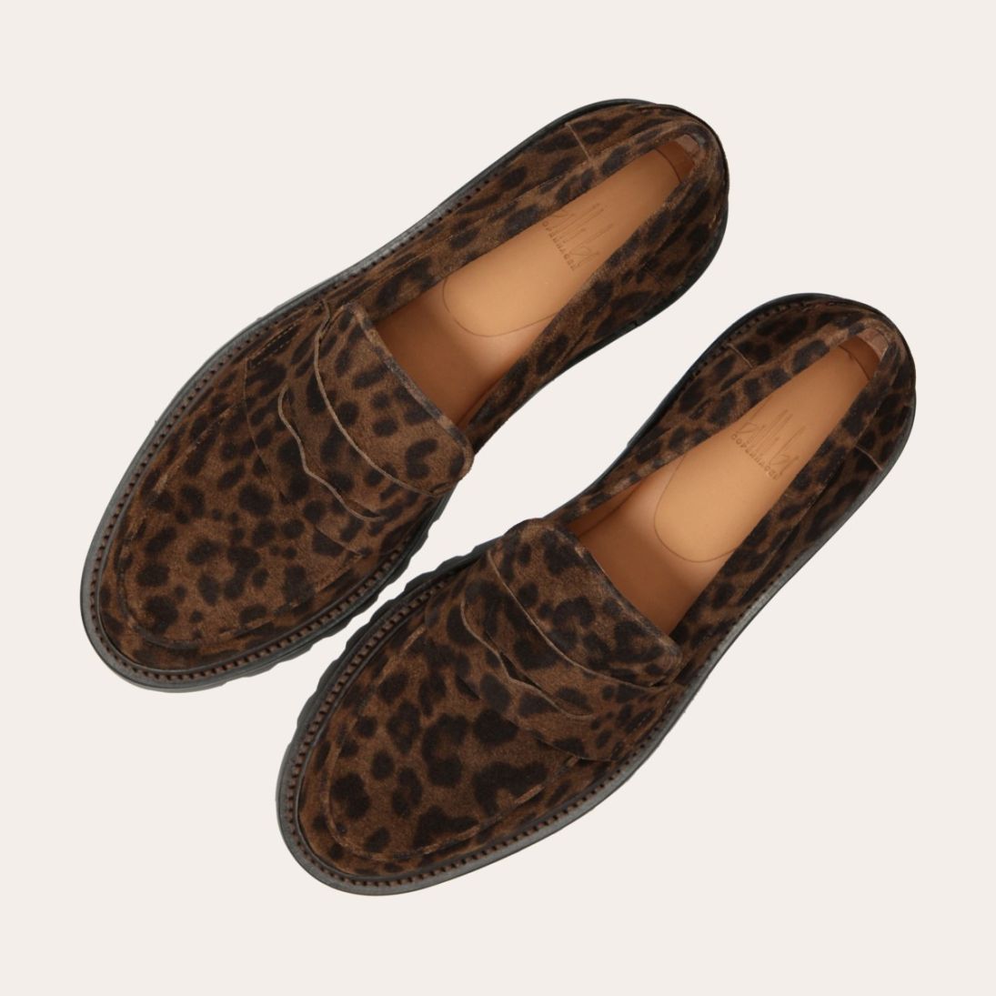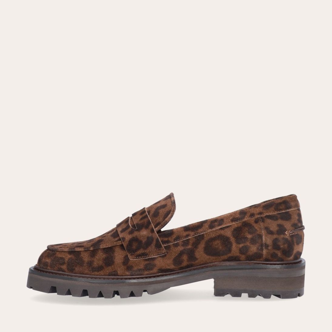 Håndlavet loafer udført i ruskind med leopard mønster og en rund tå. Loaferen er dekoreret med et cut-out fortil. Derudover har loaferen en track sål.