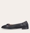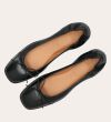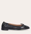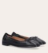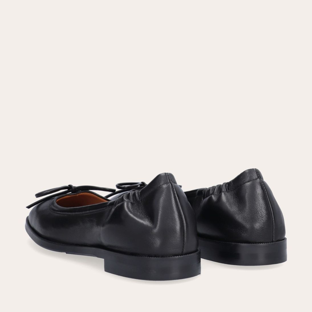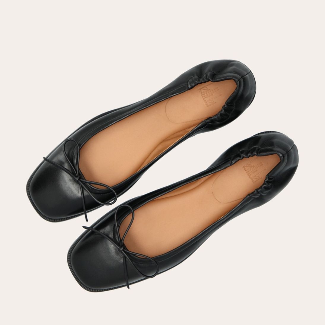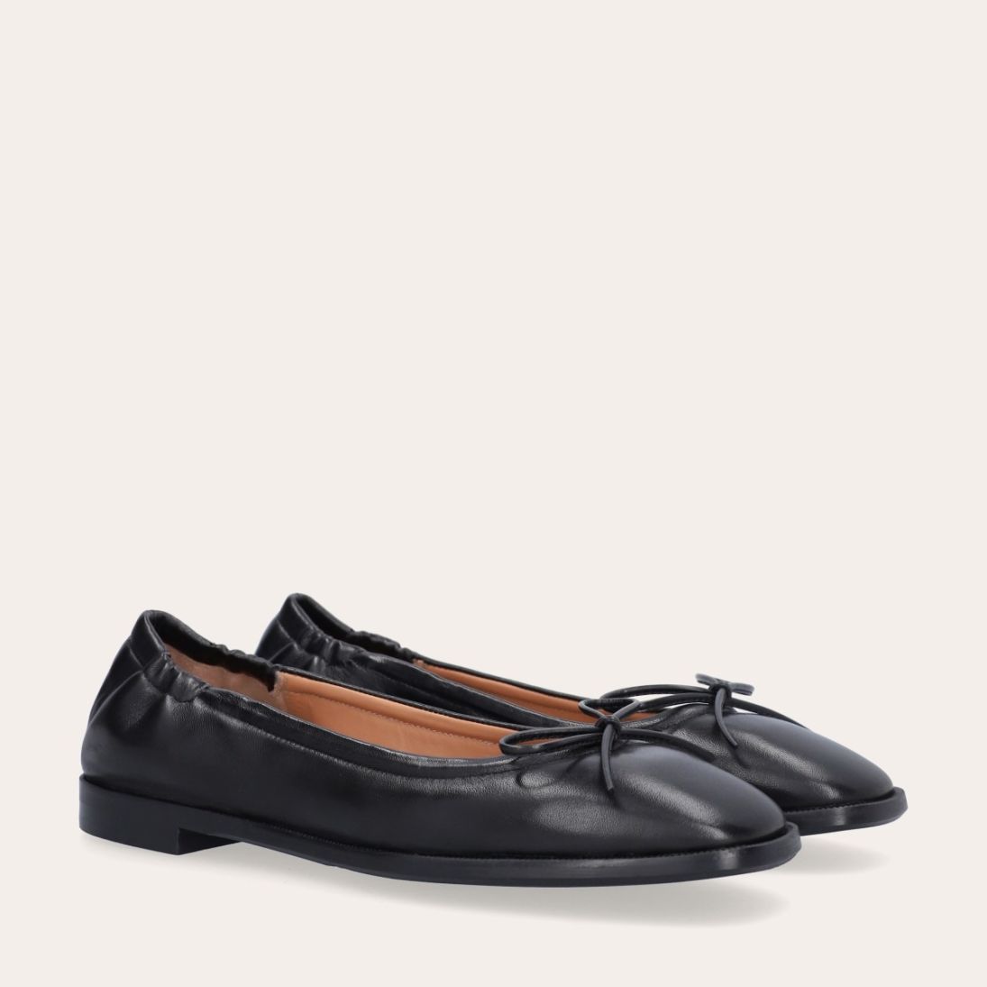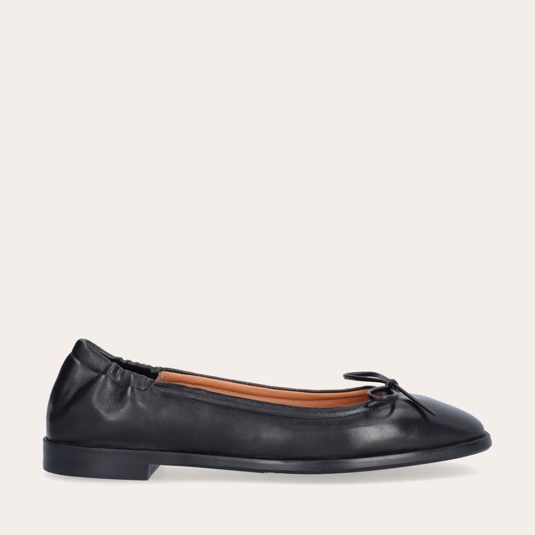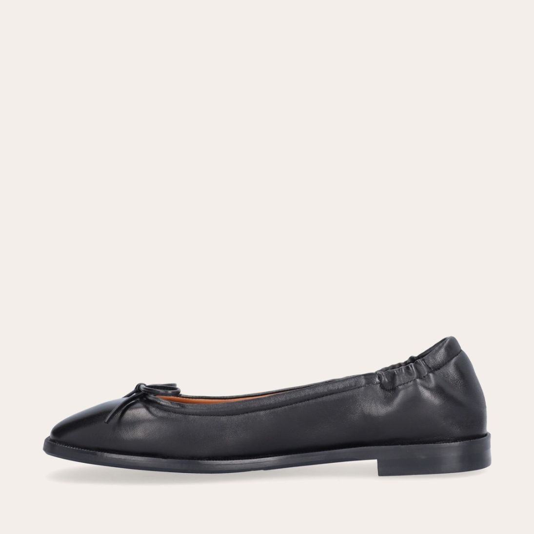 Håndlavet ballerina, udført i sort glat skind med firkantet tå. Ballerinaen har en elastisk hælkappe bagtil, der sikrer en optimal komfort.