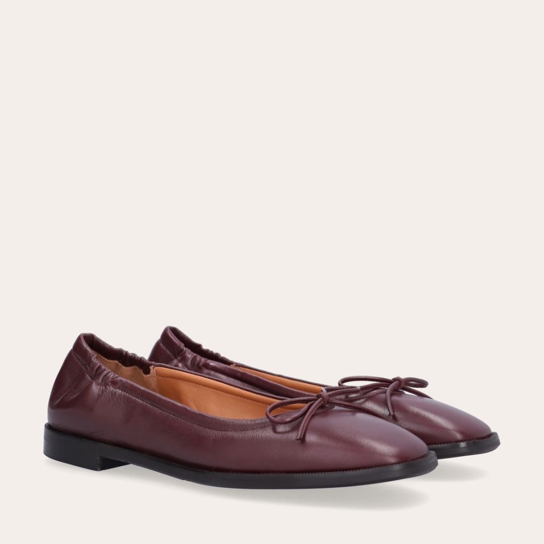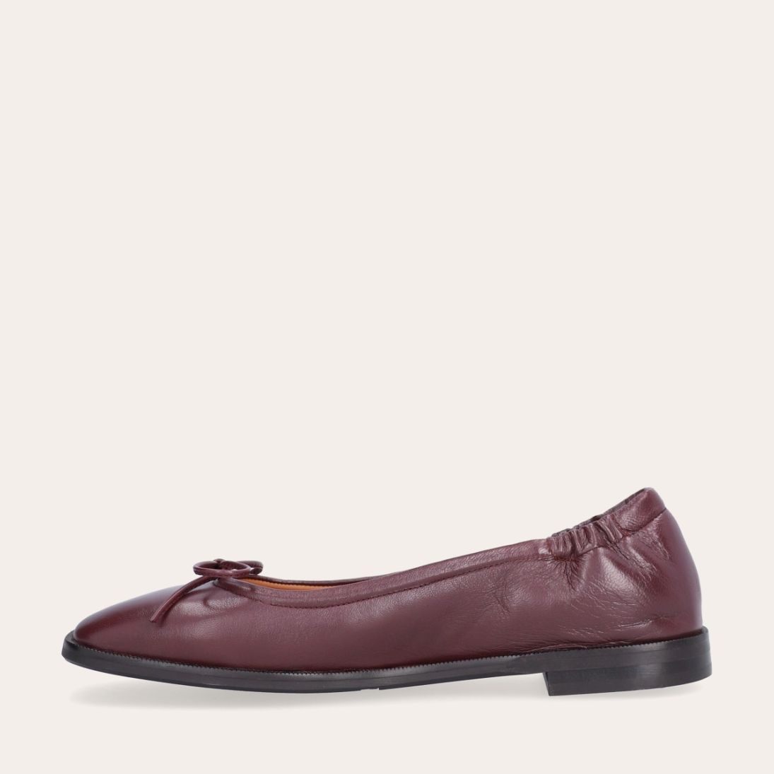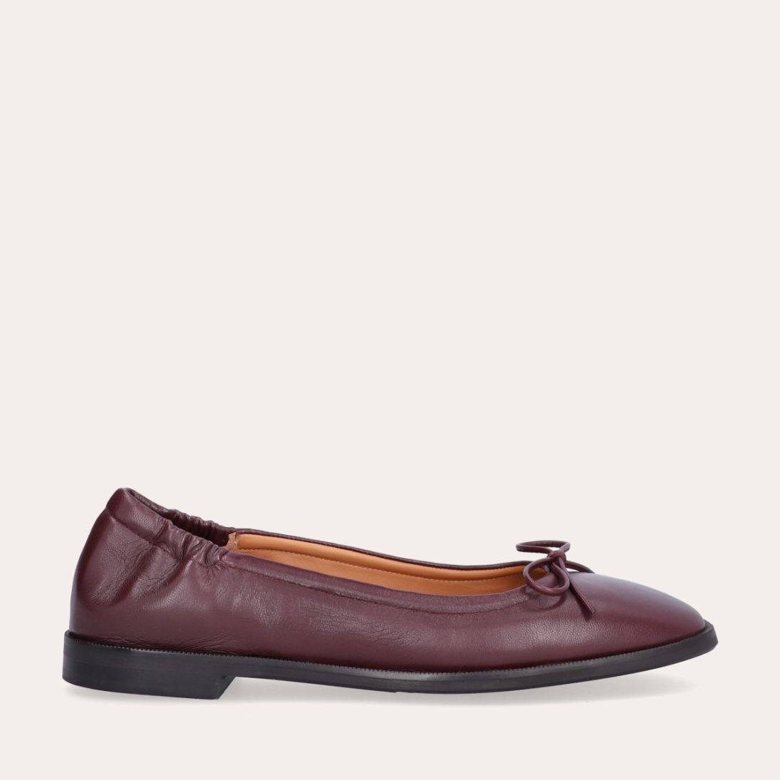 Håndlavet ballerina, udført i aubergine-farvet glat skind med firkantet tå. Ballerinaen har en elastisk hælkappe bagtil, der sikrer en optimal komfort.