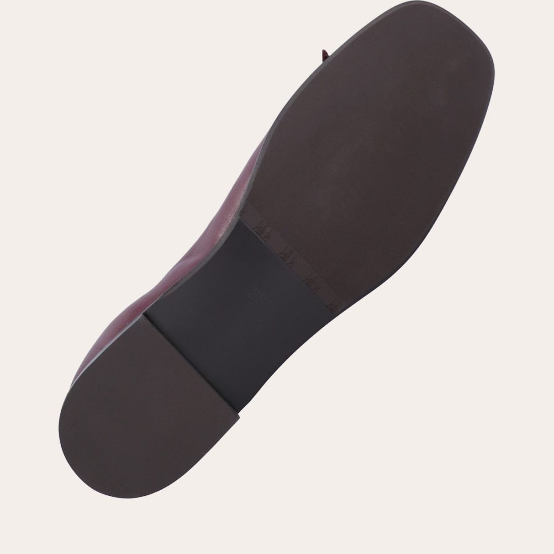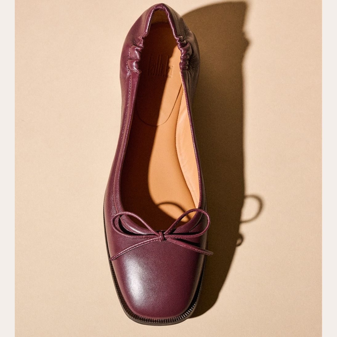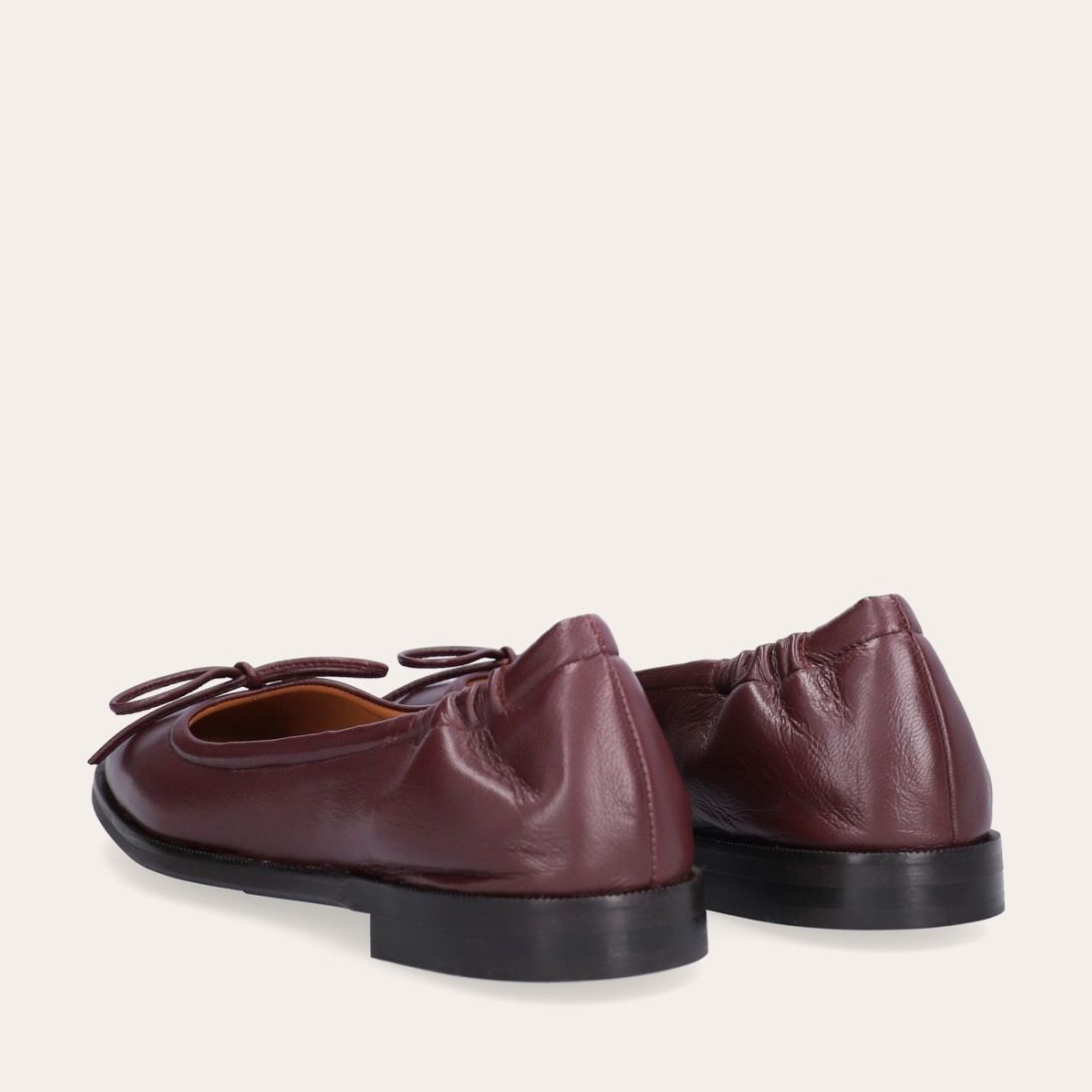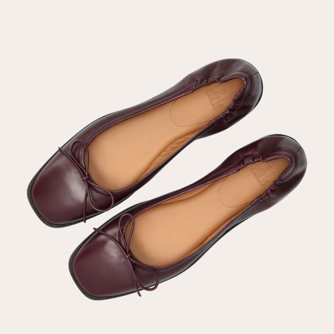 Håndlavet ballerina, udført i aubergine-farvet glat skind med firkantet tå. Ballerinaen har en elastisk hælkappe bagtil, der sikrer en optimal komfort.