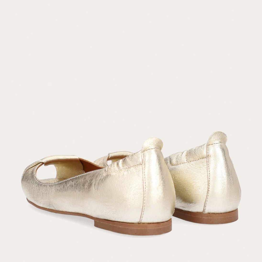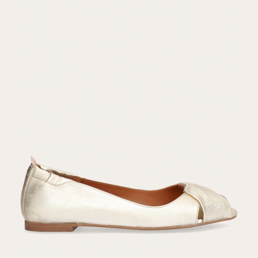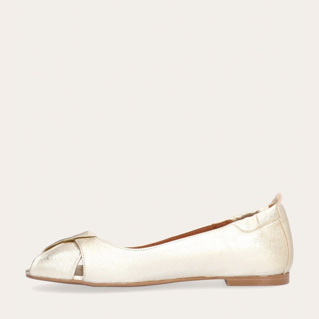 Håndlavet peep-toe ballerina, udført i guldfarvet glat skind med rund tå. Skoen har en dekorativ frontdetalje og en elastisk hælkappe.
