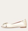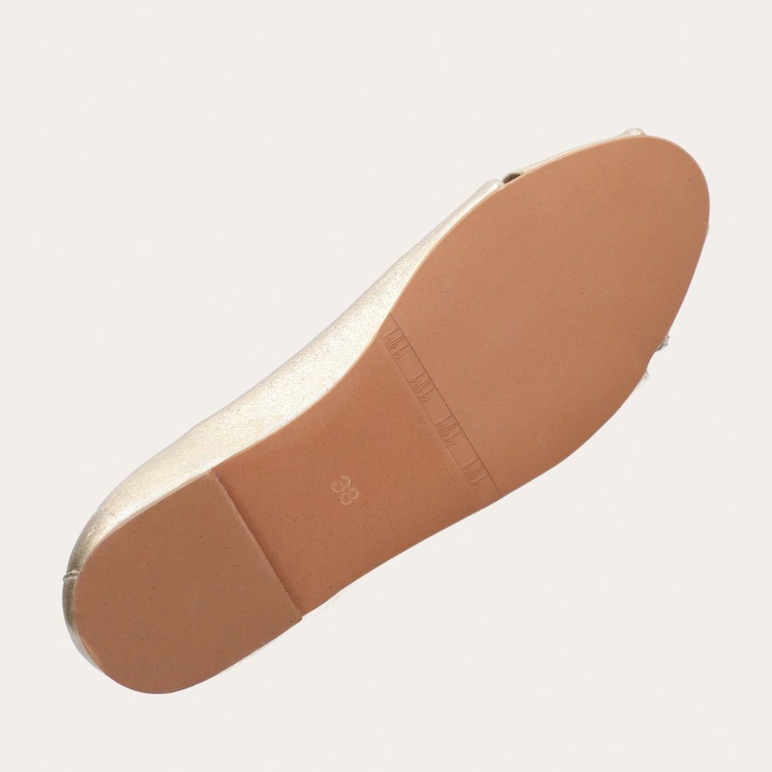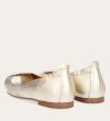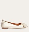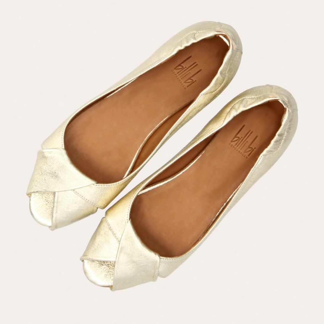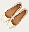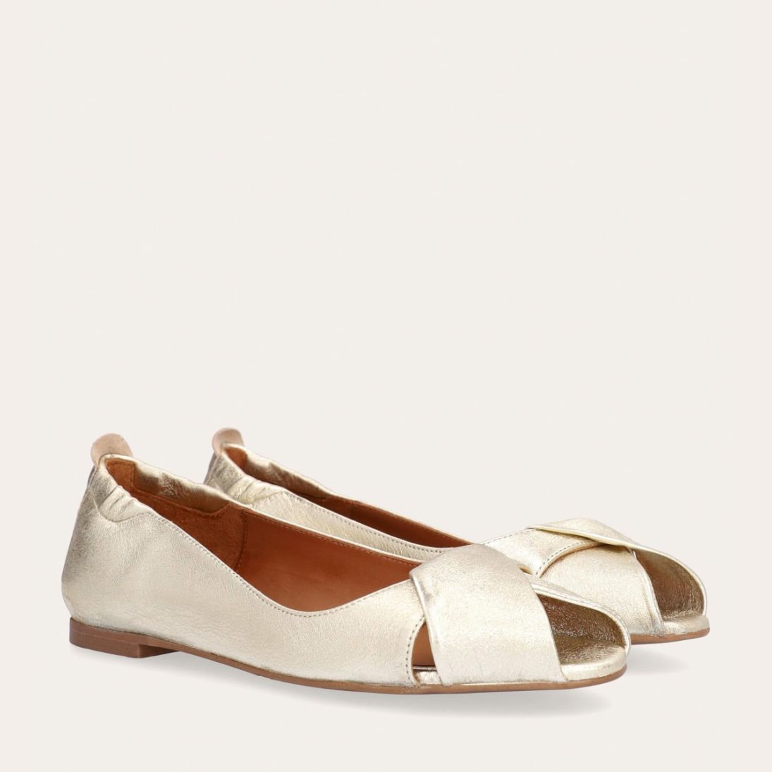 Håndlavet peep-toe ballerina, udført i guldfarvet glat skind med rund tå. Skoen har en dekorativ frontdetalje og en elastisk hælkappe.