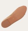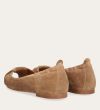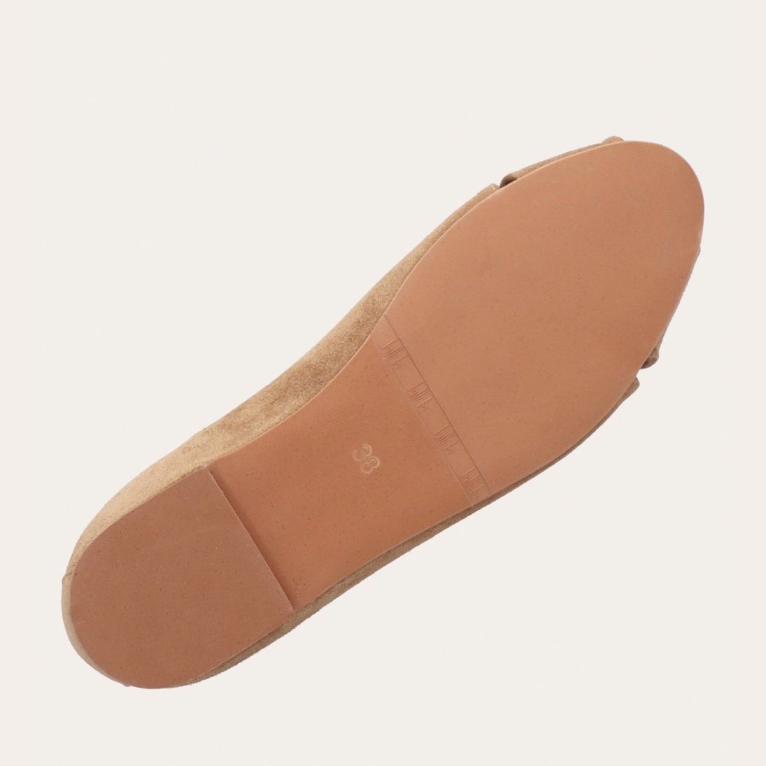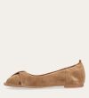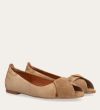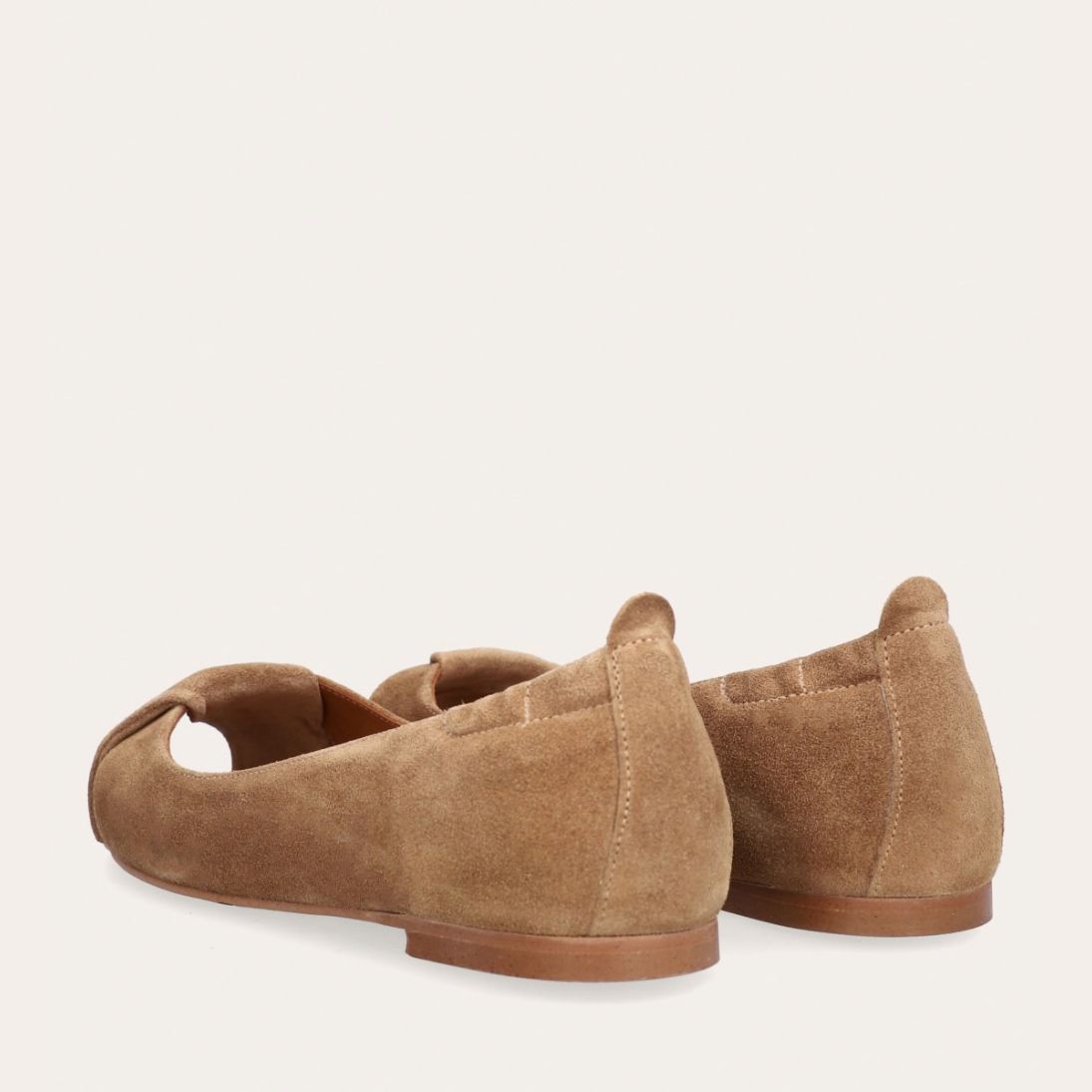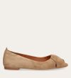 Håndlavet peep-toe ballerina, udført i lysebrunt ruskind med rund tå. Skoen har en dekorativ frontdetalje og en elastisk hælkappe.