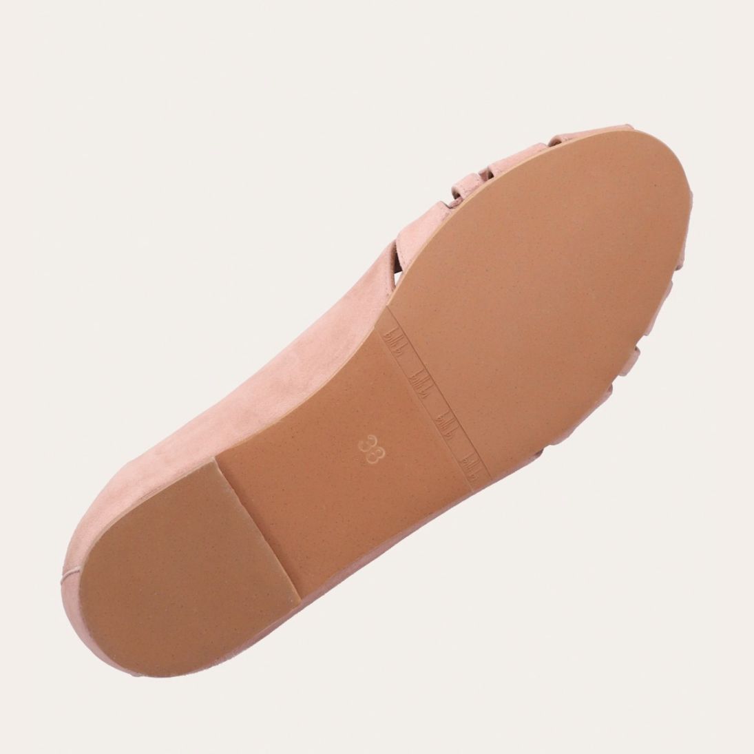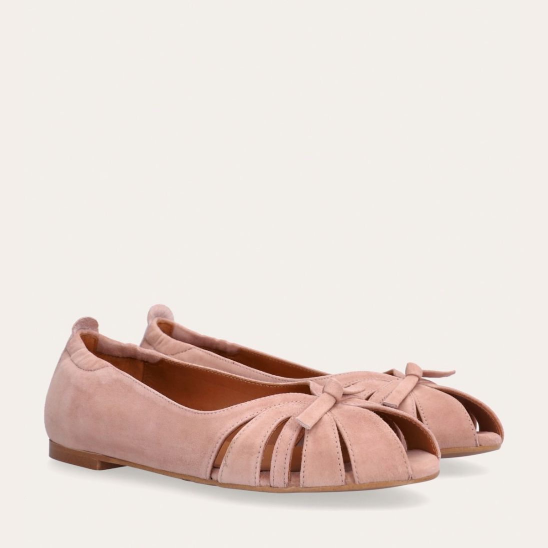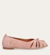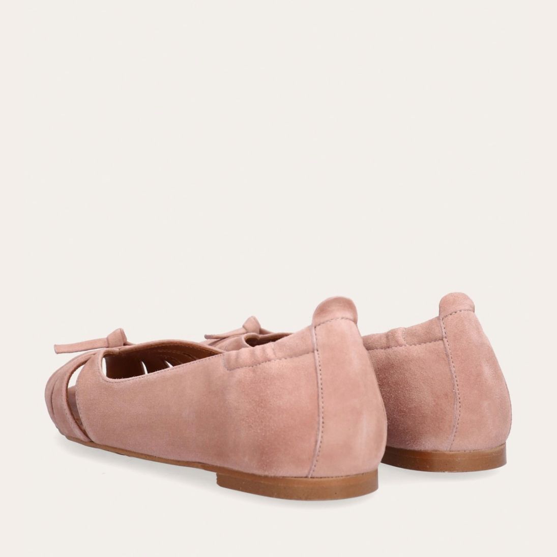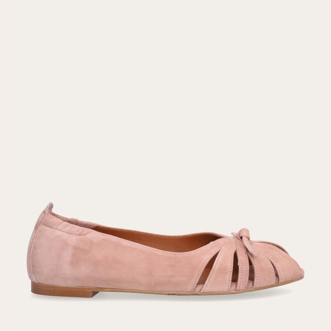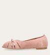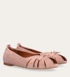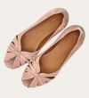 Håndlavet ballerina udført i lyserødt ruskind. Ballerinaen er designet med en dekorativ knude detalje foran, samt en åben-tå.