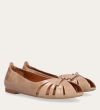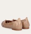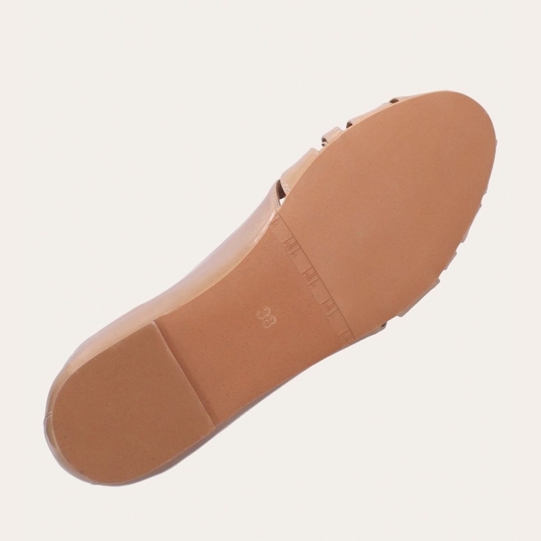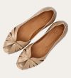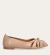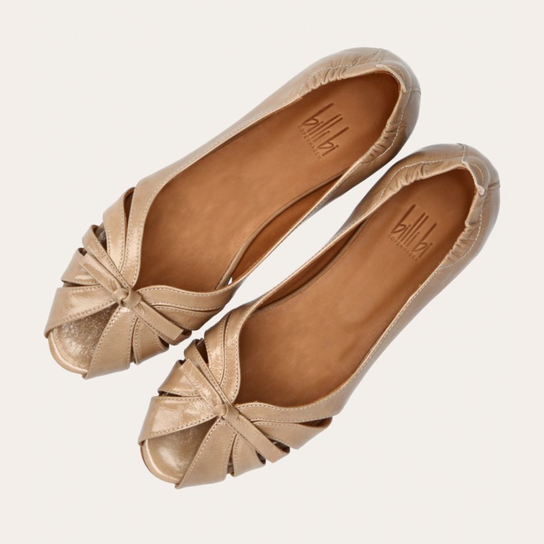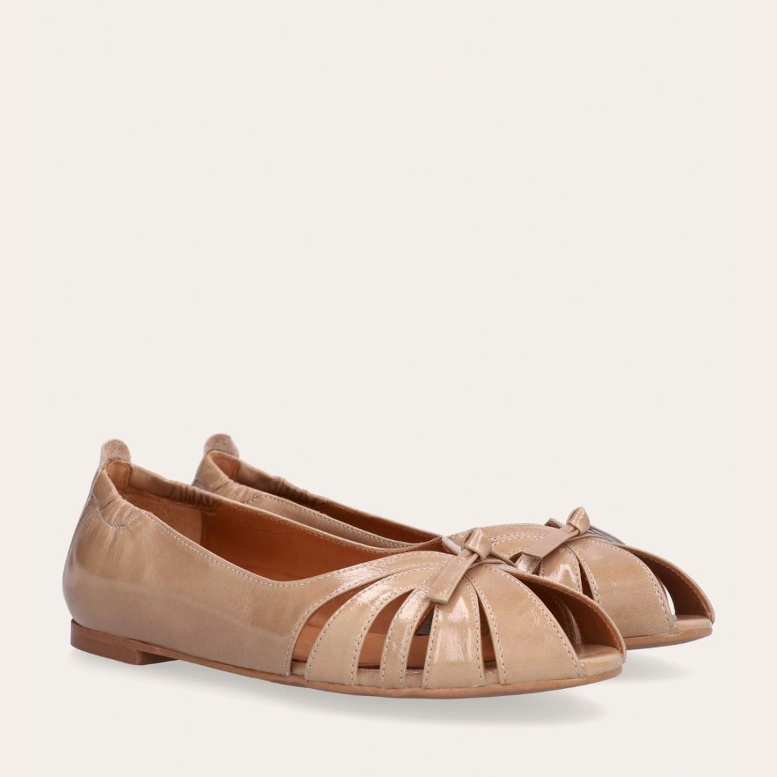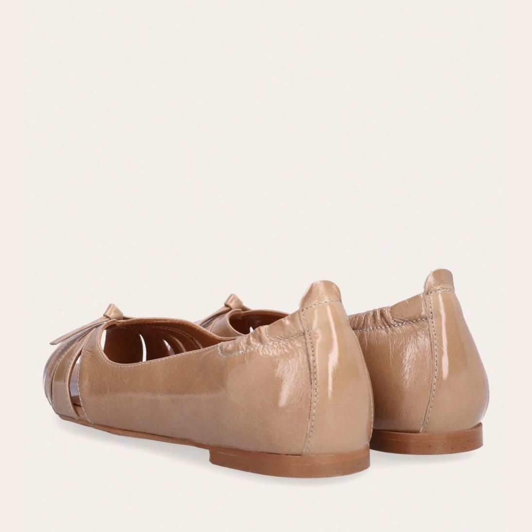 Håndlavet ballerina udført i beige-farvet lakeret skind. Ballerinaen er designet med en dekorativ knude detalje foran, samt en åben-tå.