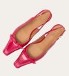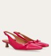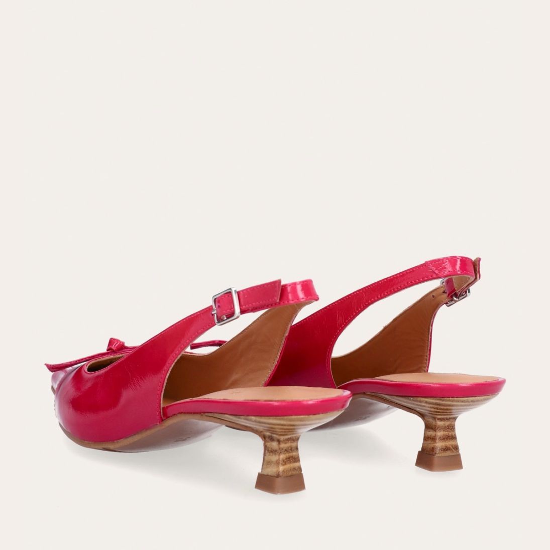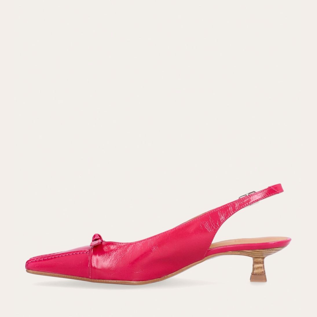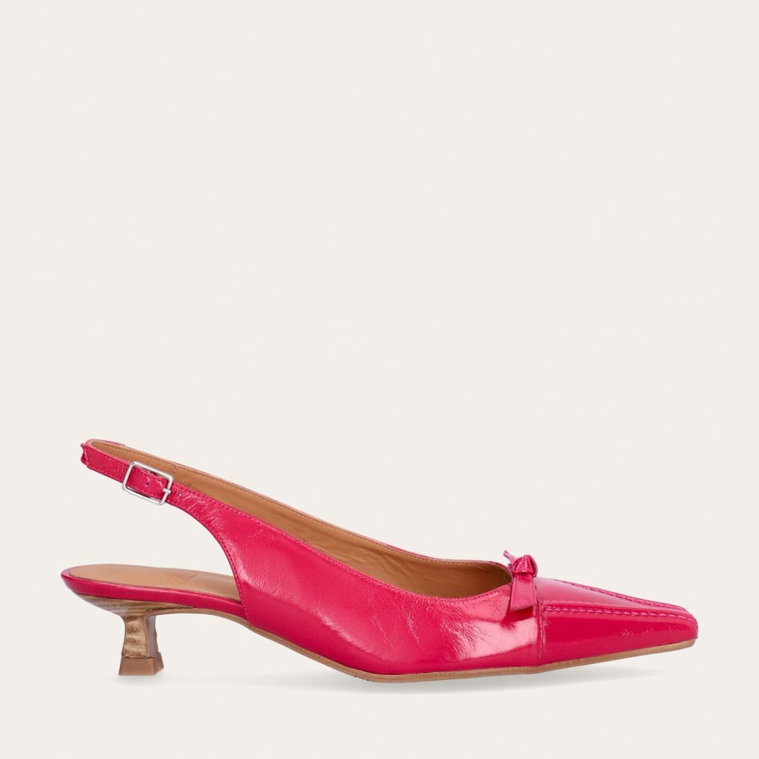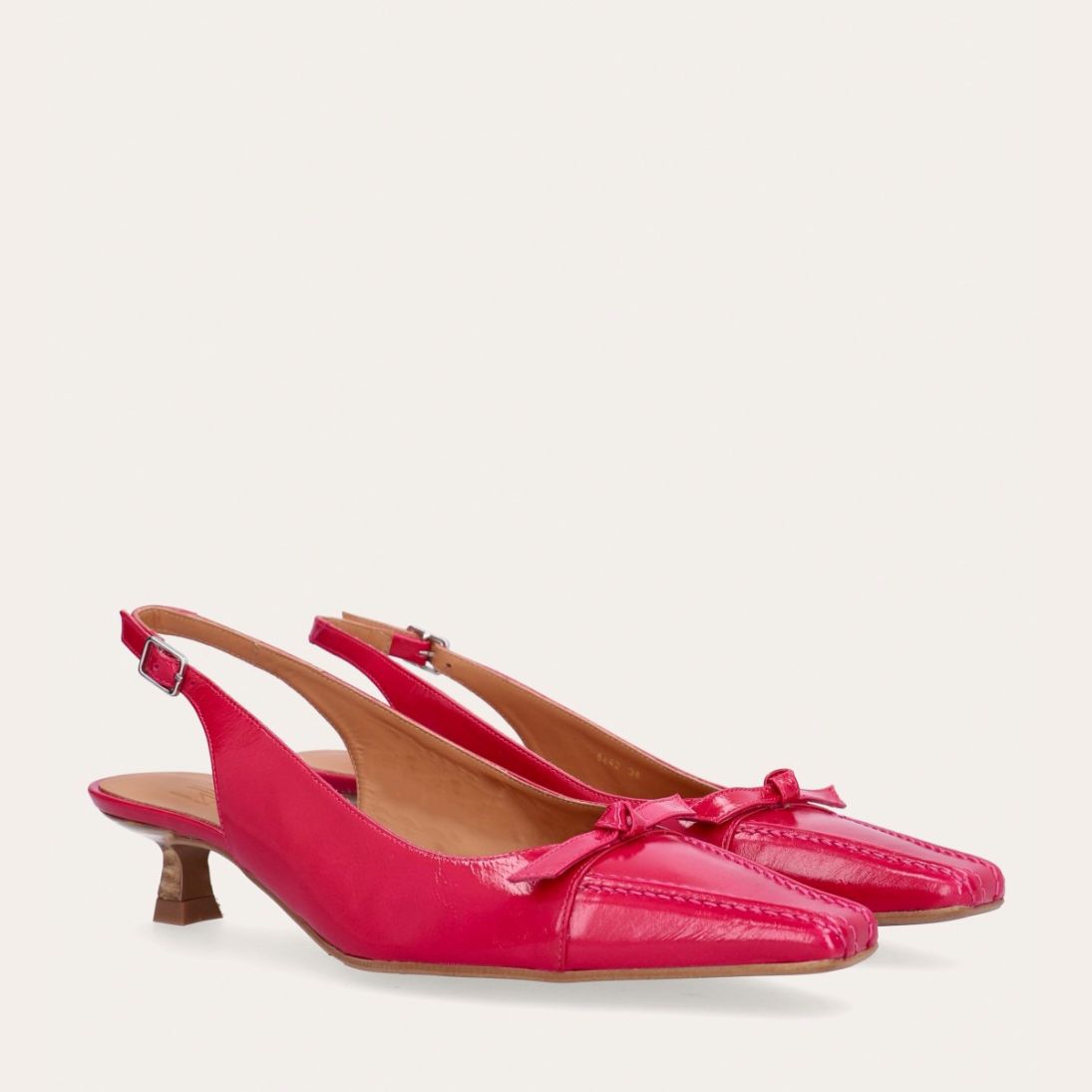 Håndlavet slingback-pump med en spids, firkantet tå, udført i pink lakeret skind. Pumpen er prydet med en elegant sløjfedetalje foran, og remmen lukkes med et lille sølvfarvet spænde. Pumpen har en lav kitten heel, som skaber en raffineret silhuet.
