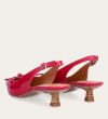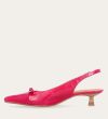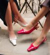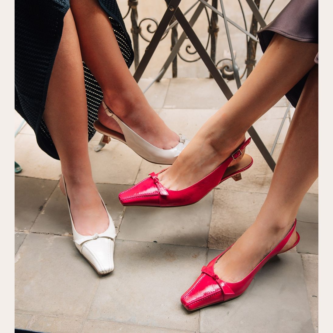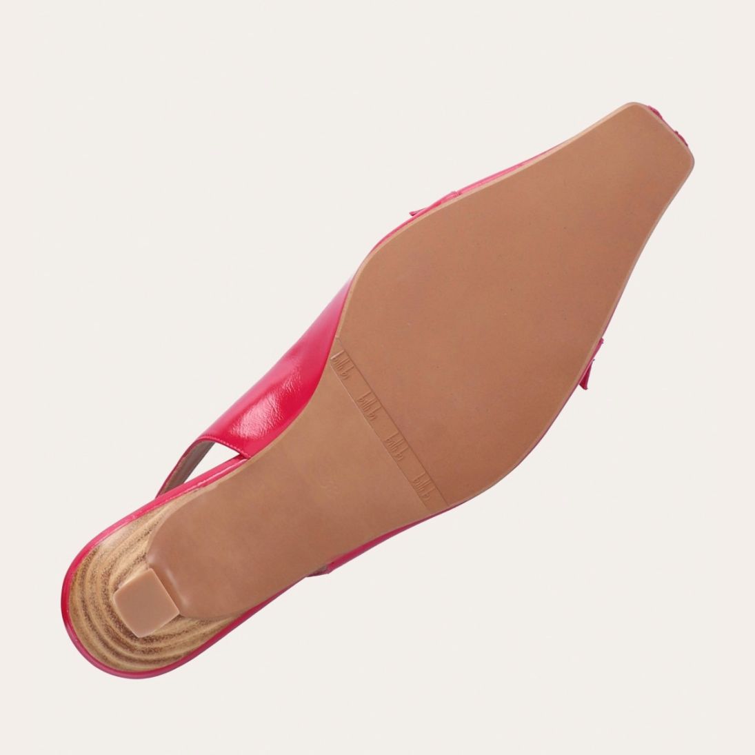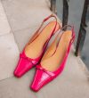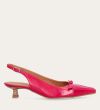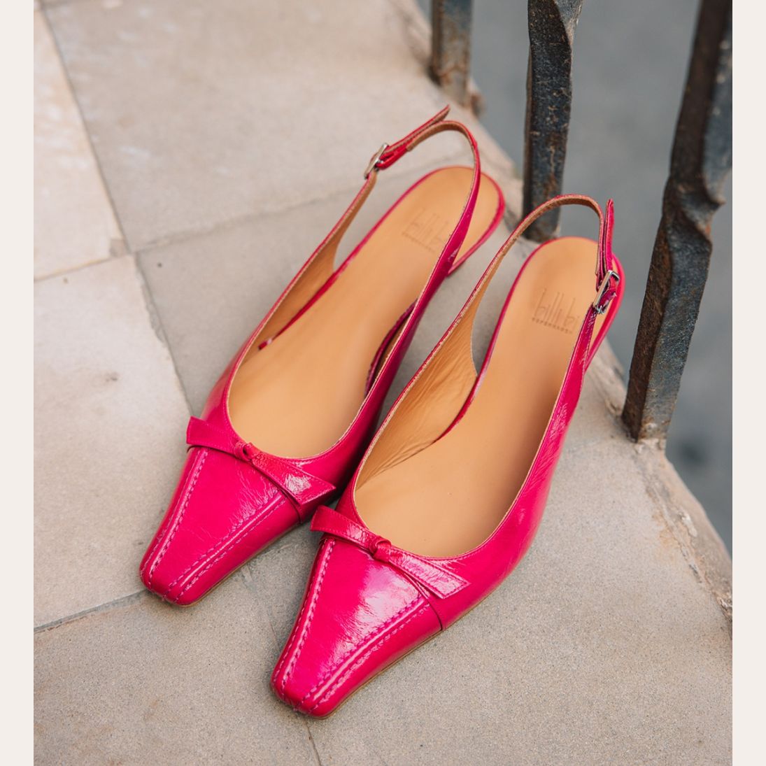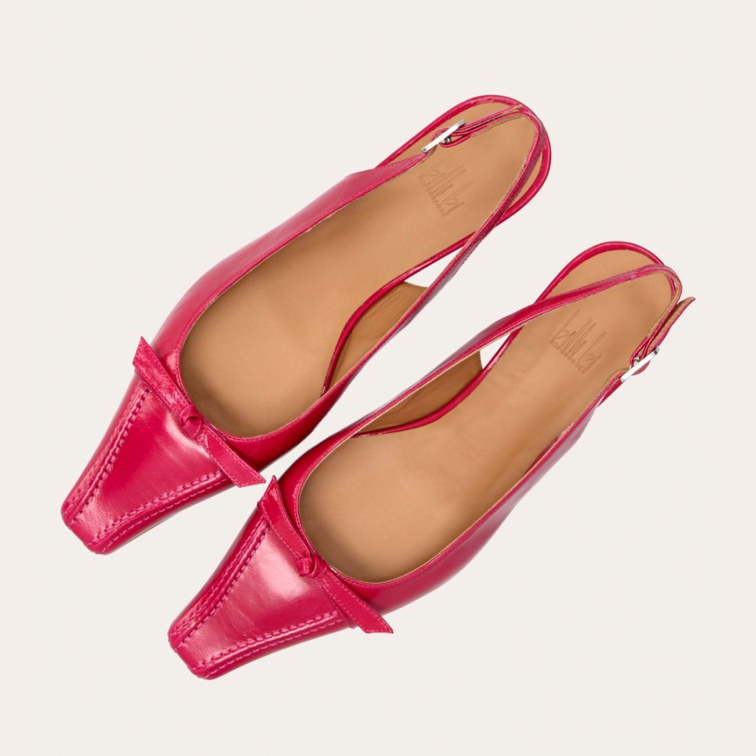 Håndlavet slingback-pump med en spids, firkantet tå, udført i pink lakeret skind. Pumpen er prydet med en elegant sløjfedetalje foran, og remmen lukkes med et lille sølvfarvet spænde. Pumpen har en lav kitten heel, som skaber en raffineret silhuet.