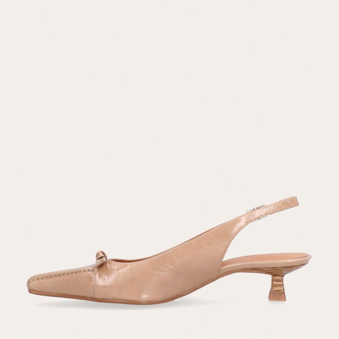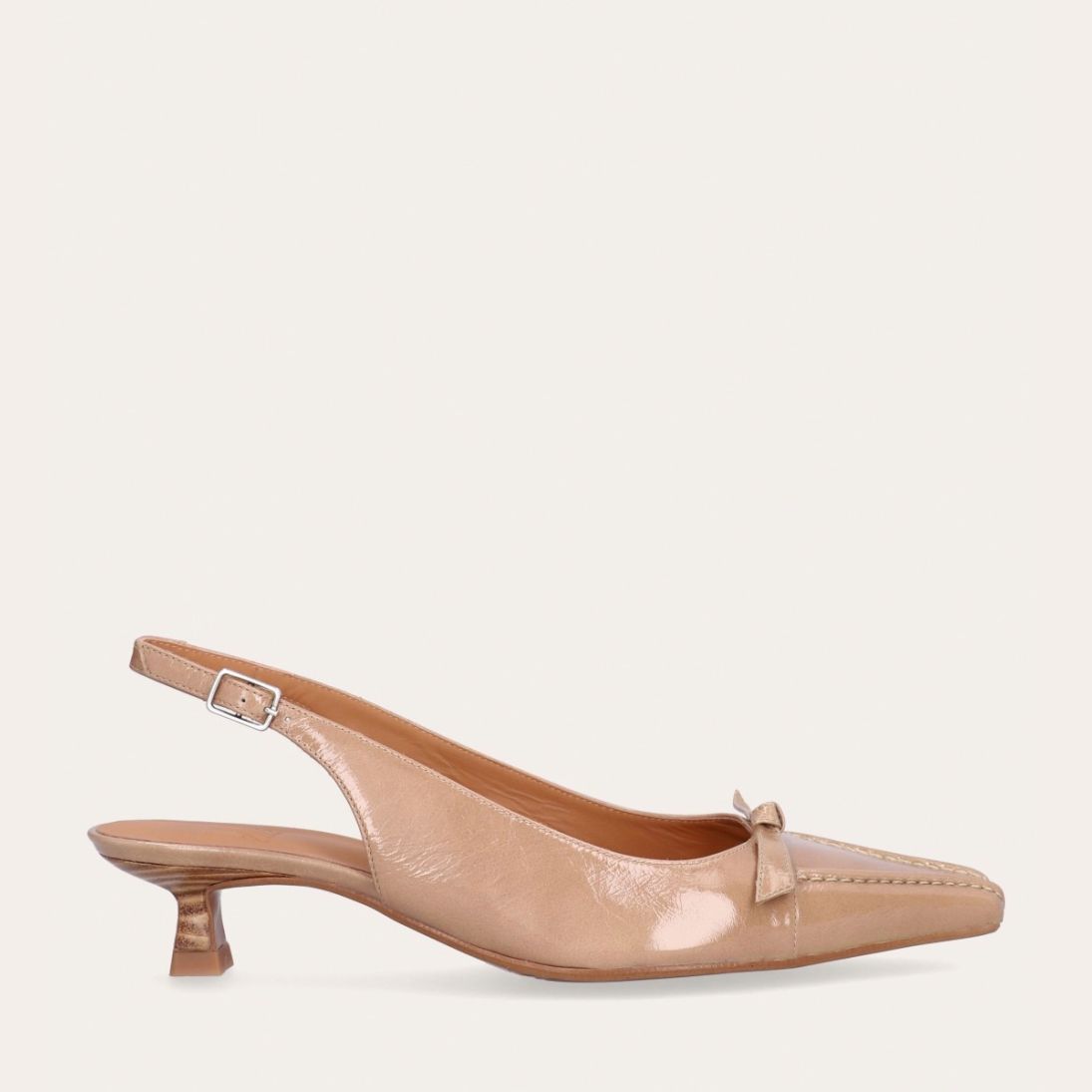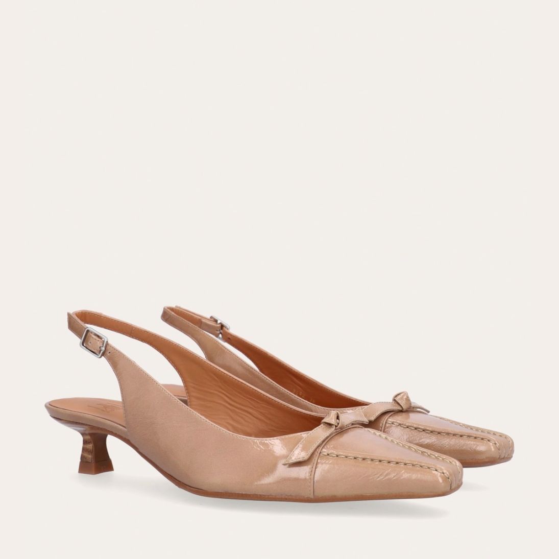 Håndlavet slingback-pump med en spids, firkantet tå, udført i beige lakeret skind. Pumpen er prydet med en elegant sløjfedetalje foran, og remmen lukkes med et lille sølvfarvet spænde. Pumpen har en lav kitten heel, som skaber en raffineret silhuet.