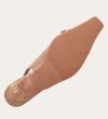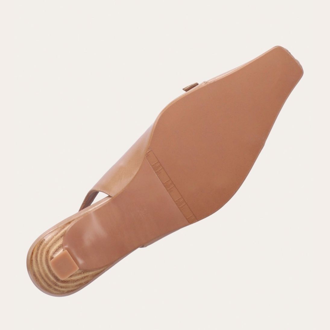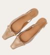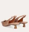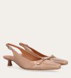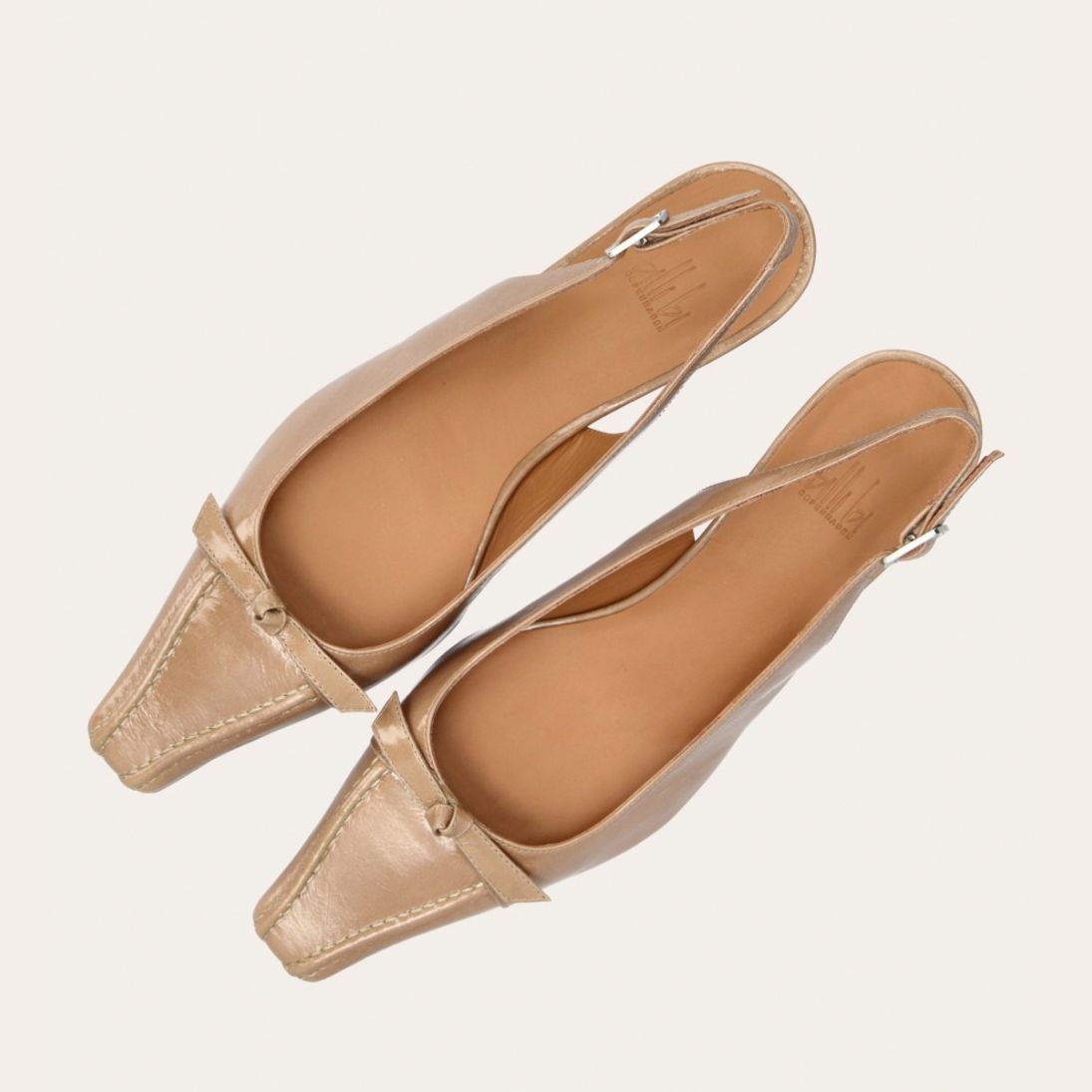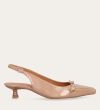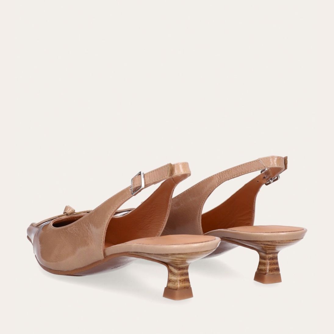 Håndlavet slingback-pump med en spids, firkantet tå, udført i beige lakeret skind. Pumpen er prydet med en elegant sløjfedetalje foran, og remmen lukkes med et lille sølvfarvet spænde. Pumpen har en lav kitten heel, som skaber en raffineret silhuet.