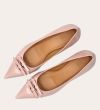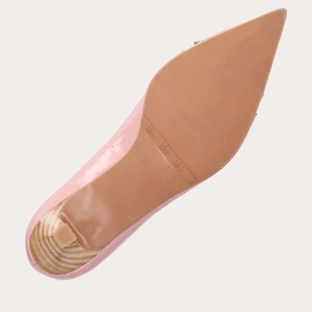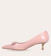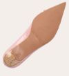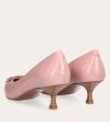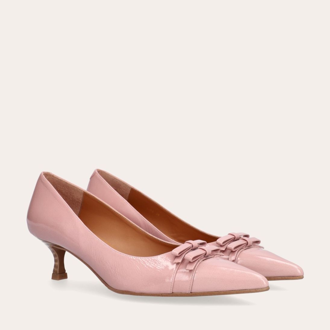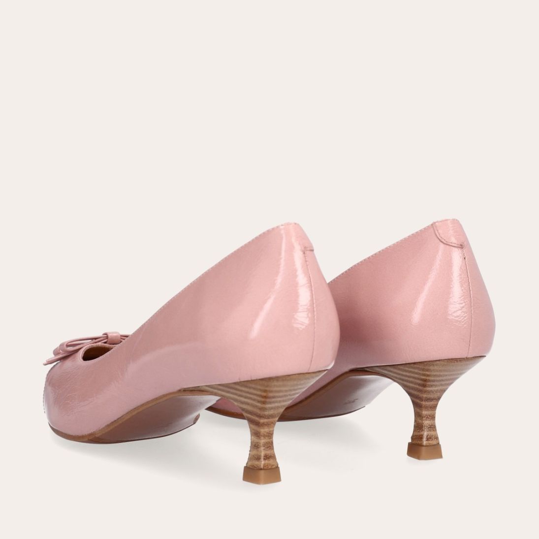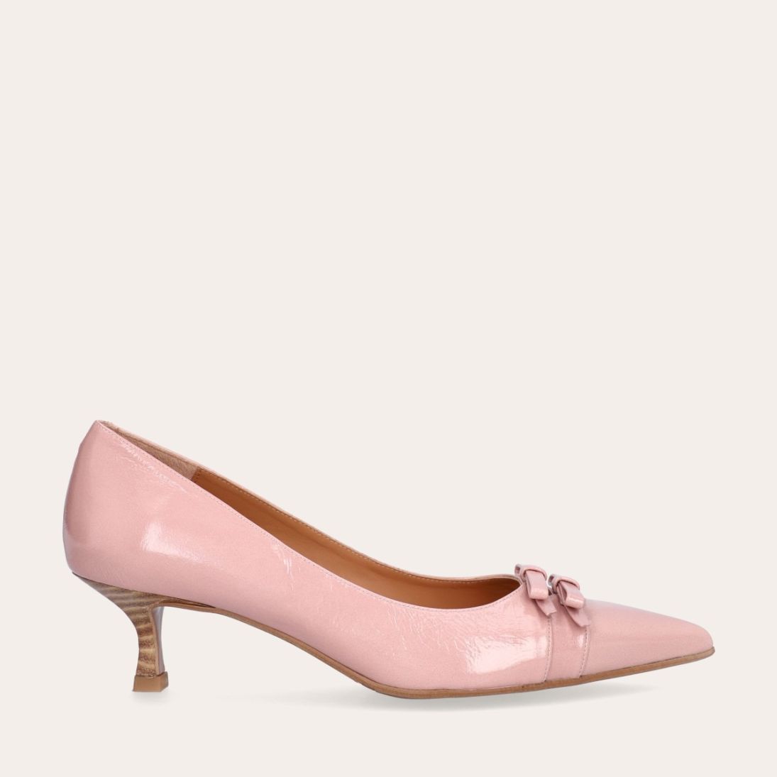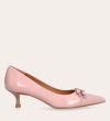 Håndlavet pump, udført i lyserødt lakeret skind med spids tå. Foran er pumpen dekoreret med to små sløjfer, også i lakeret skind. Pumpen har en elegant kitten heel.