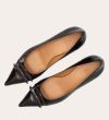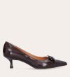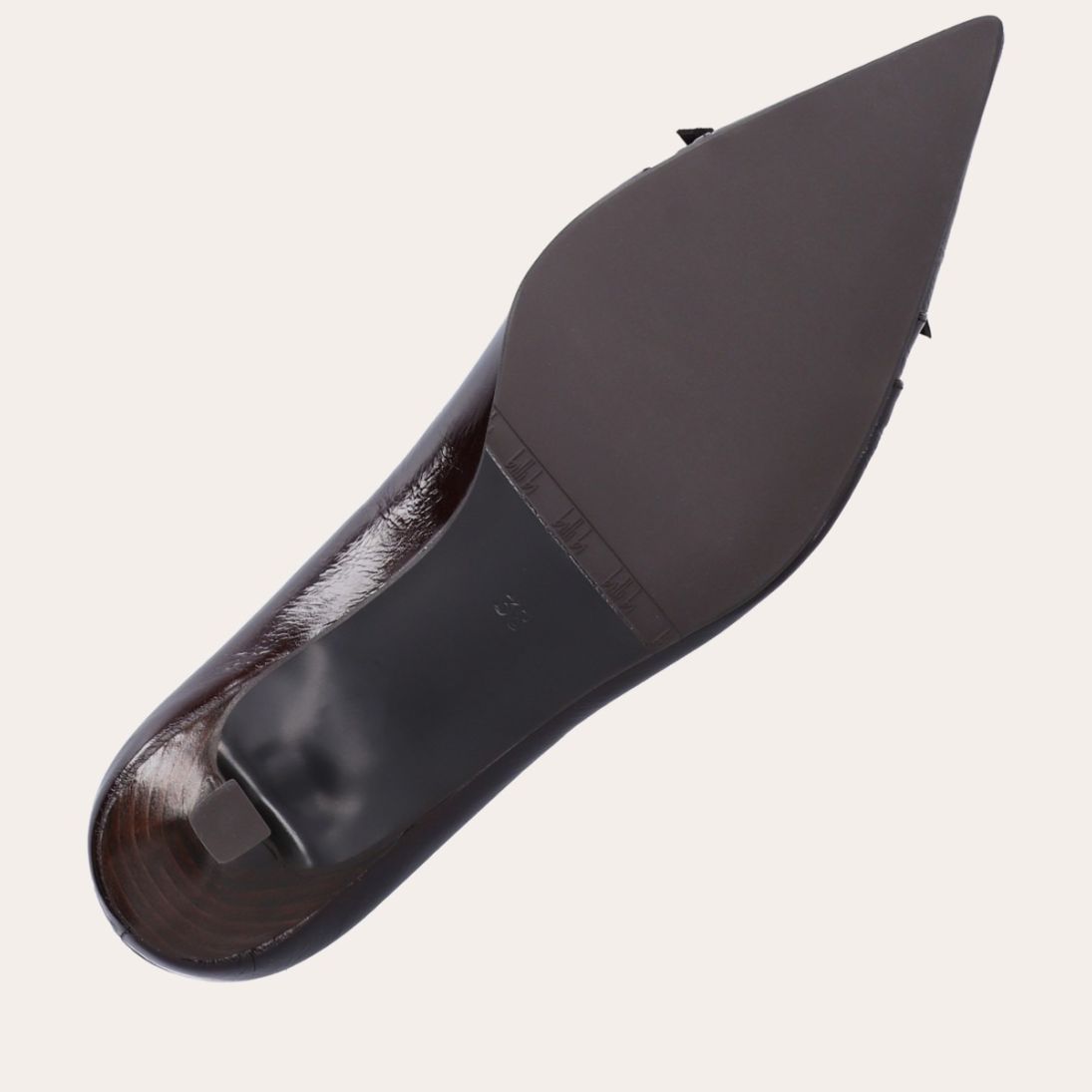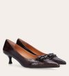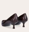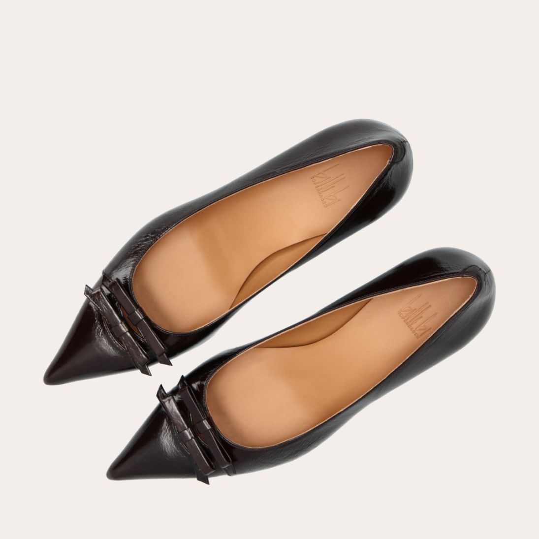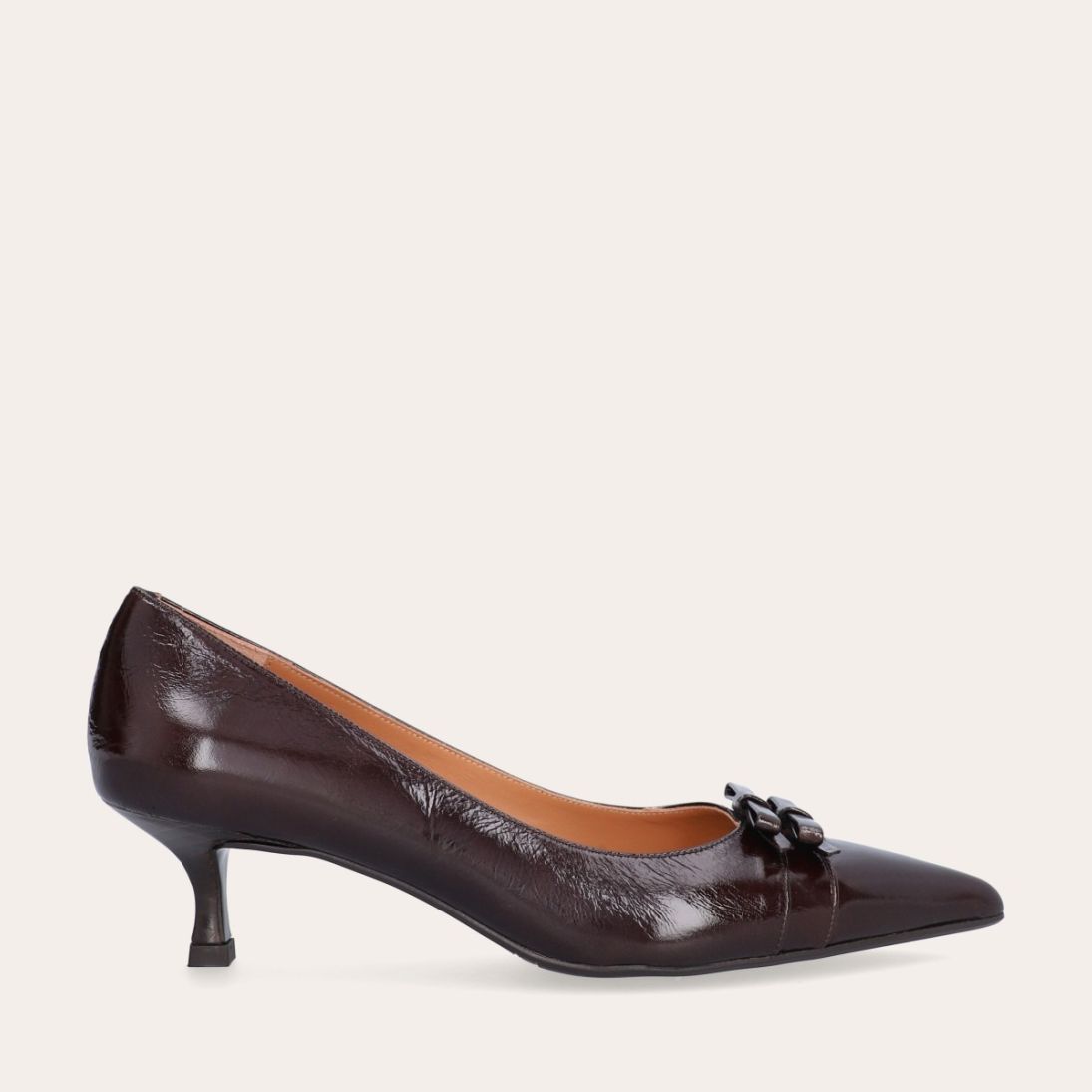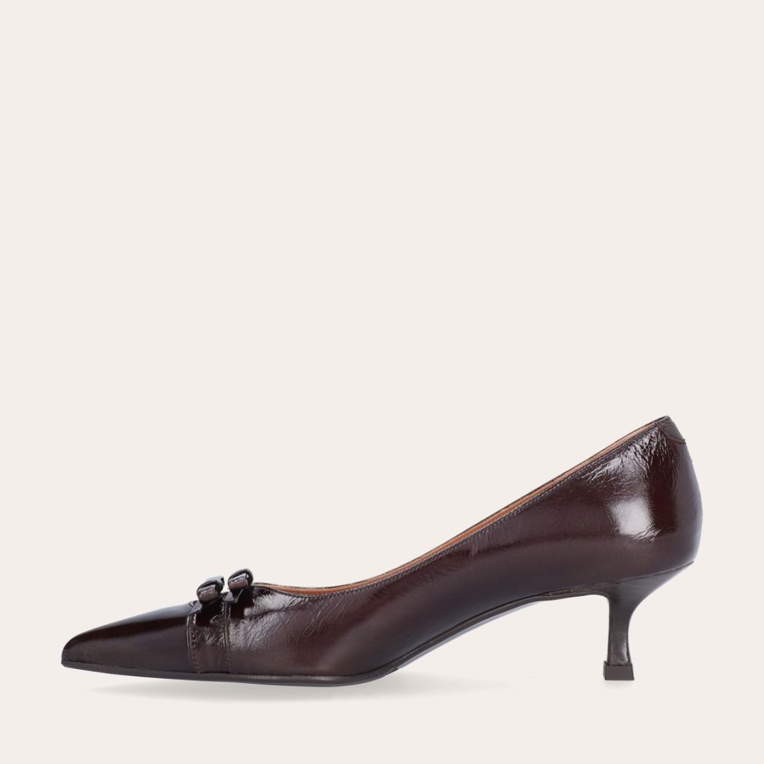 Håndlavet pump, udført i brunt lakeret skind med spids tå. Foran er pumpen dekoreret med to små sløjfer, også i lakeret skind. Pumpen har en elegant kitten heel.