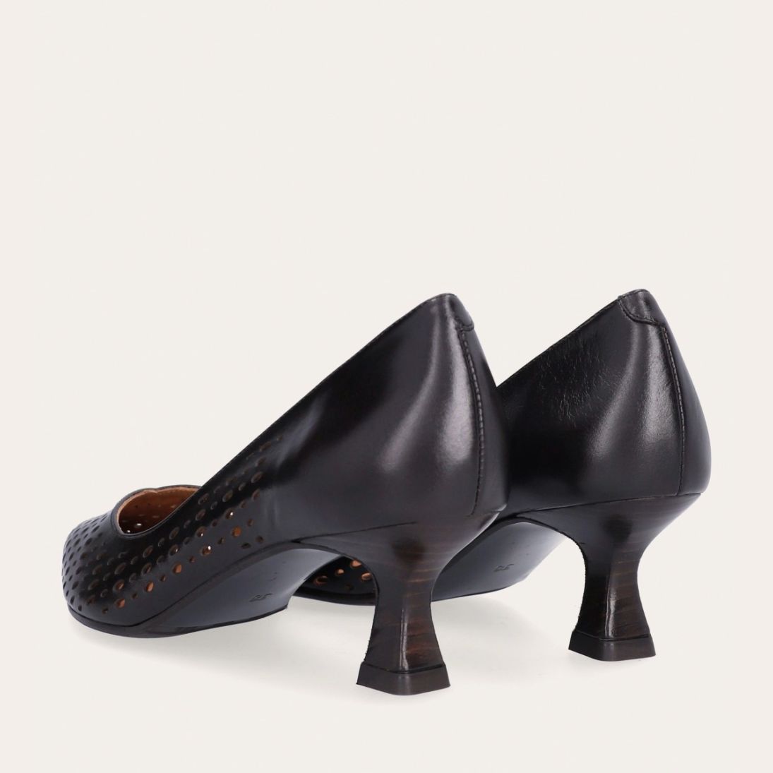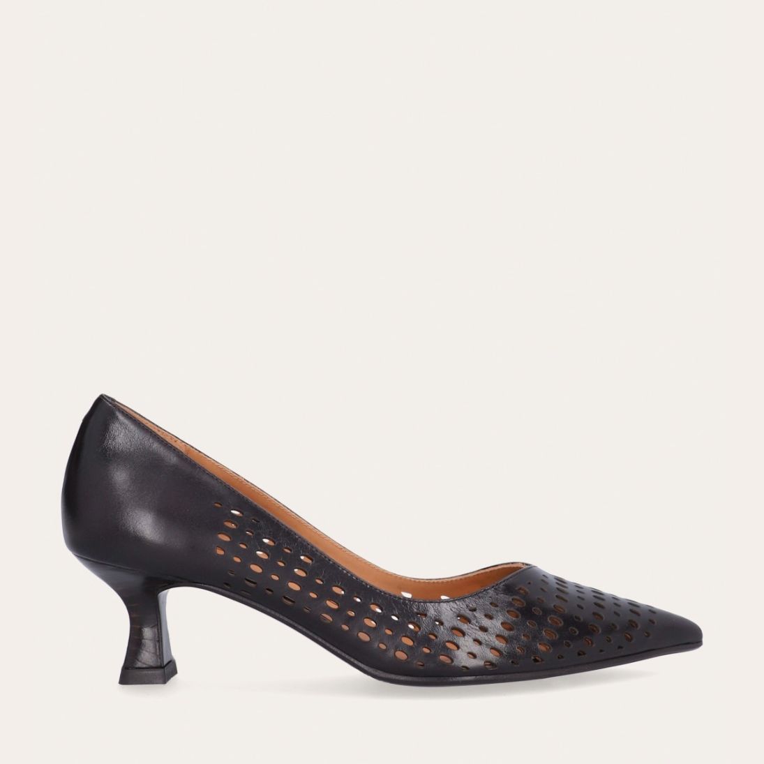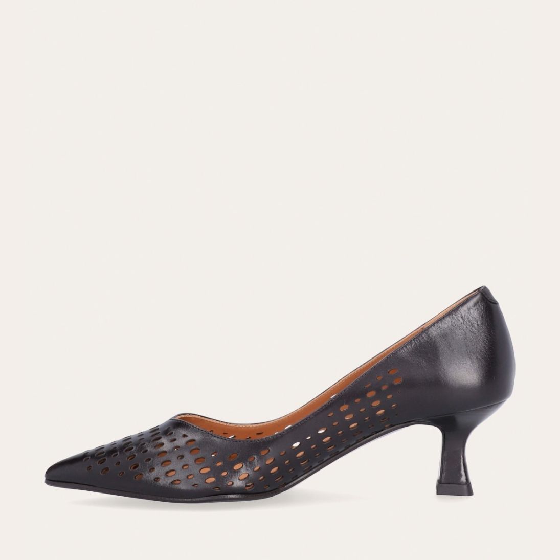 Håndlavet pump med spids tå, udført i mørkebrunt glat skind. Pumpen har et elegant perforeret mønster i skindet og en elegant kitten heel.