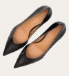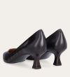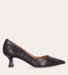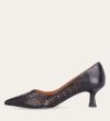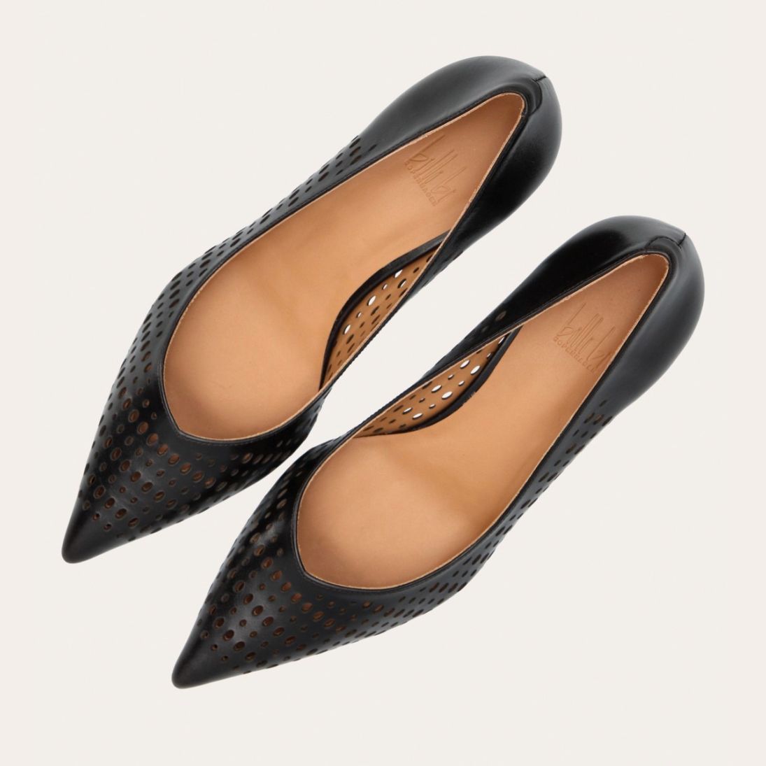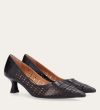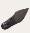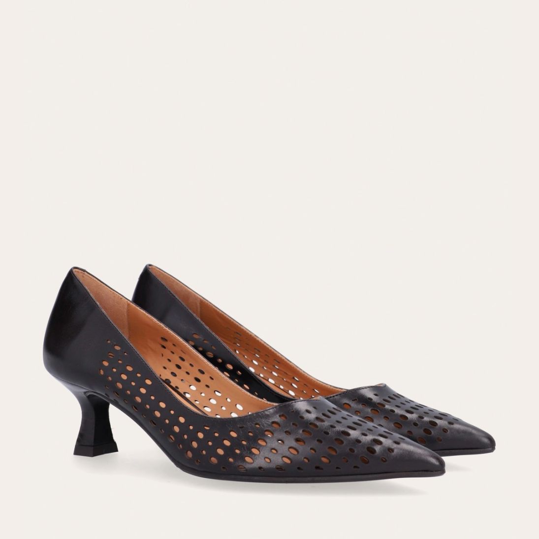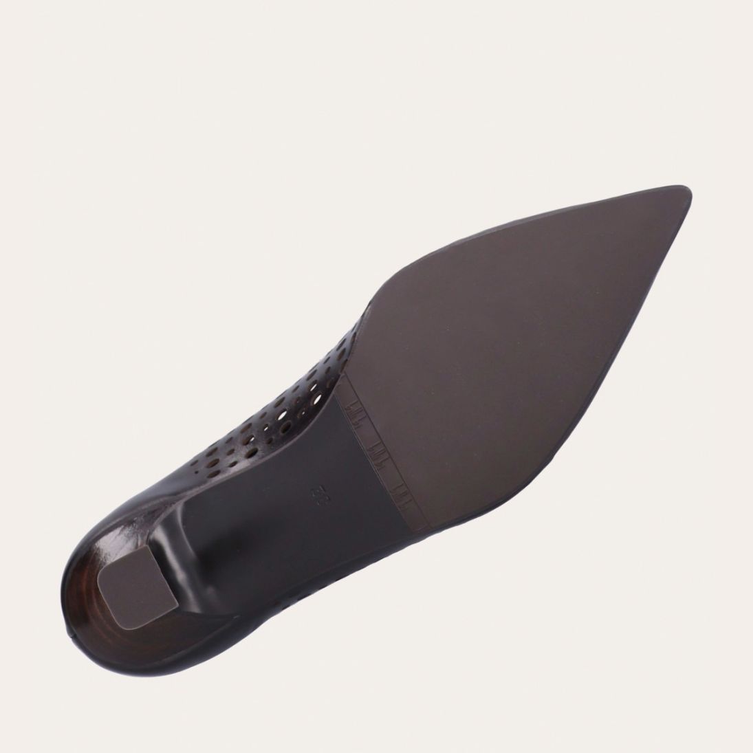 Håndlavet pump med spids tå, udført i mørkebrunt glat skind. Pumpen har et elegant perforeret mønster i skindet og en elegant kitten heel.