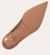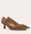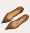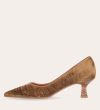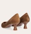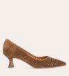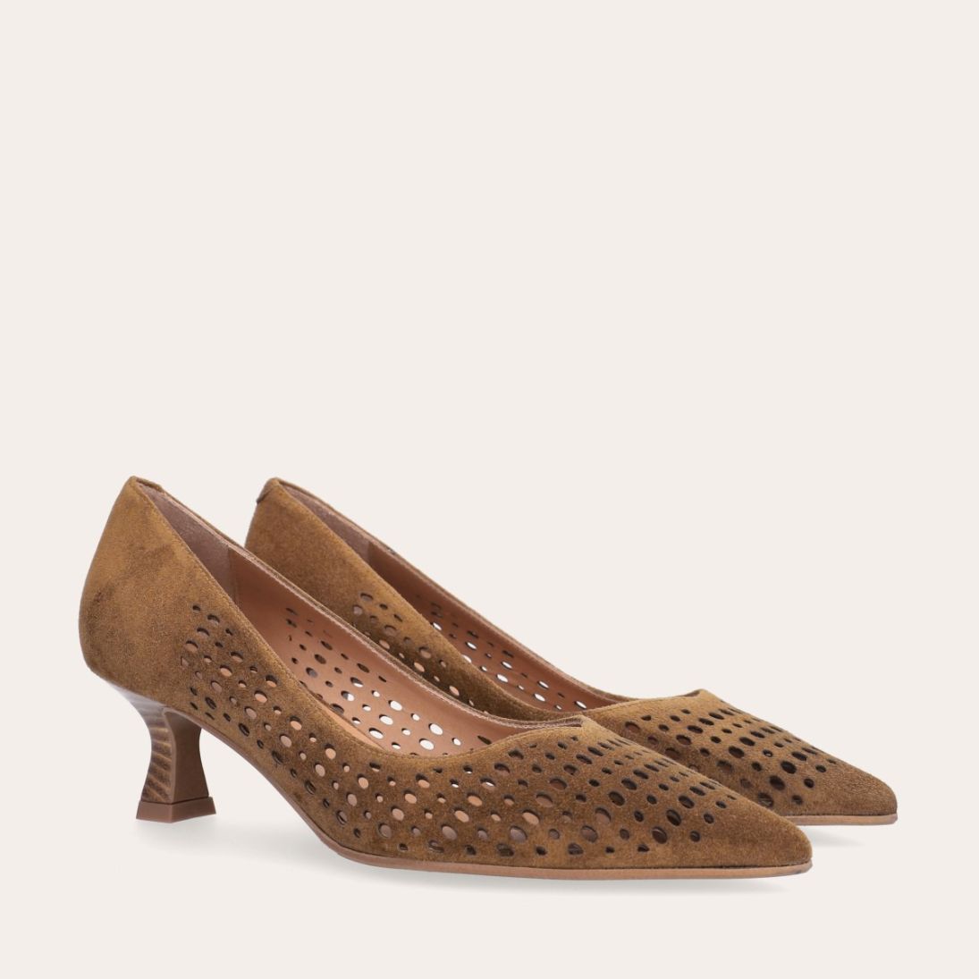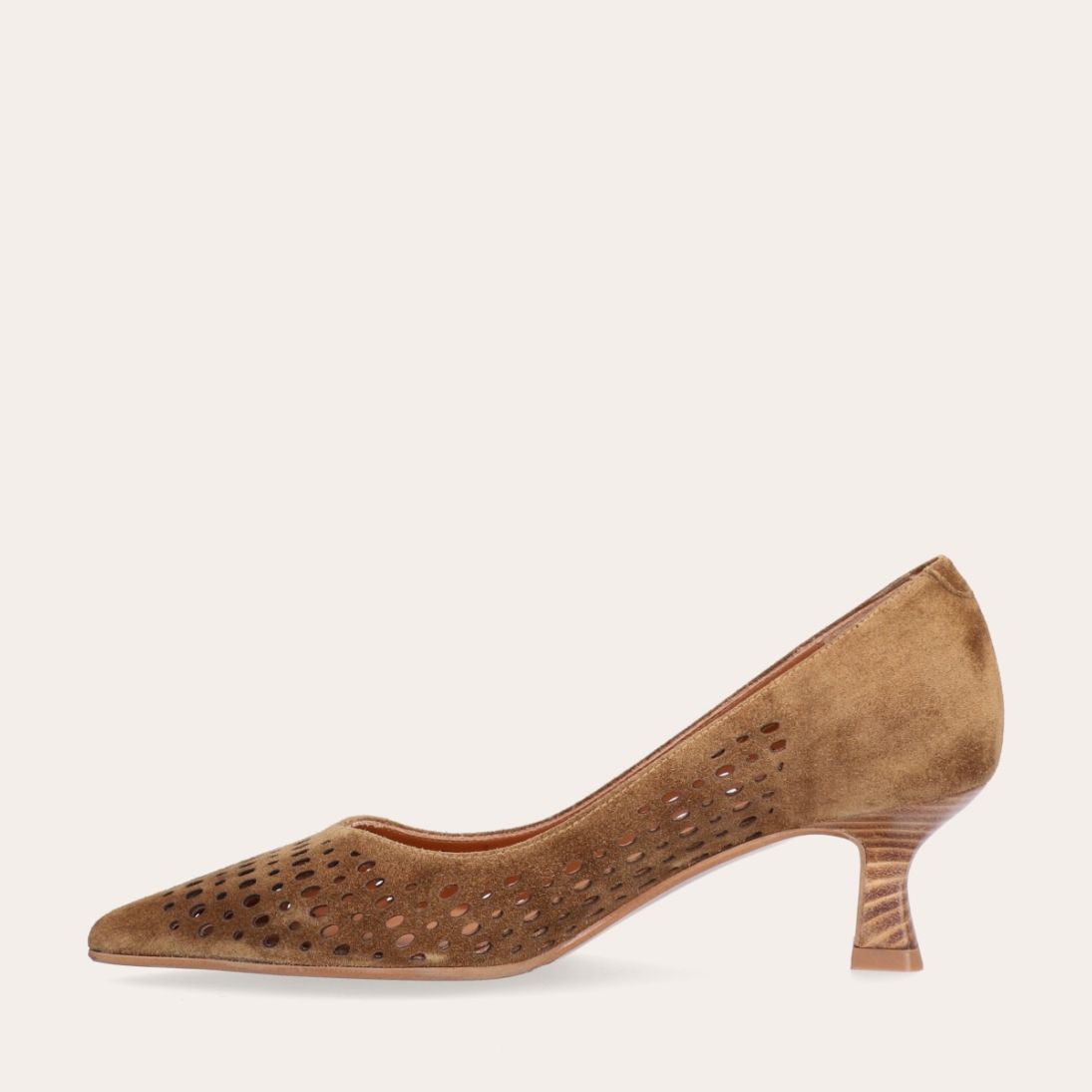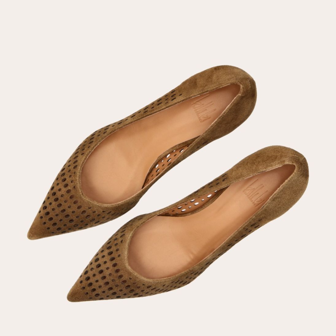 Håndlavet pump med spids tå, udført i lysebrunt ruskind. Pumpen har et elegant perforeret mønster i skindet og en elegant kitten heel.