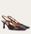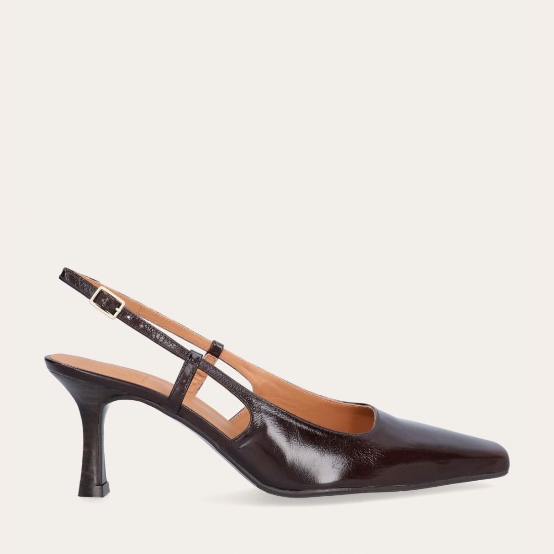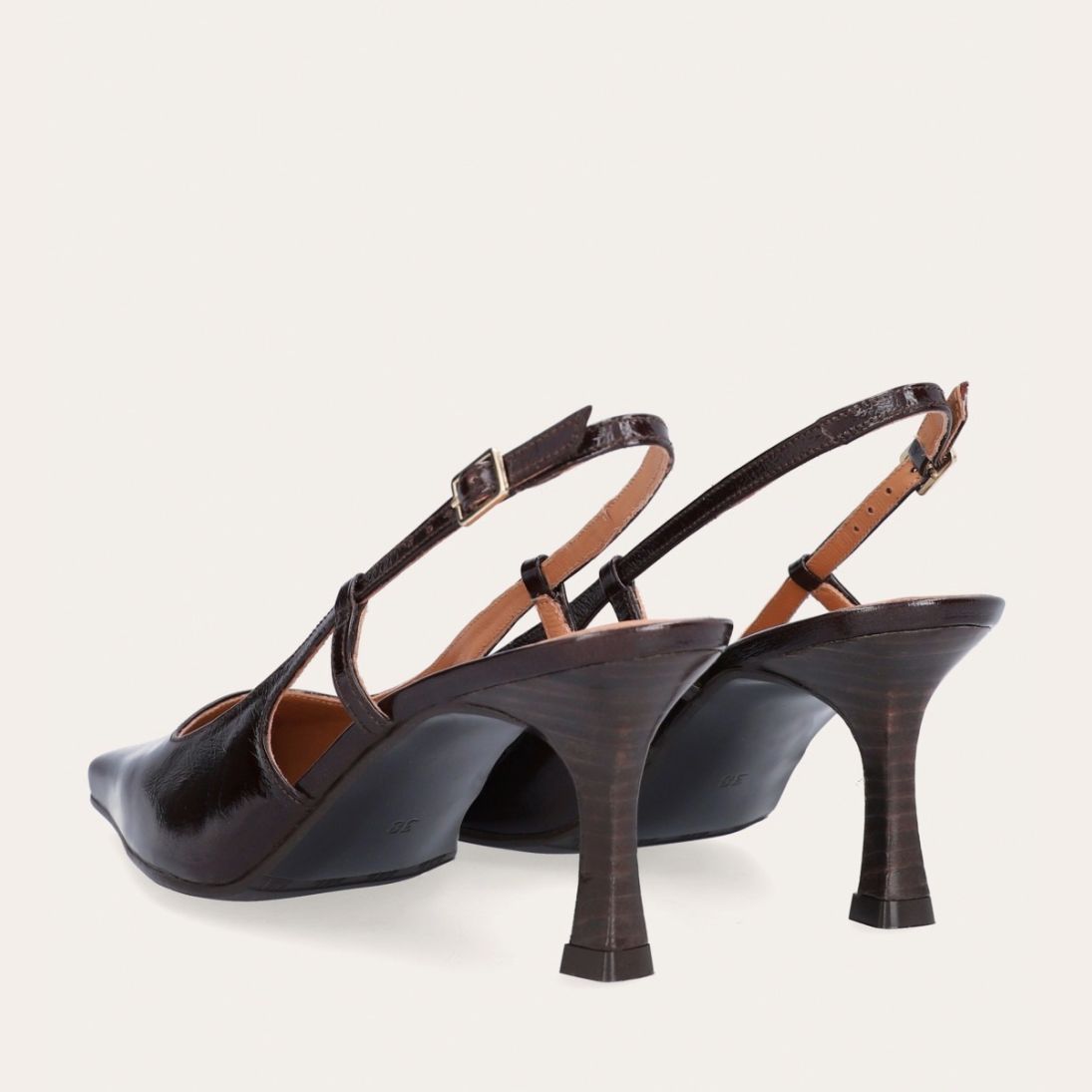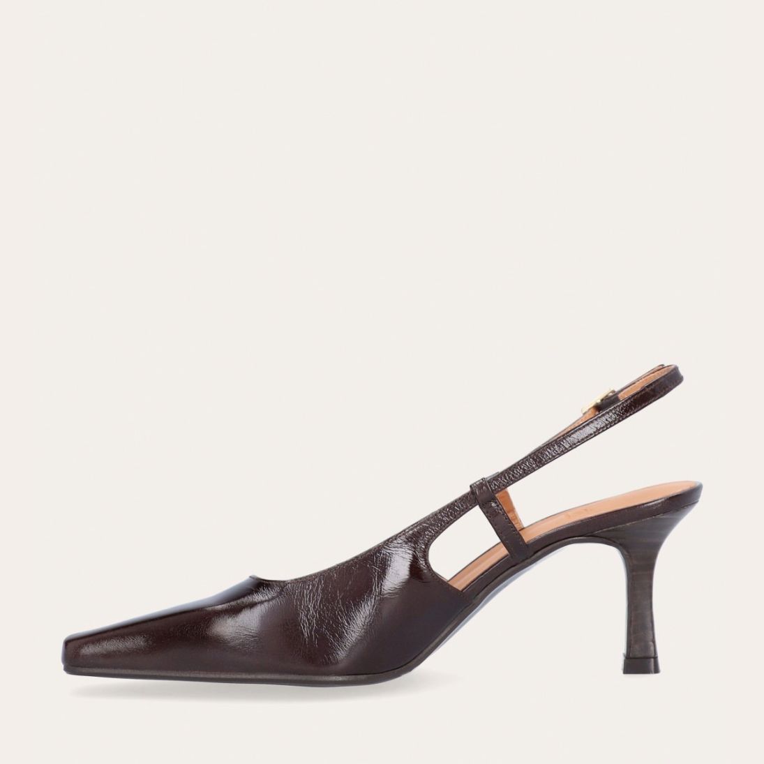Håndlavet slingback pump udført i mørkebrunt lakeret skind med en spids firkantet tå. Remmen lukkes med et lille gyldent spænde.