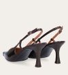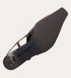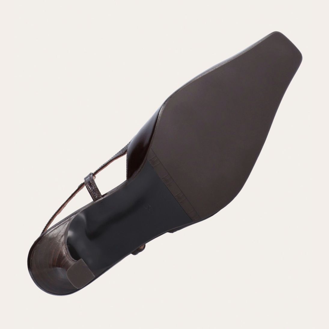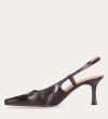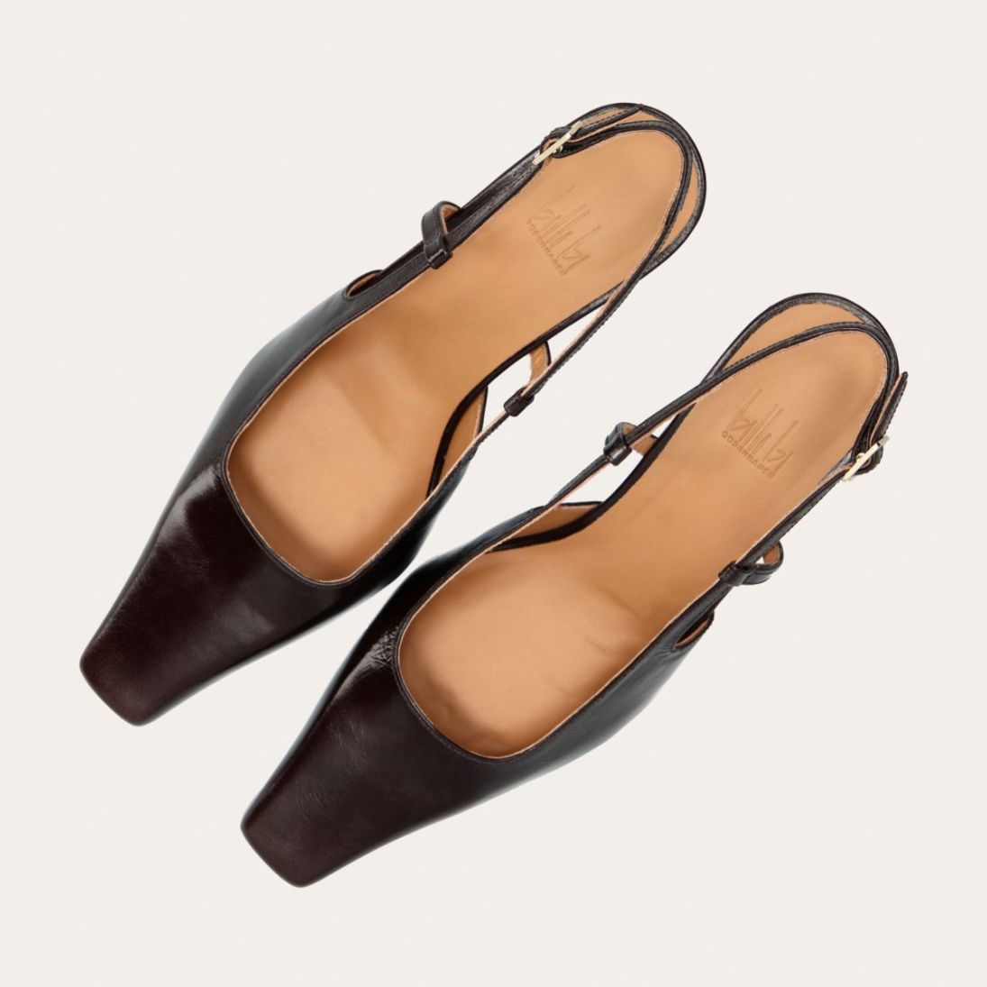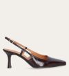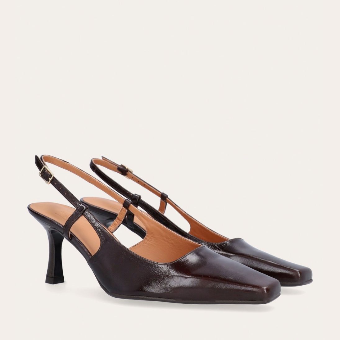Håndlavet slingback pump udført i mørkebrunt lakeret skind med en spids firkantet tå. Remmen lukkes med et lille gyldent spænde.