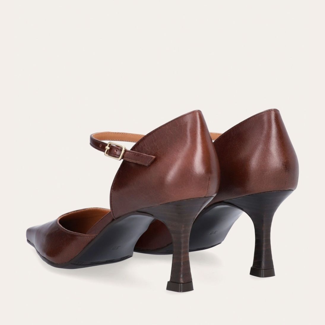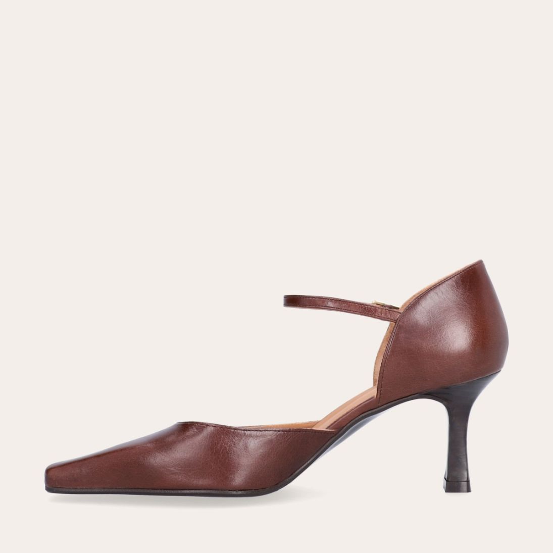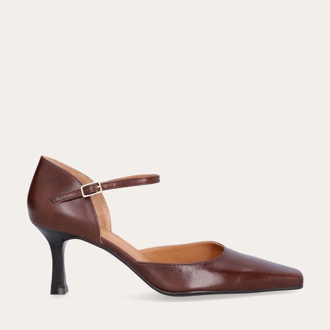 Håndlavet Mary Jane pump, udført i brunt skind med en firkantet spids tå. Den justerbare ankelrem lukkes med et guld spænde, og pumpen har en medium-høj hæl.