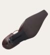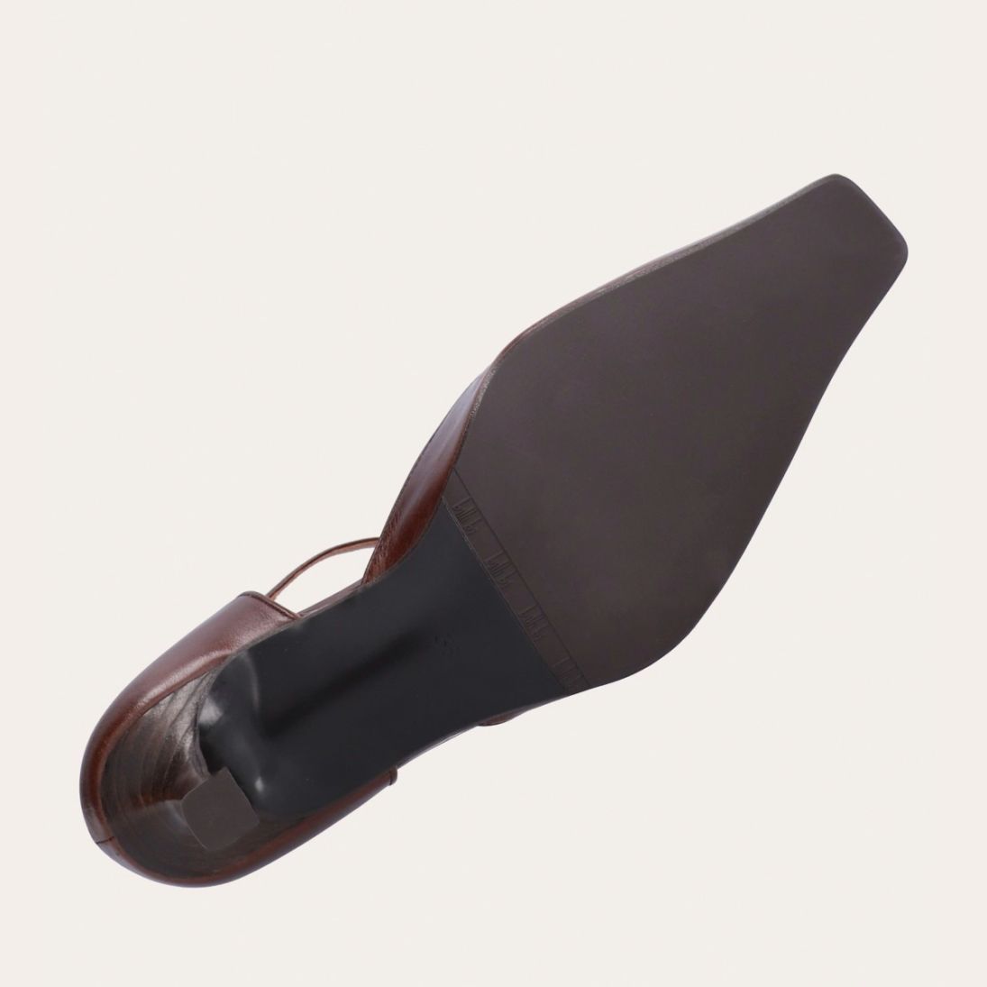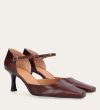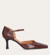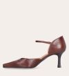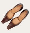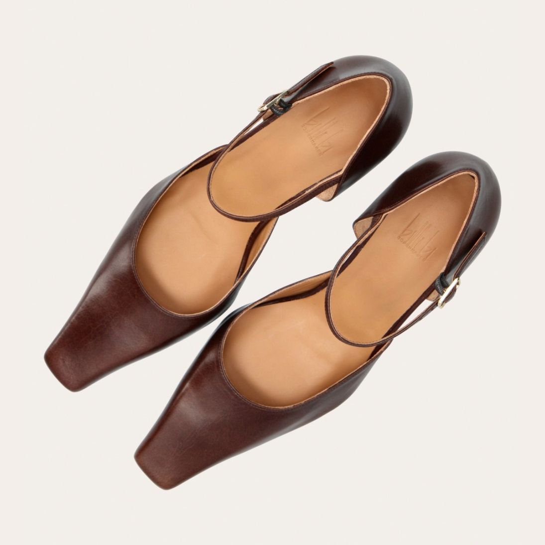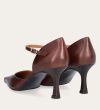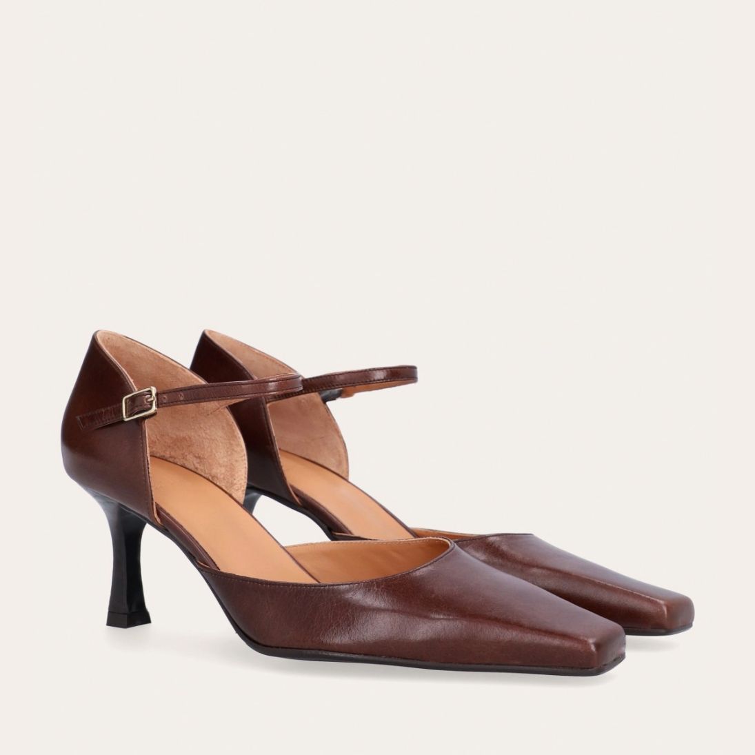 Håndlavet Mary Jane pump, udført i brunt skind med en firkantet spids tå. Den justerbare ankelrem lukkes med et guld spænde, og pumpen har en medium-høj hæl.