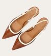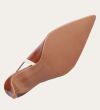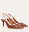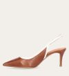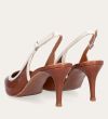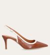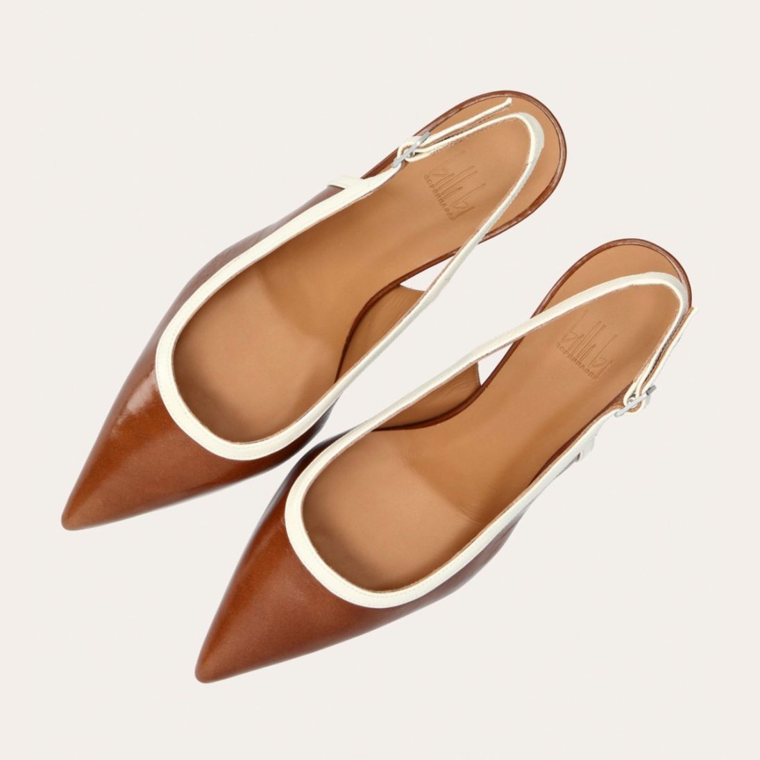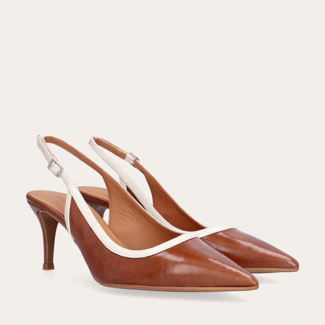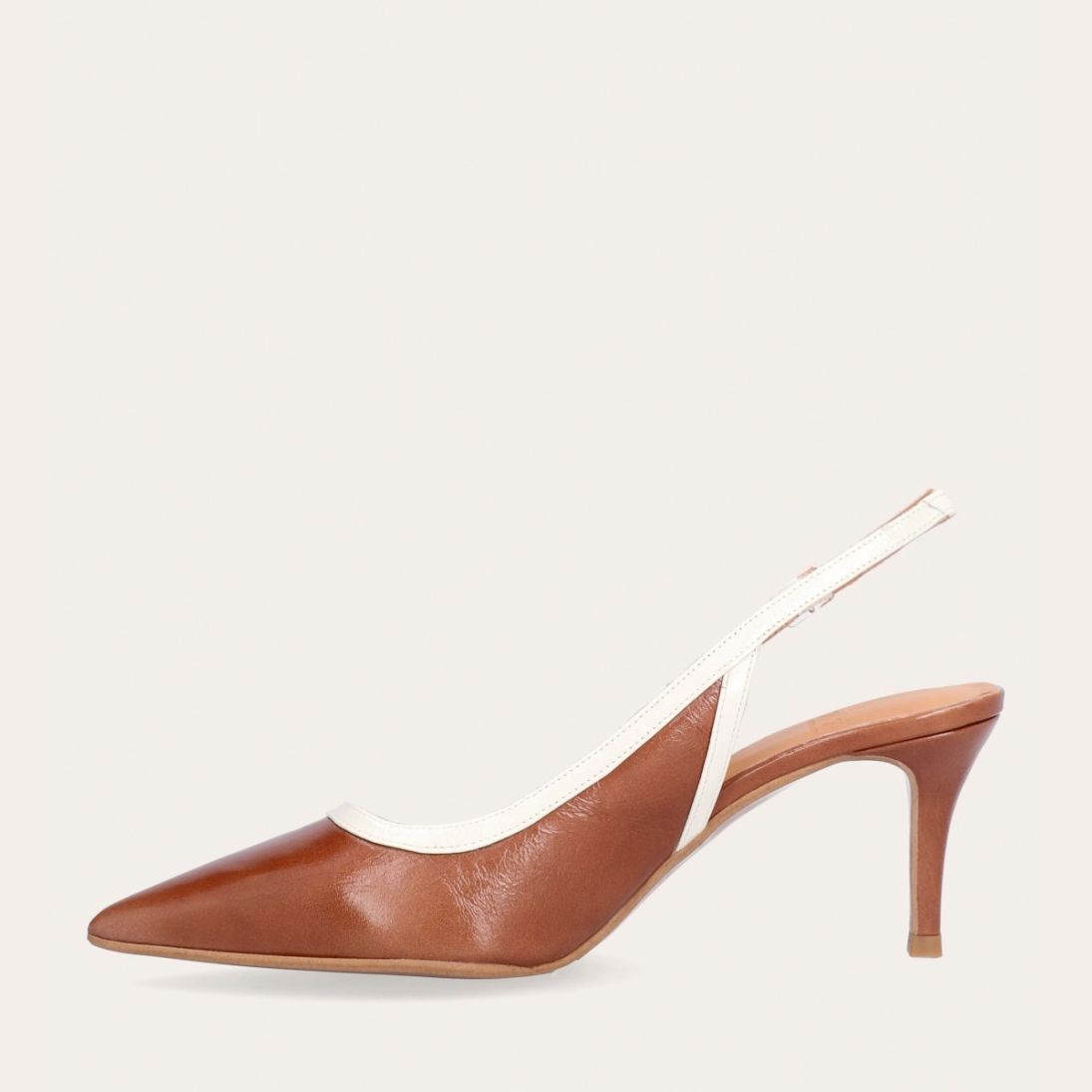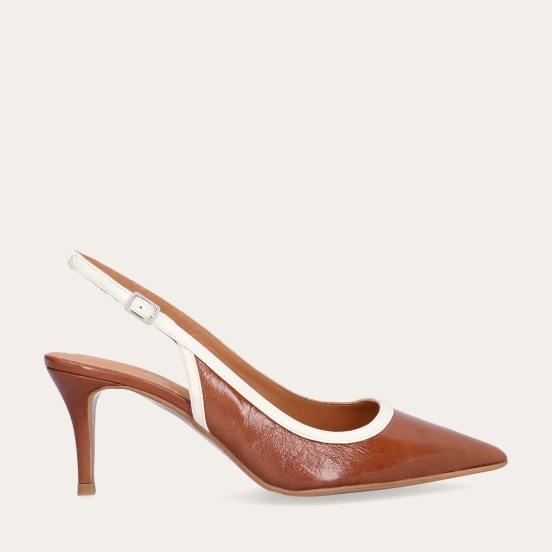 Håndlavet slingback pump med spids tå, udført i brunt lakeret skind. Stroppen lukkes med et lille sølvfarvet spænde.