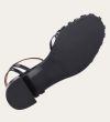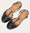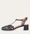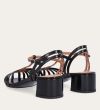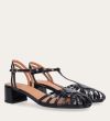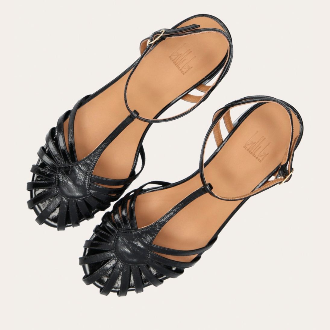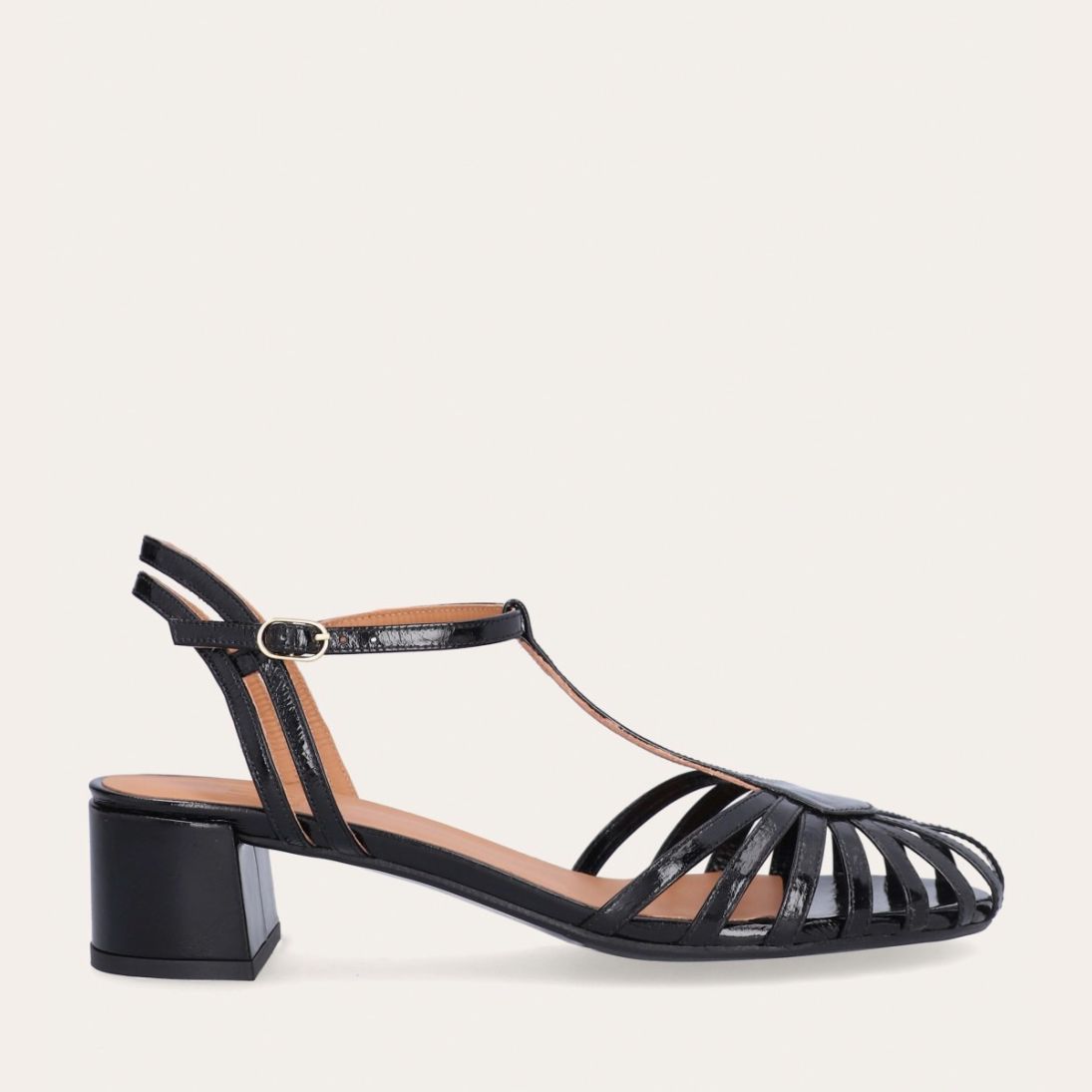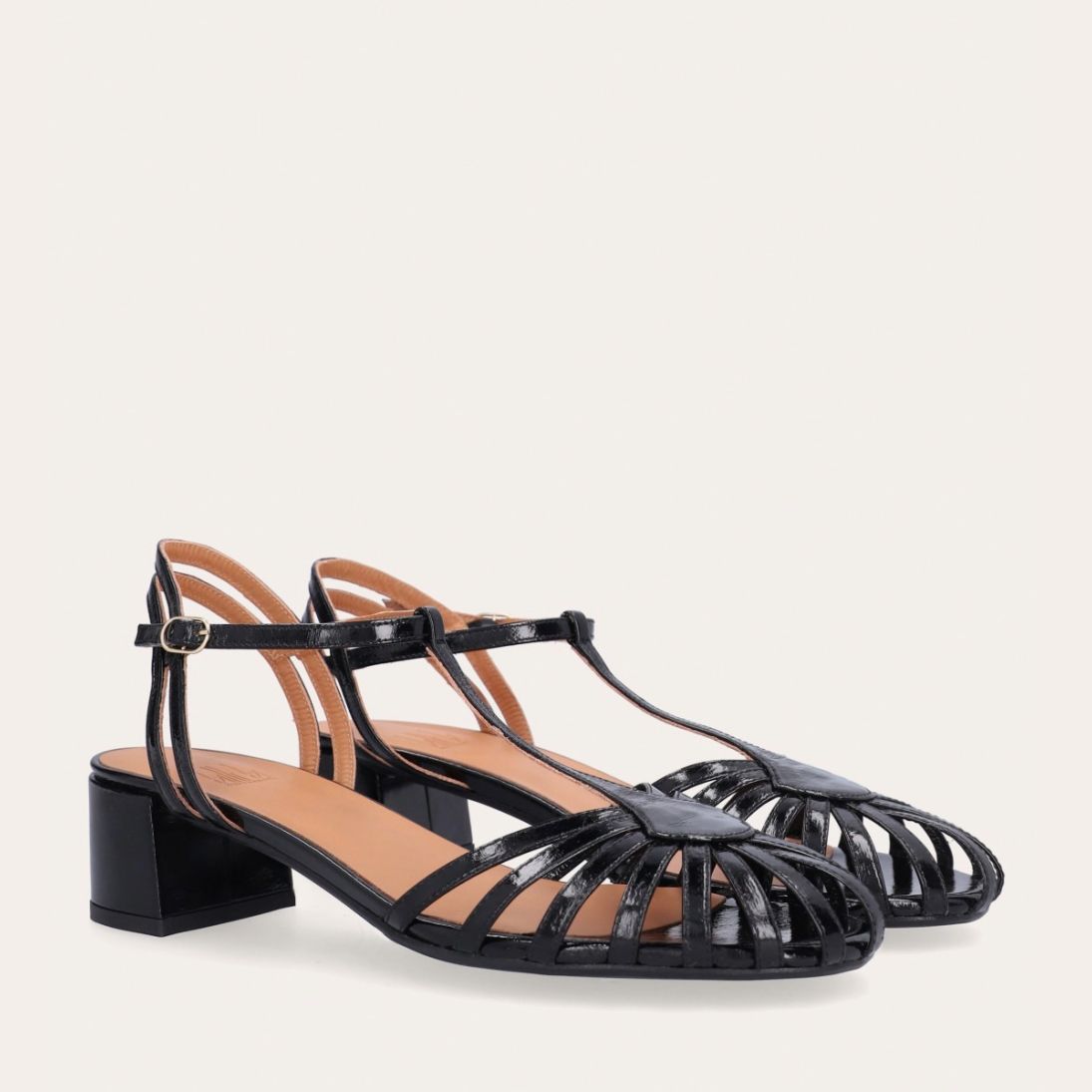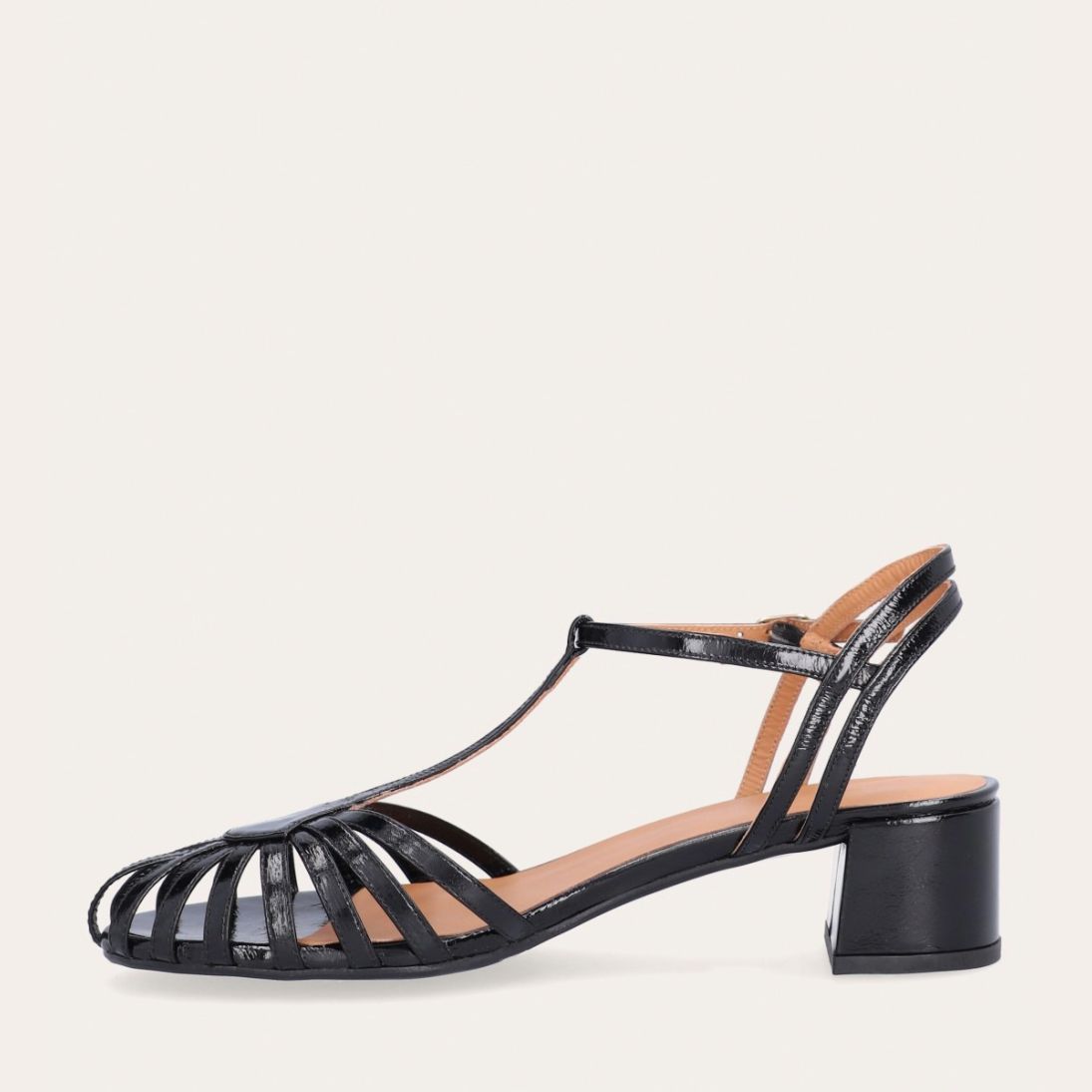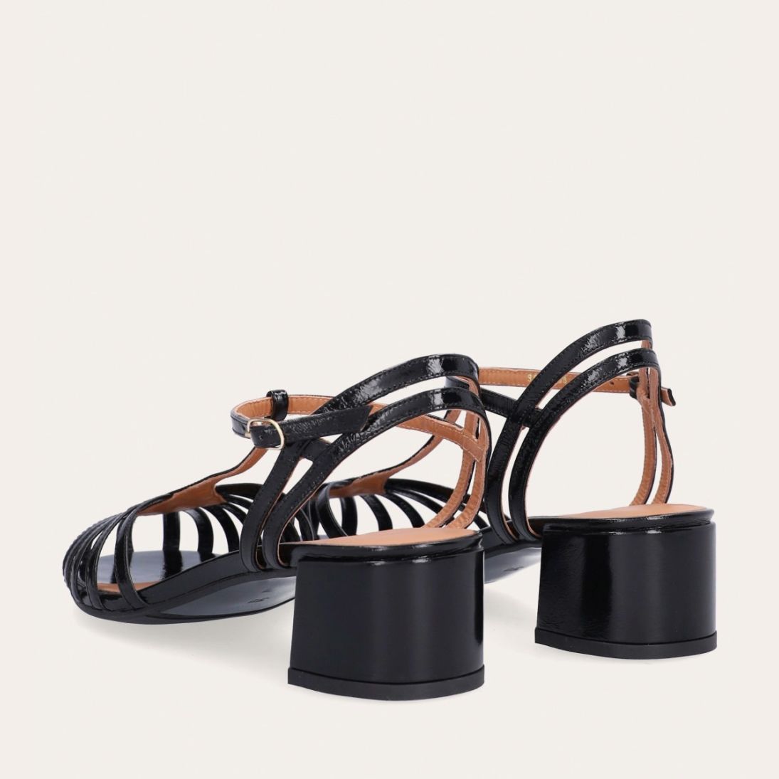 Håndlavet sandal på hæl, udført i sort lakeret skind med rund, åben tå. Sandalens front er designet med en T-rem og flere tynde stropper, som skaber en elegant og feminin silhuet. Omkring anklen sidder to remme, der fuldender det raffinerede udtryk. Den justerbare ankelrem lukkes med et guldspænde, og sandalen har en mellemhøj blokhæl.
