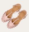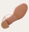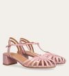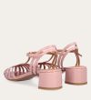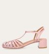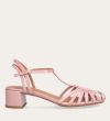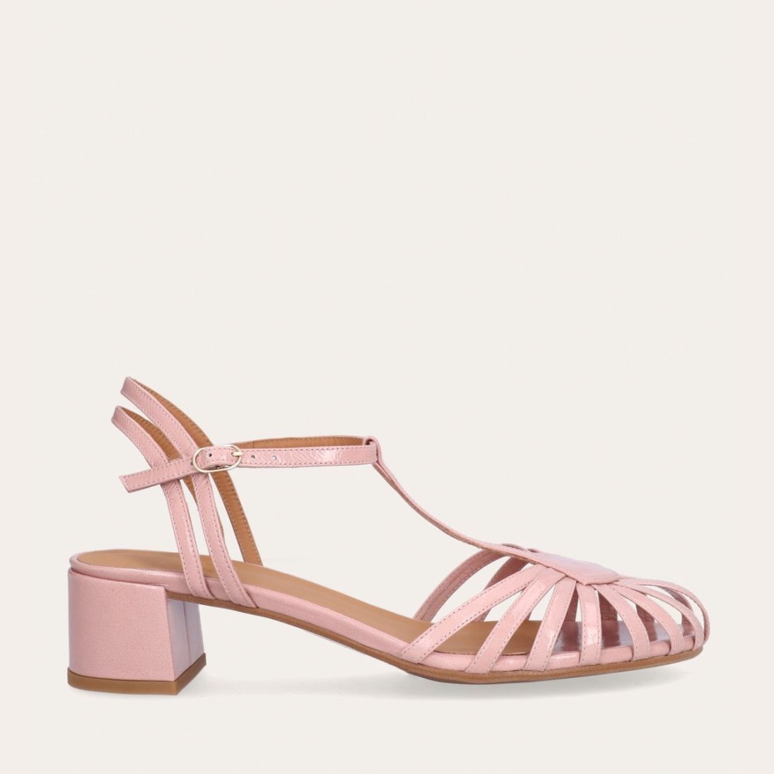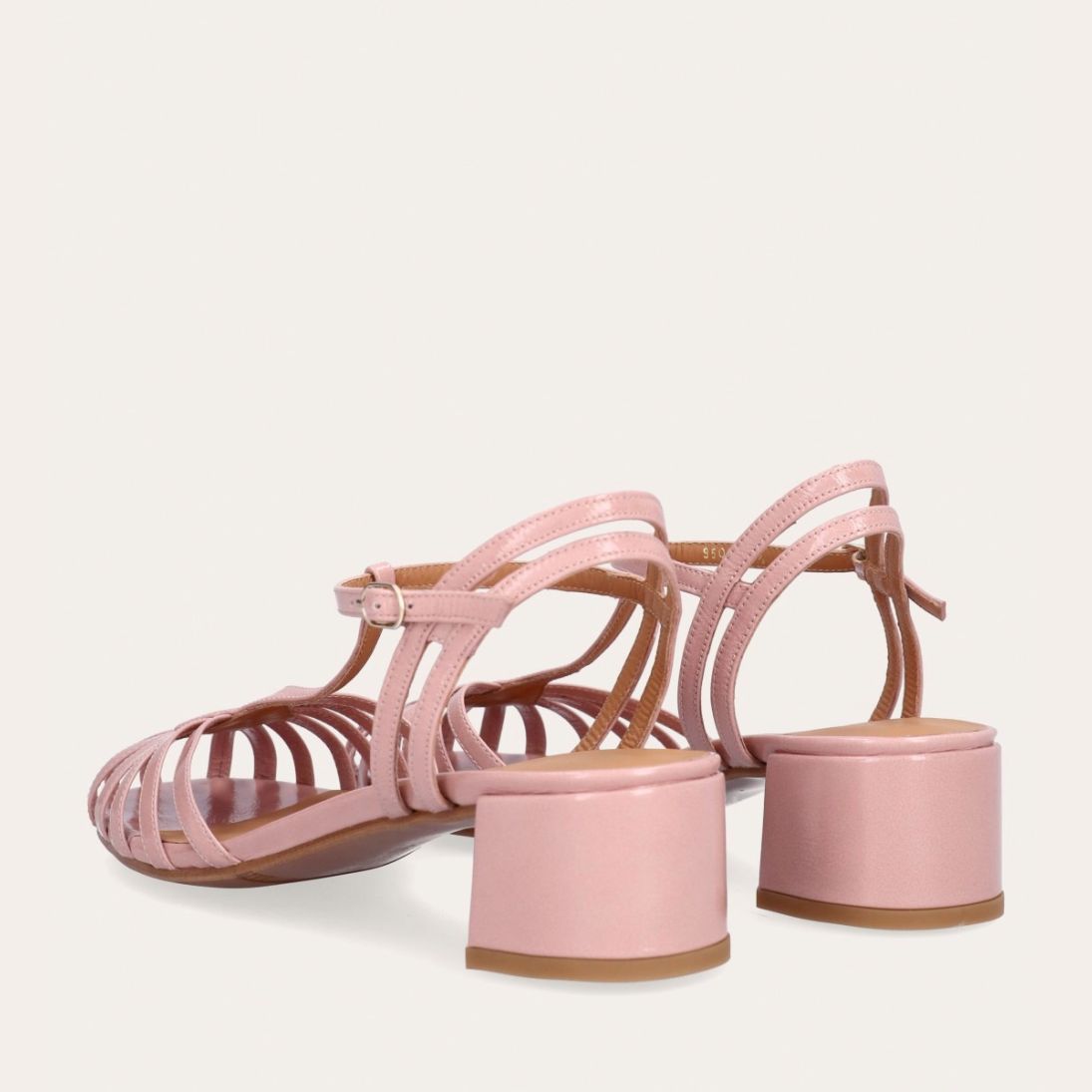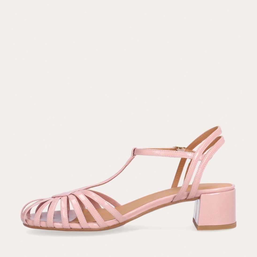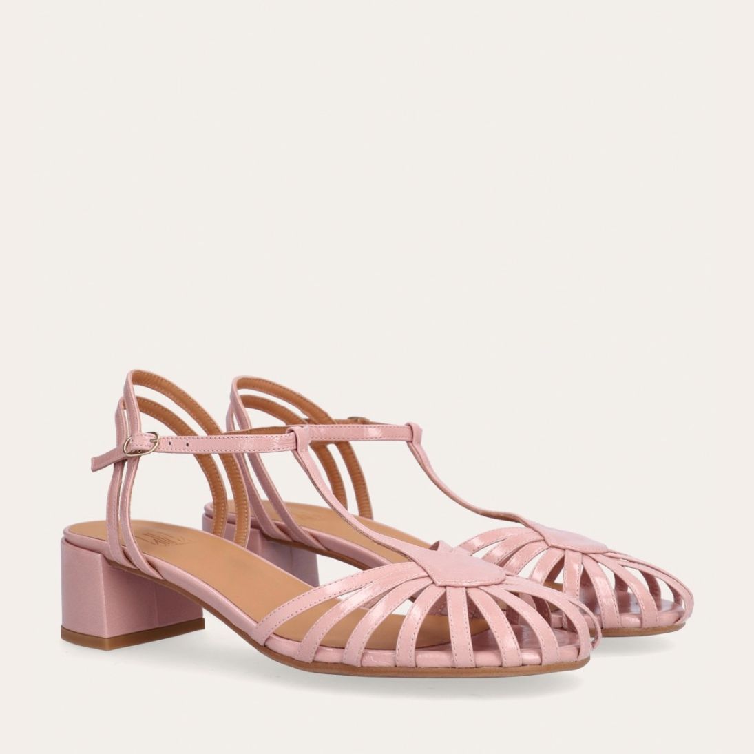 Håndlavet sandal på hæl, udført i lyserødt lakeret skind med rund, åben tå. Sandalens front er designet med en T-rem og flere tynde stropper, som skaber en elegant og feminin silhuet. Omkring anklen sidder to remme, der fuldender det raffinerede udtryk. Den justerbare ankelrem lukkes med et guldspænde, og sandalen har en mellemhøj blokhæl.