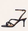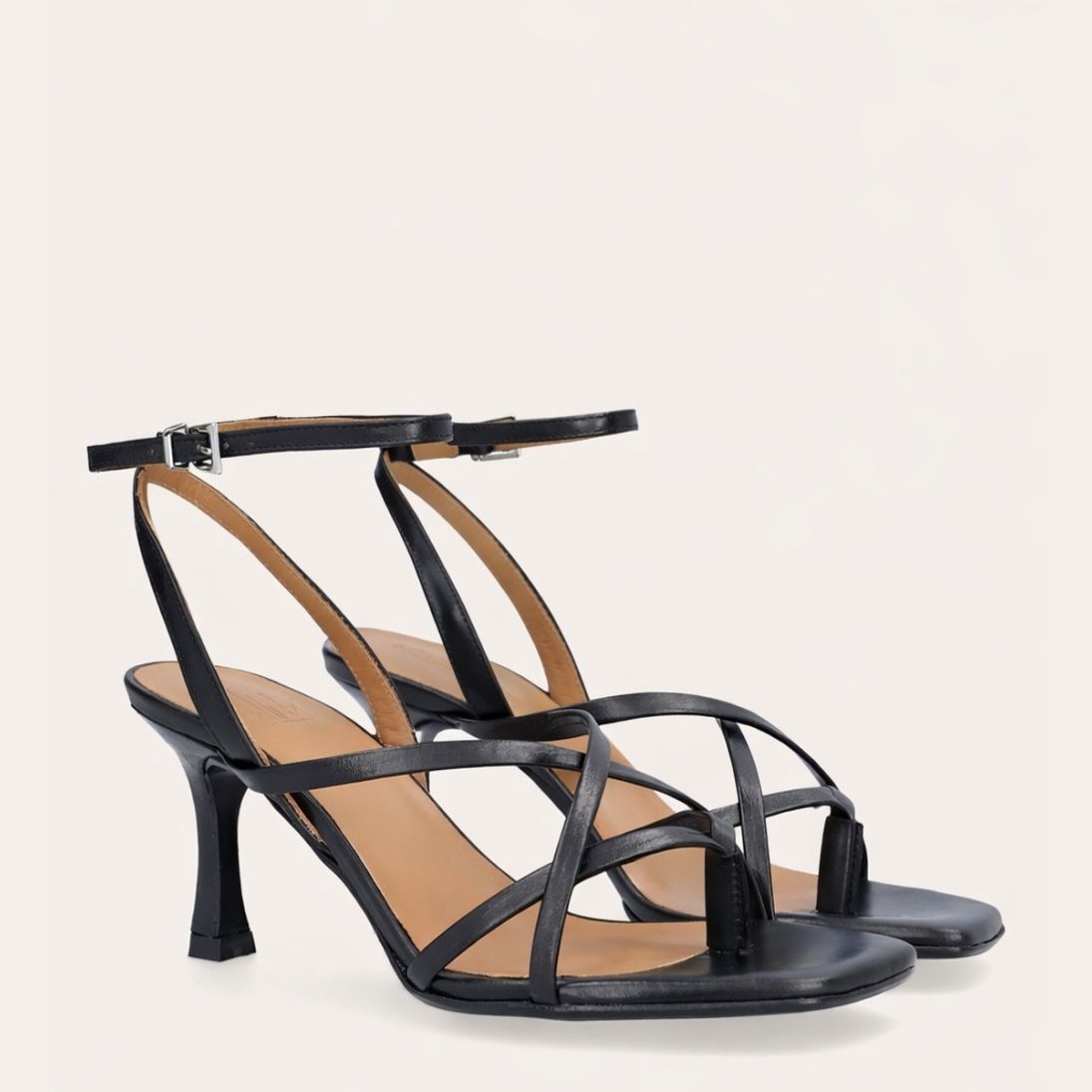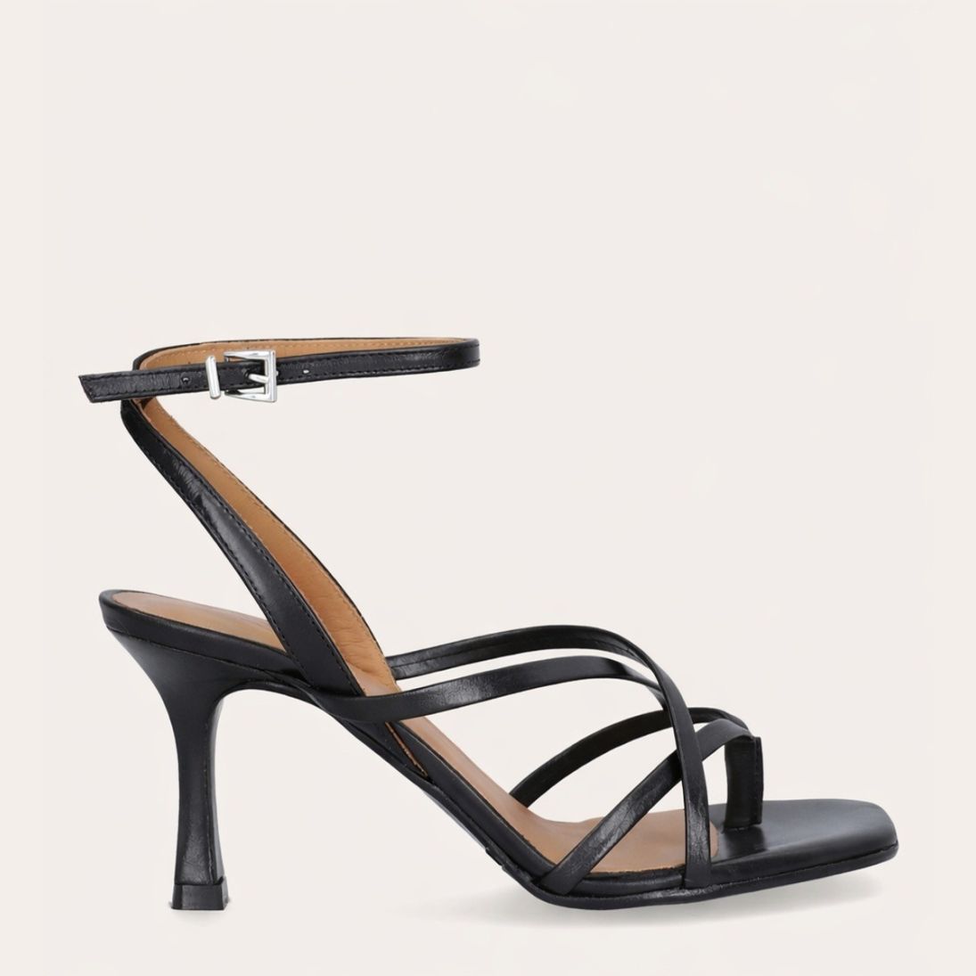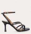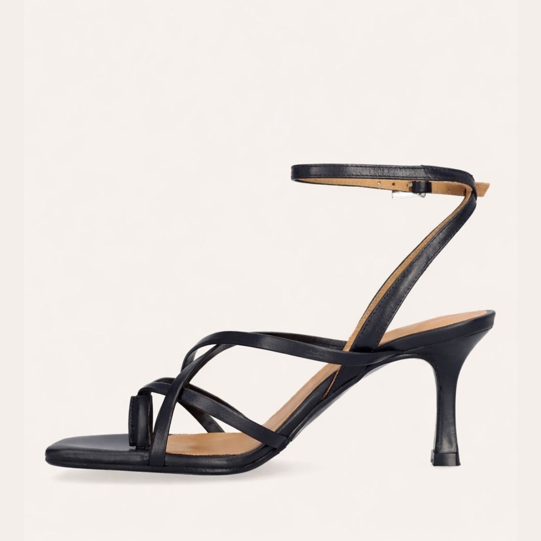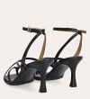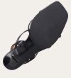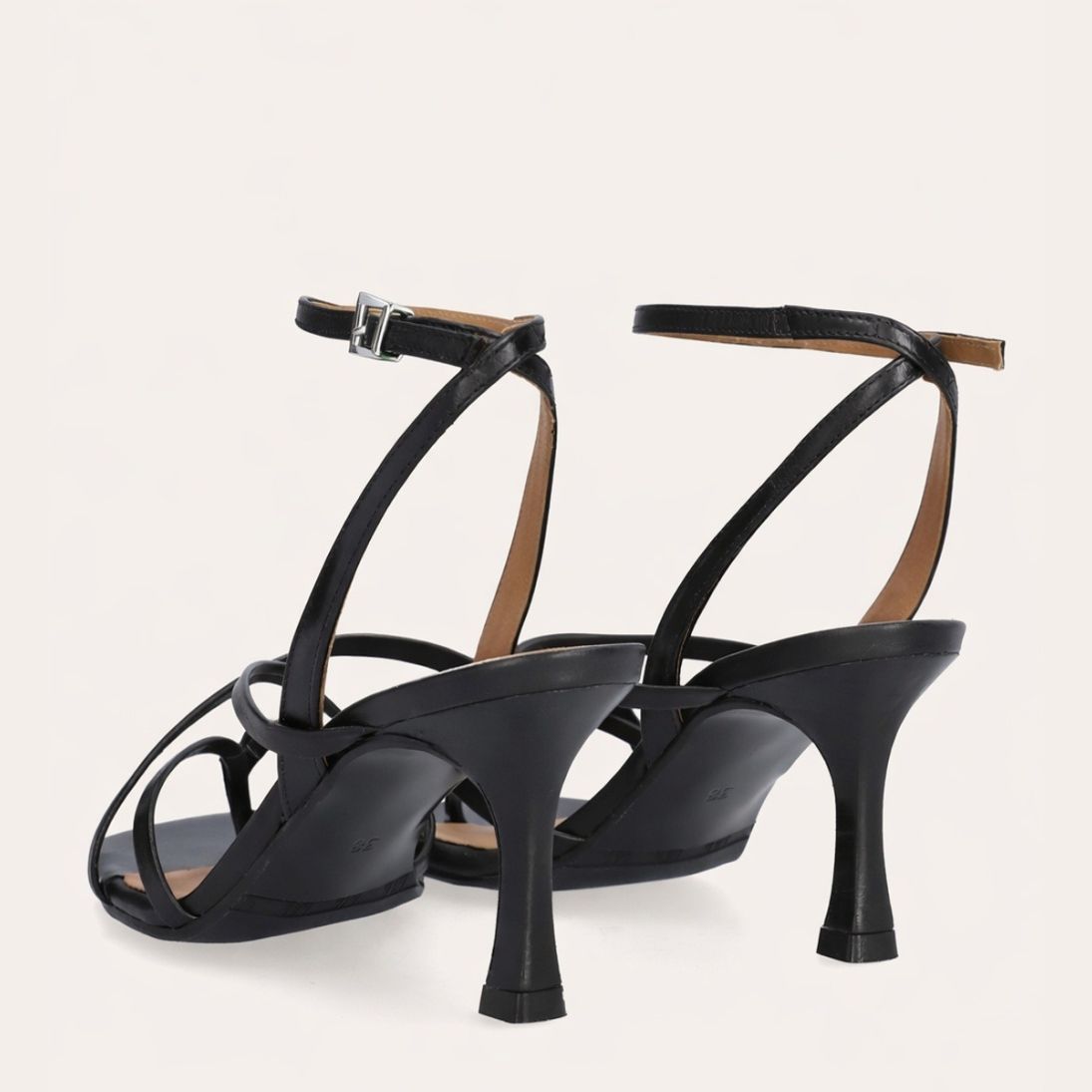 Håndlavet sandal på hæl, udført i sort glat skind med firkantet snude og en skulpturel høj hæl. Sandalen har tynde remme, der krydser over forfoden, samt en rem mellem tæerne. Den er afsluttet med en justerbar ankelrem som lukkes med et sølvspænde.