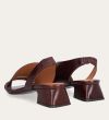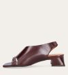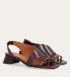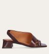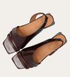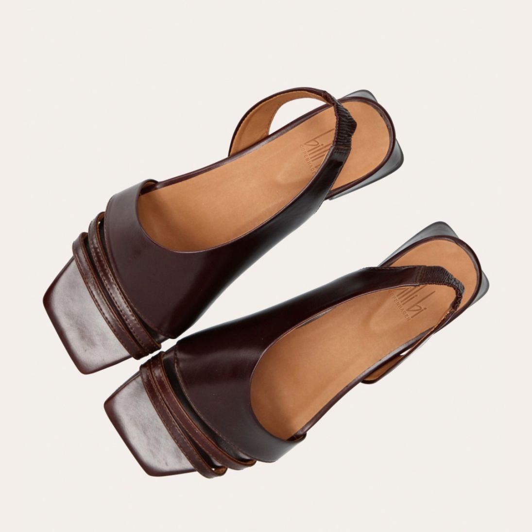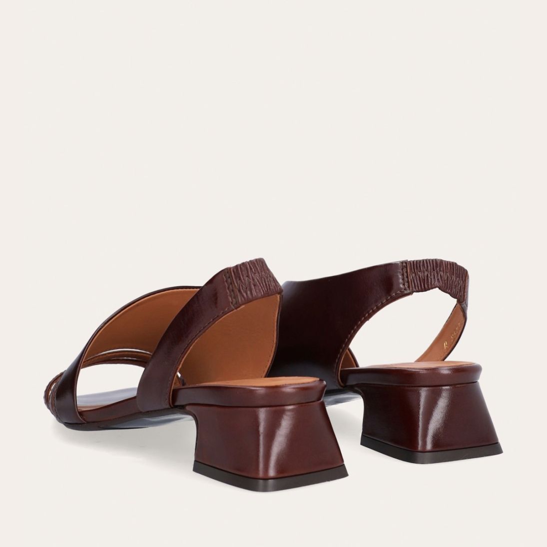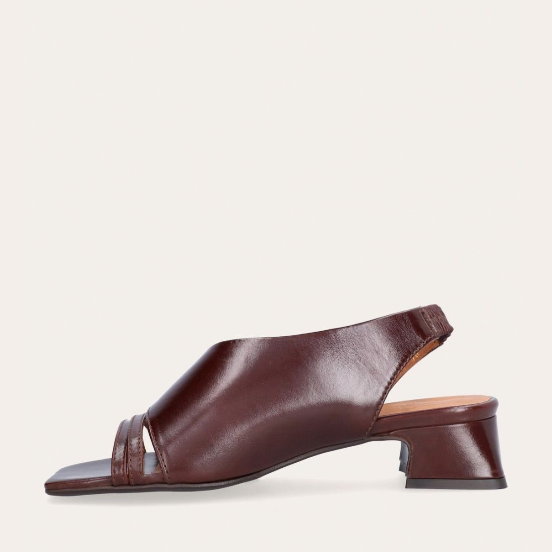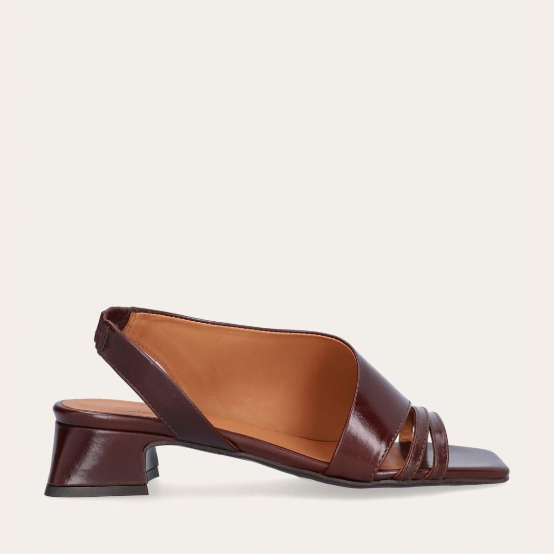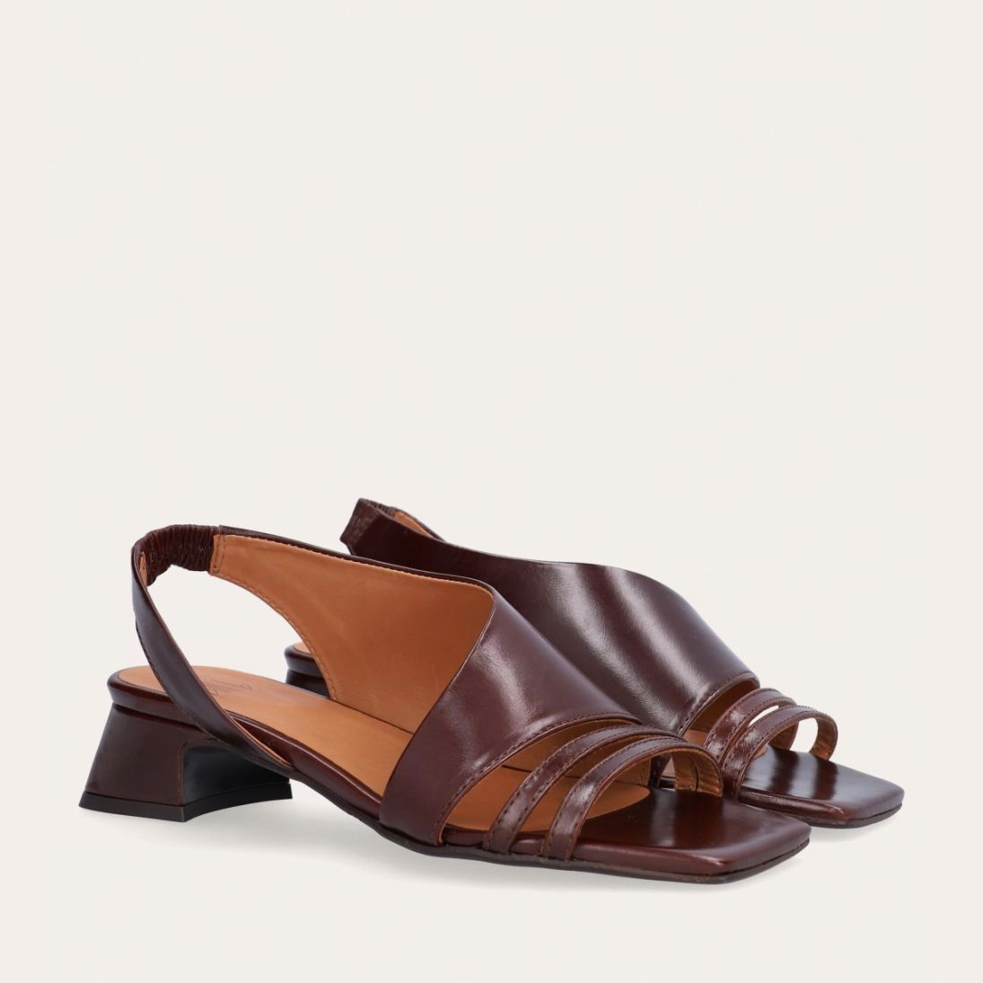 Håndlavet sandal på hæl, udført i brunt glat skind med en firkantet tå. Sandalen har asymmetriske sider og en rem, der går rundt om hælen. Remmen er designet med en elastisk indeni for at sikre en fleksibel og behagelig pasform. Sandalen er også designet med tynde remme henover foden foran.