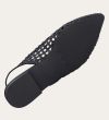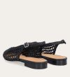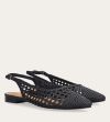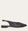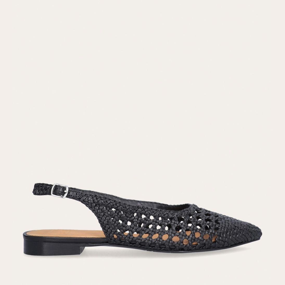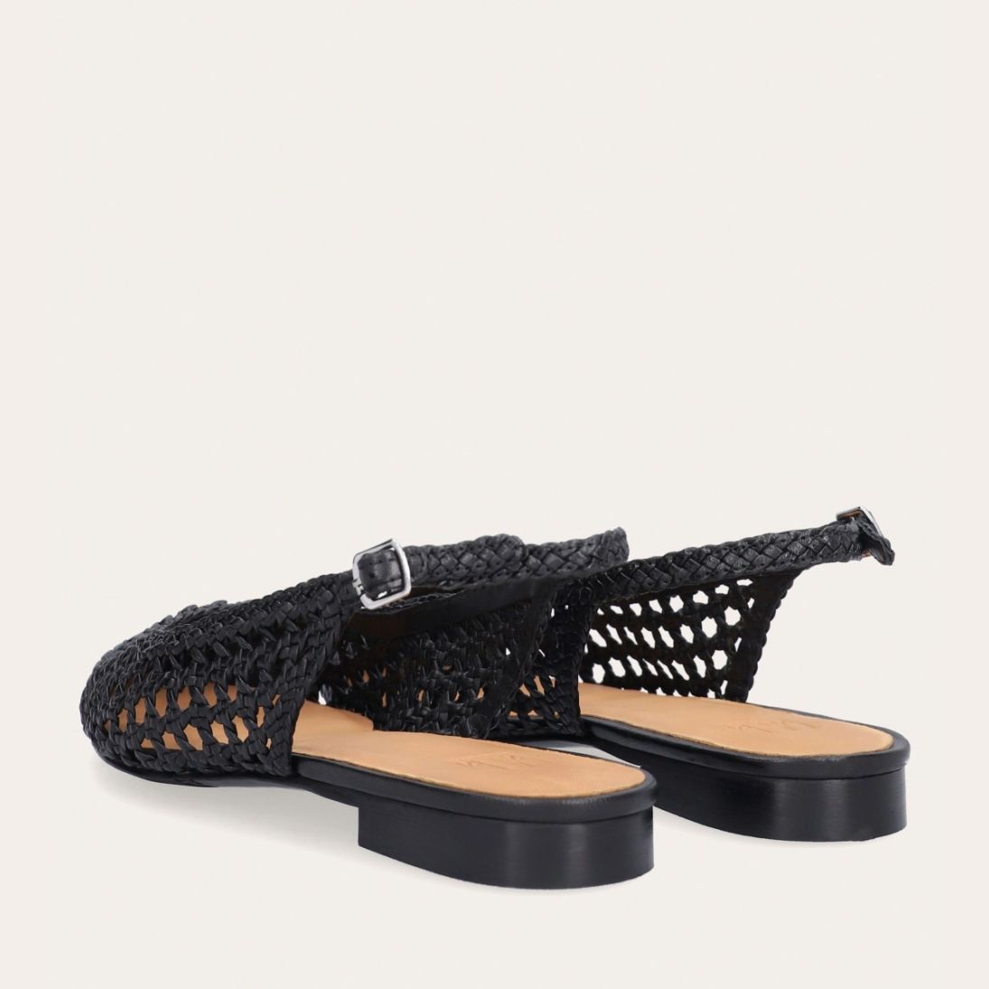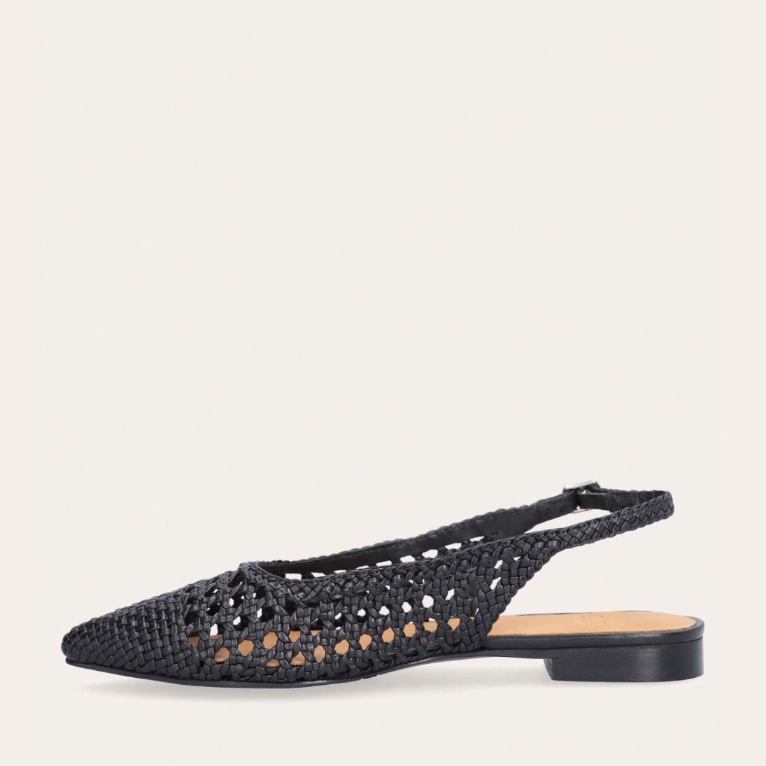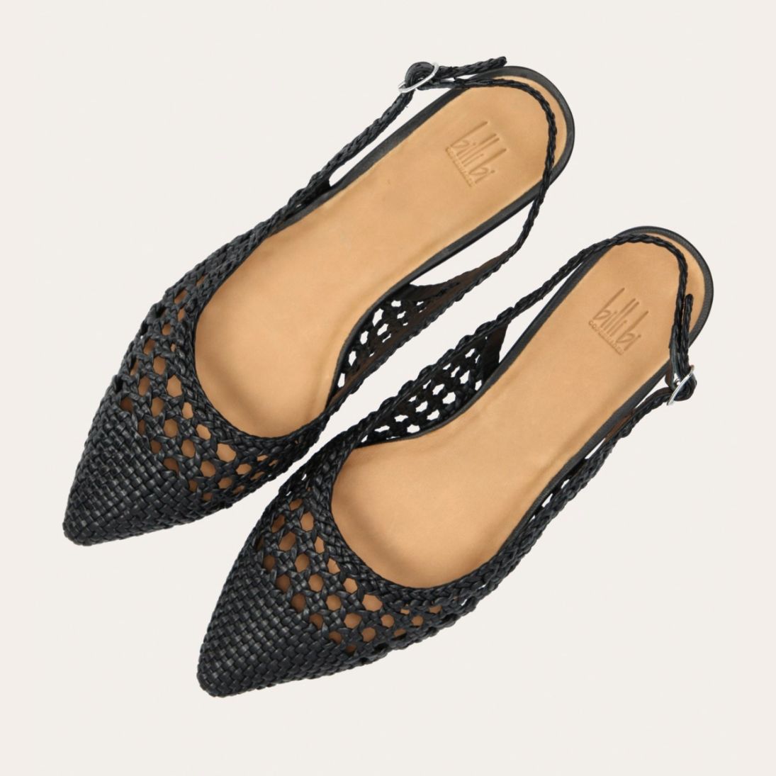 Håndlavet slingback ballerina udført i sort flettet skind med spids tå. Slingback-remmen lukkes med et sølvspænde.