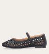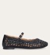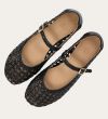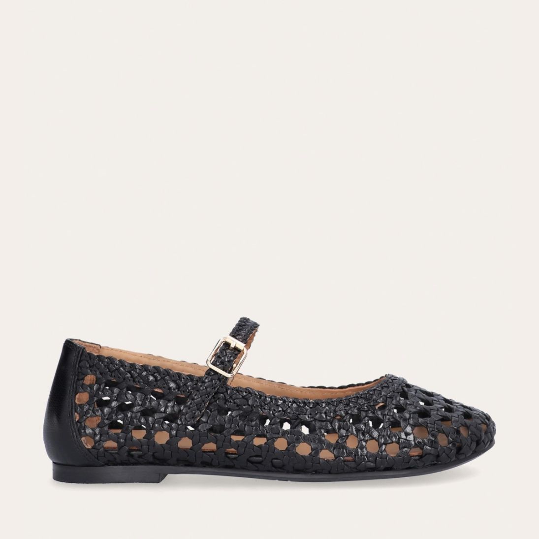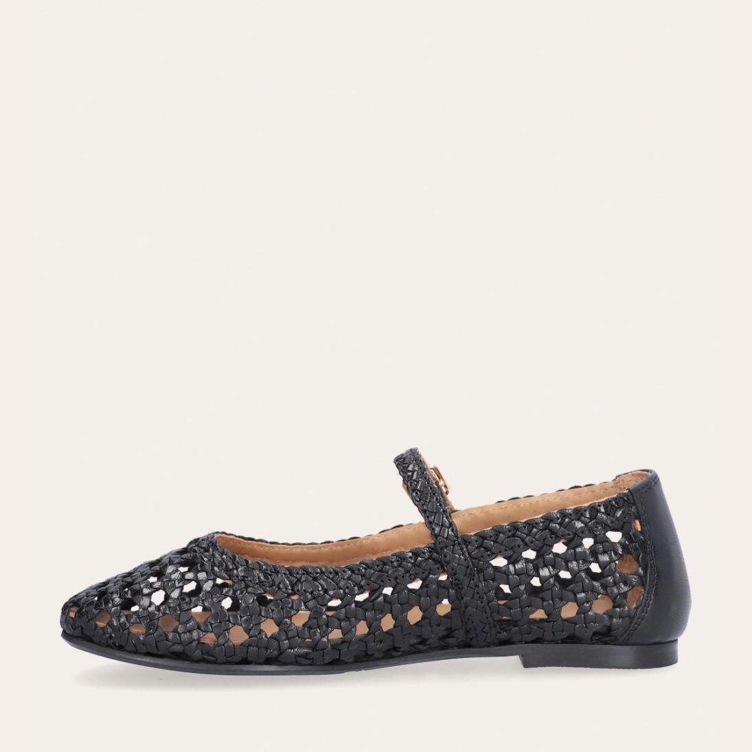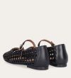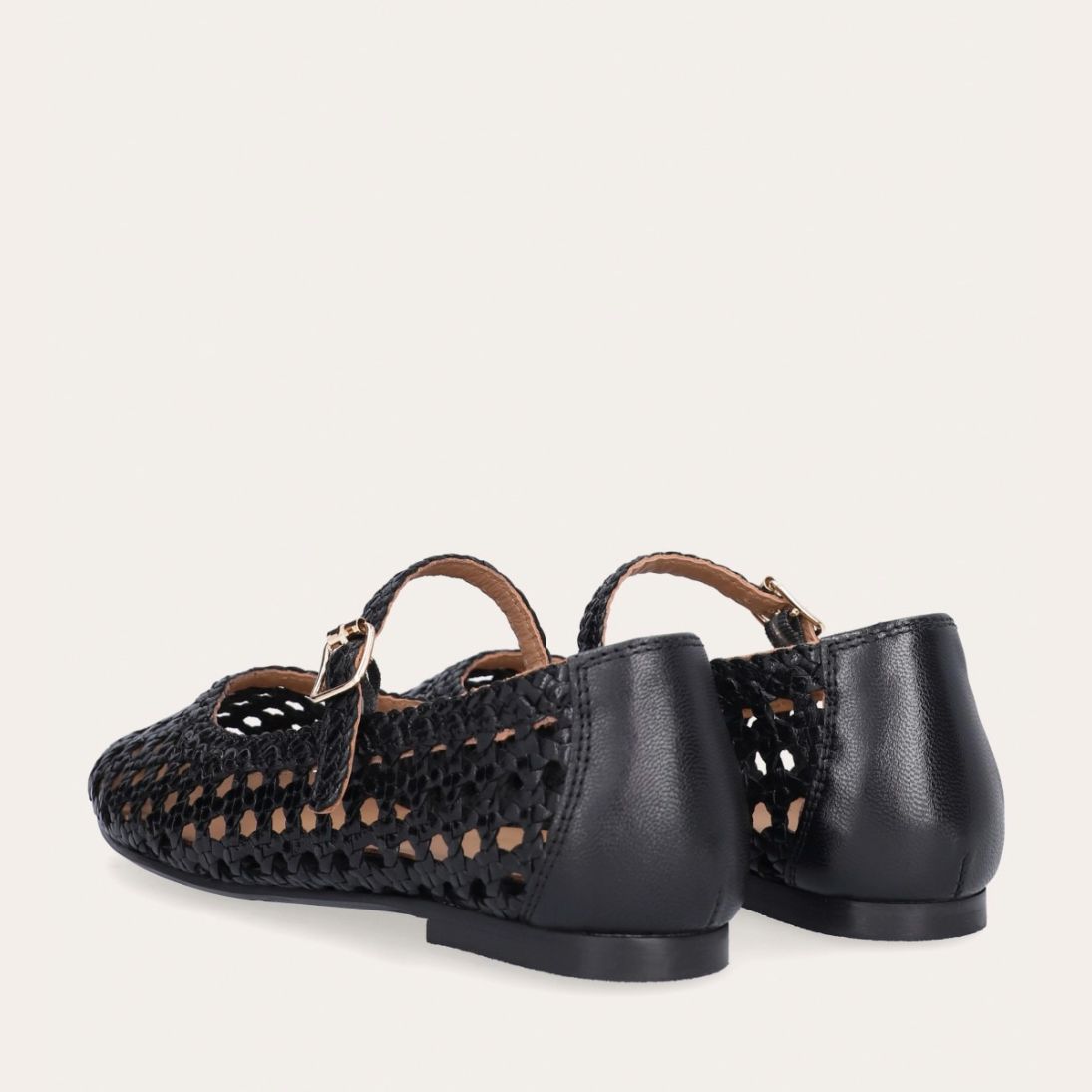 Håndlavet ballerina udført i sort flettet skind med rund tå. Ballerinaen har en rem henover foden der lukkes med et gyldent spænde.