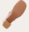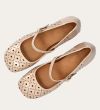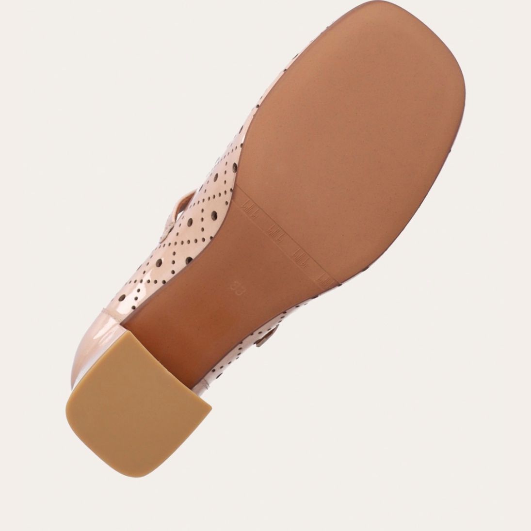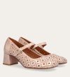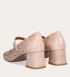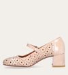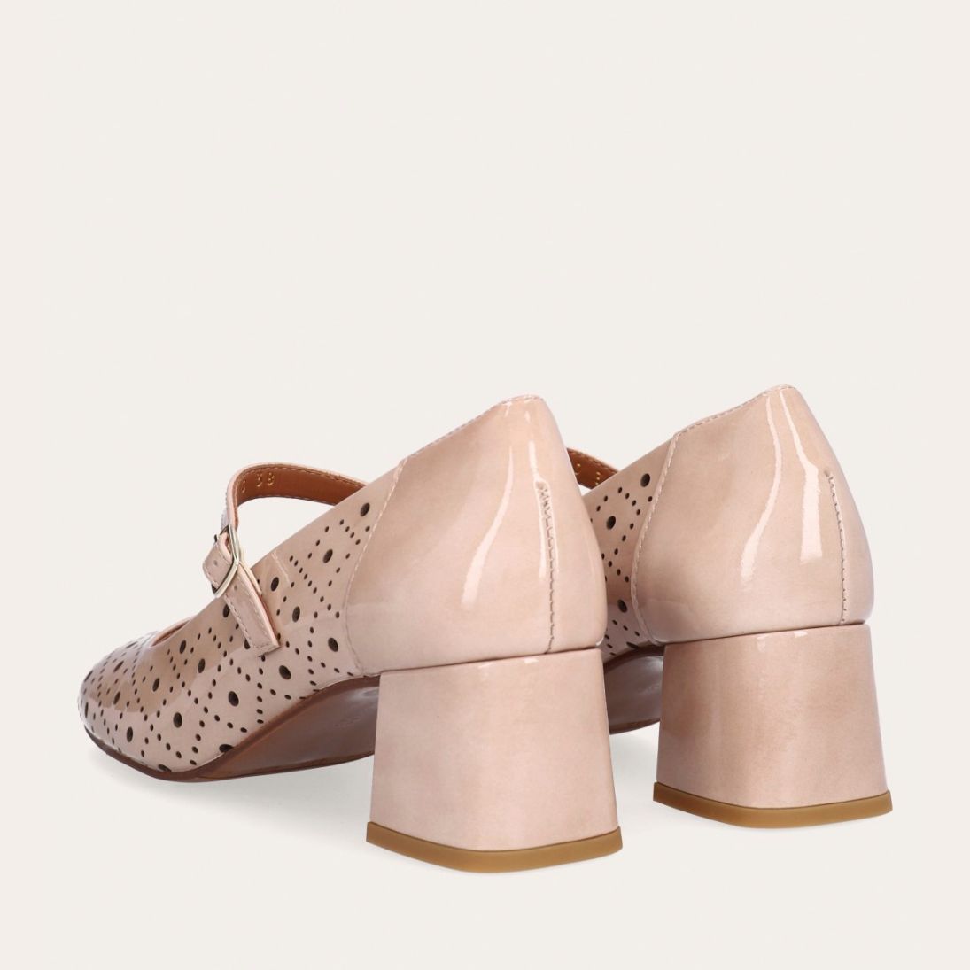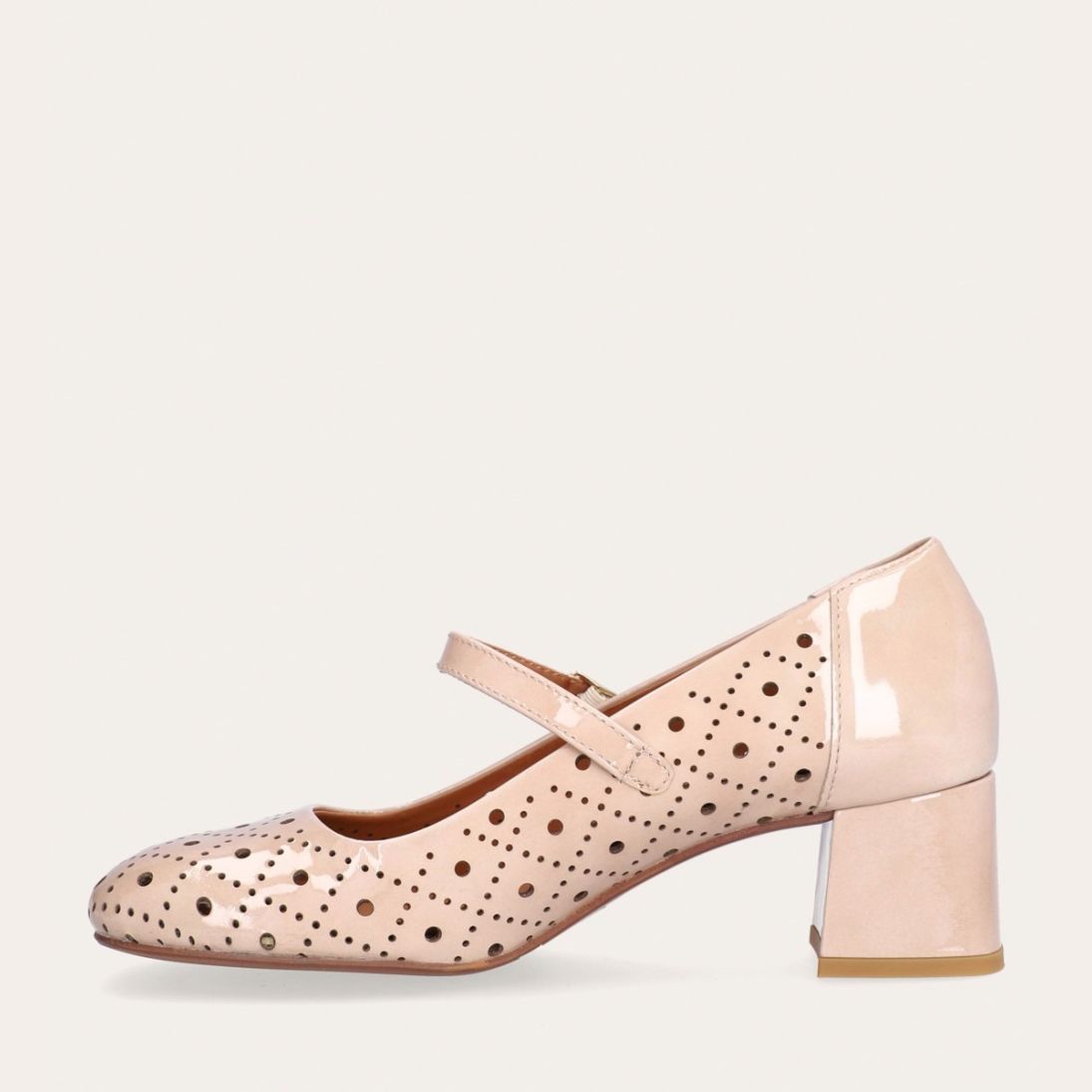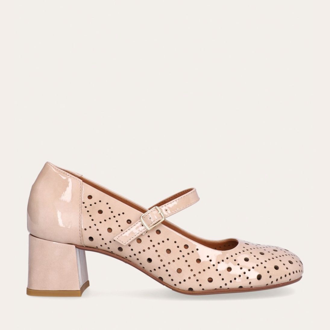 Håndlavet Mary Jane-pump, udført i beige lakeret skind med en firkantet tå. Pumpen har et attraktivt hulmønster og en elegant ankelrem, der lukkes med et firkantet guldspænde. Pumpen er designet med en medium-høj blokhæl.