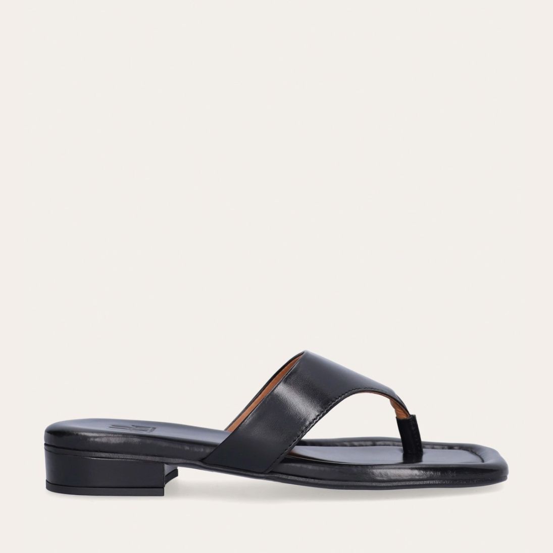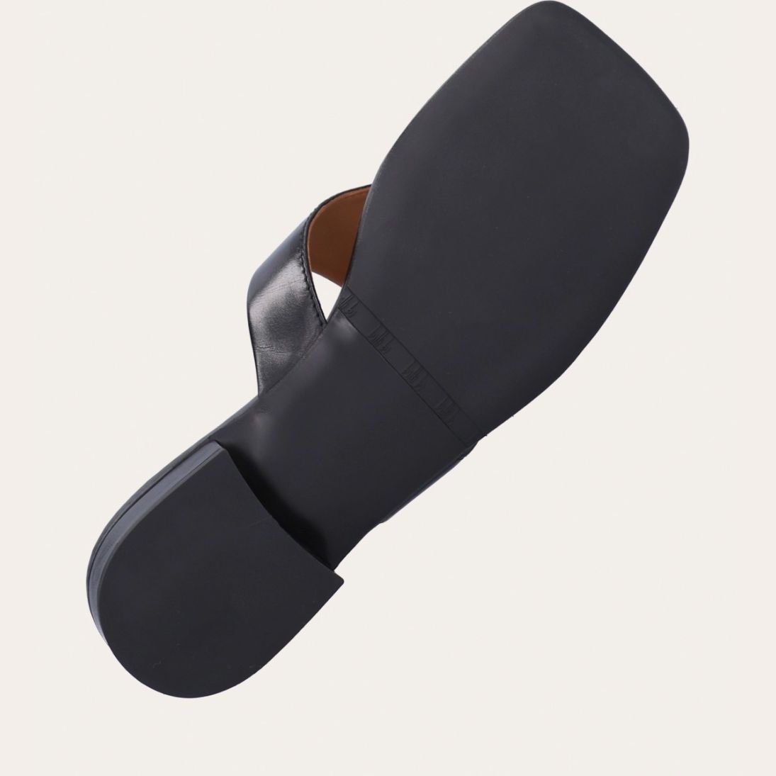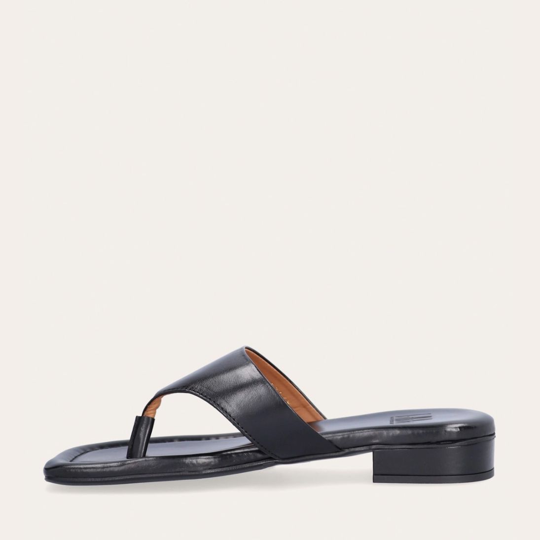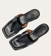 Håndlavet slip-on sandal udført i sort glat skind med en firkantet tå. Sandalen er designet med en bred strop henover foden og en tåstrop.