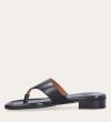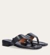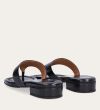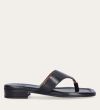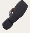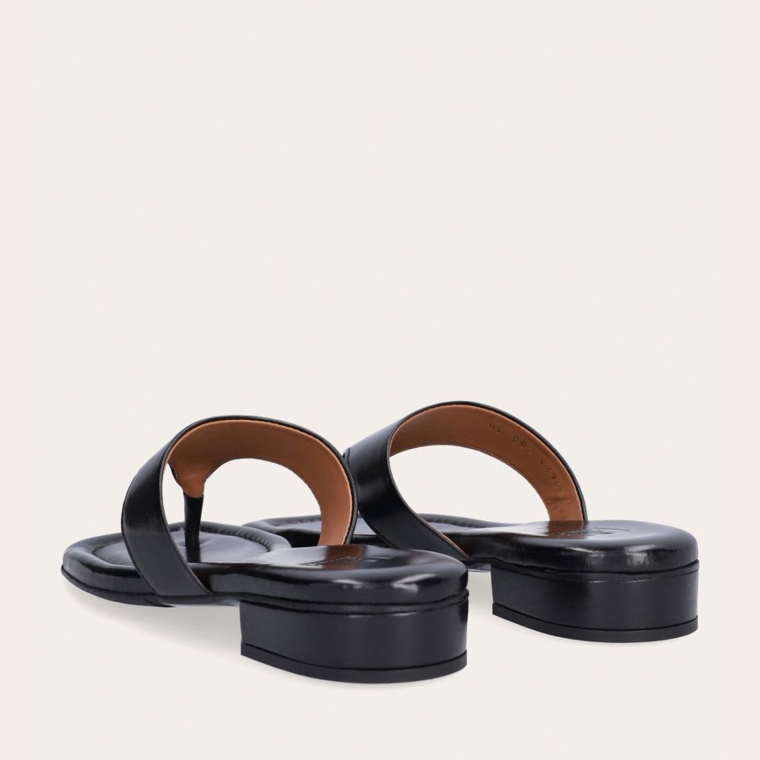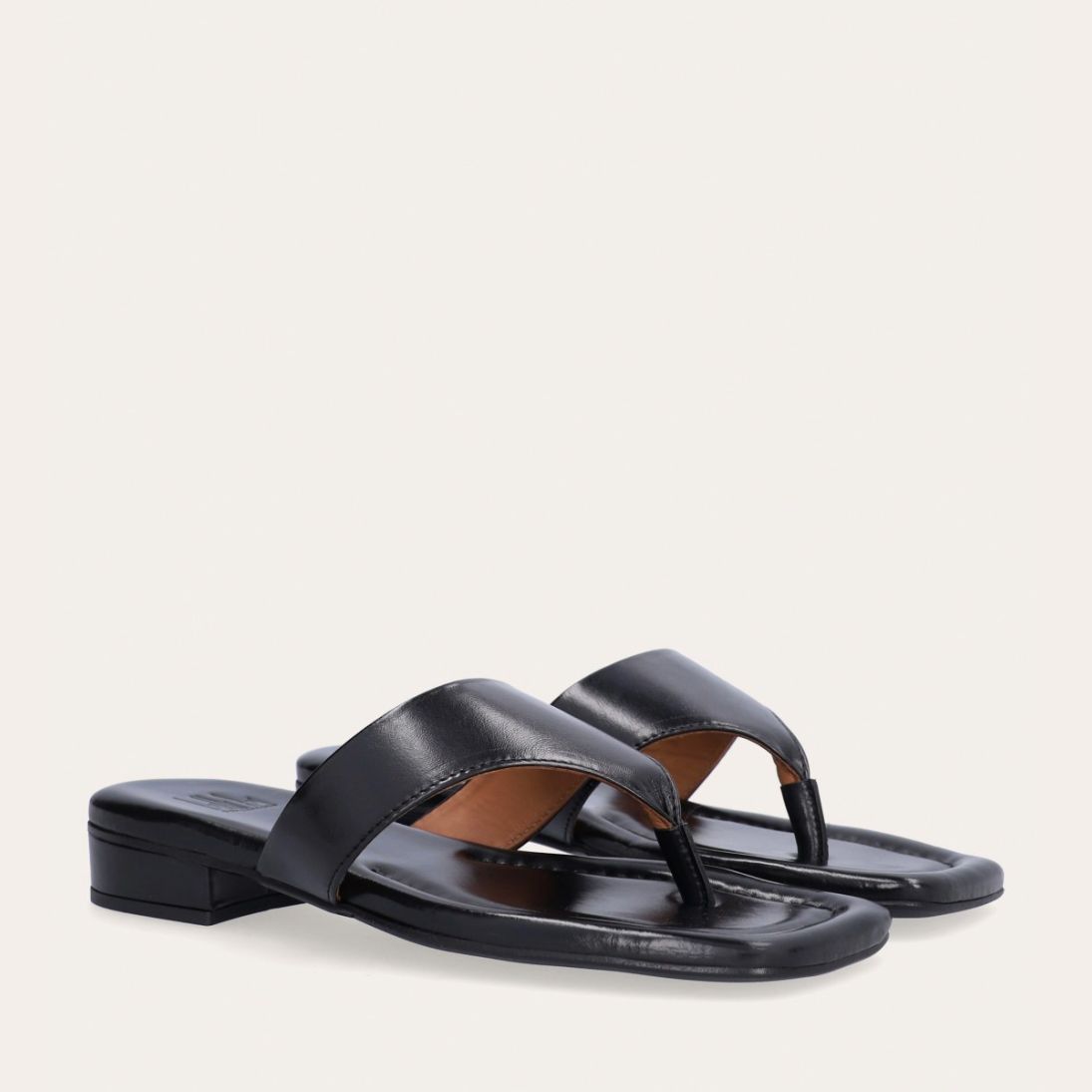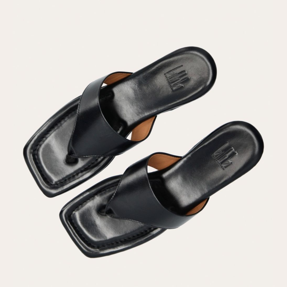 Håndlavet slip-on sandal udført i sort glat skind med en firkantet tå. Sandalen er designet med en bred strop henover foden og en tåstrop.