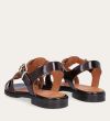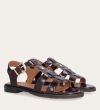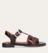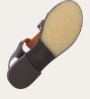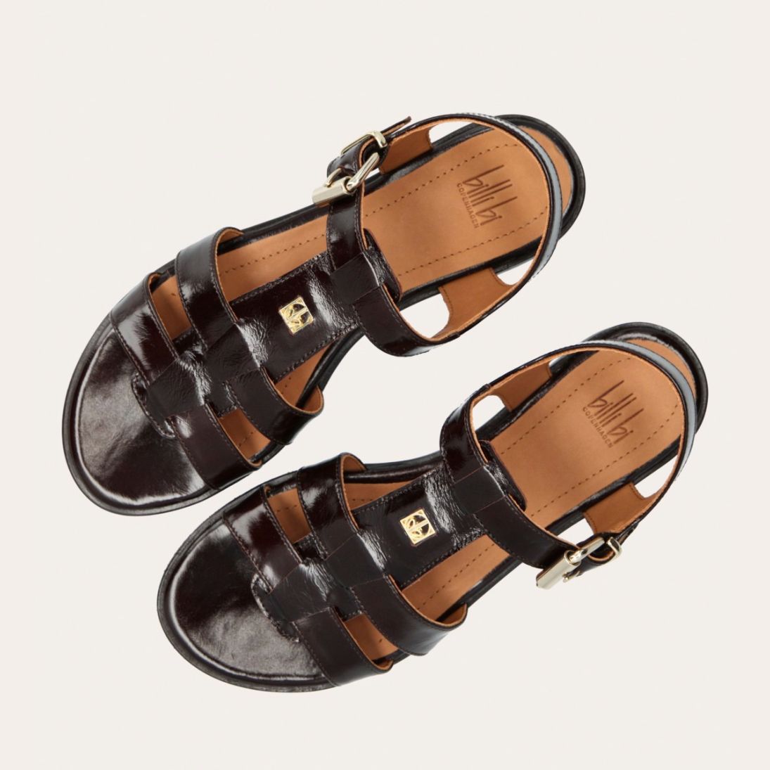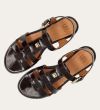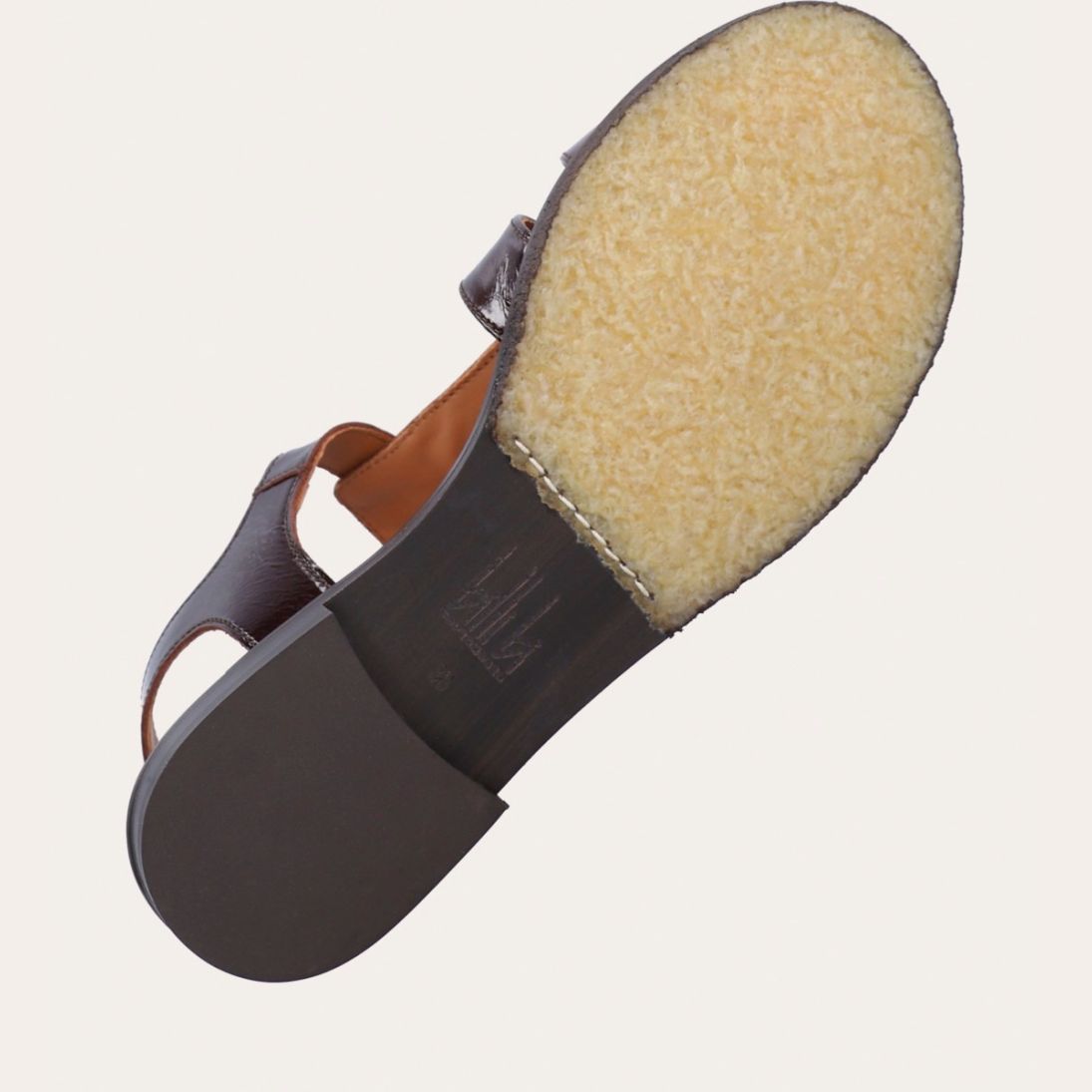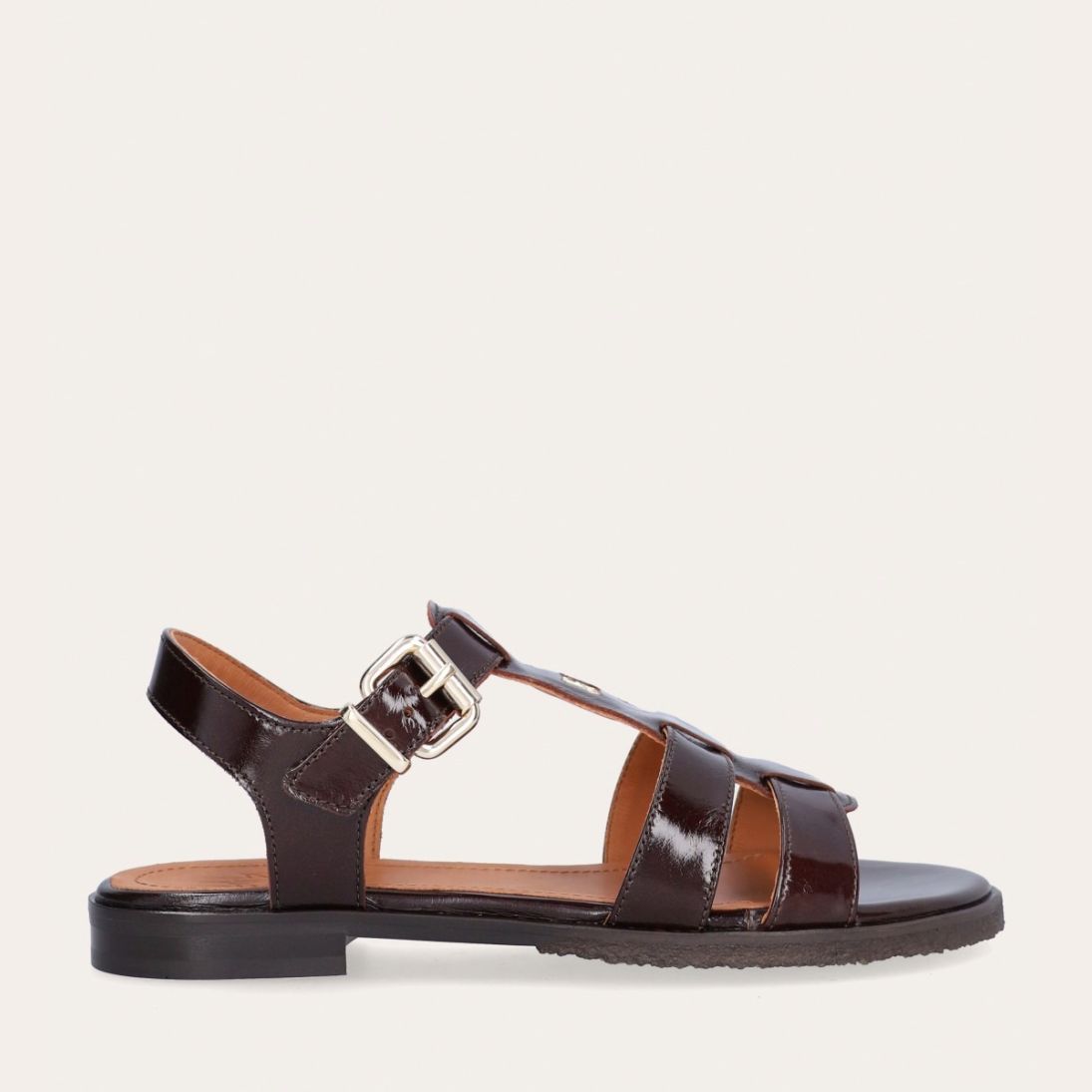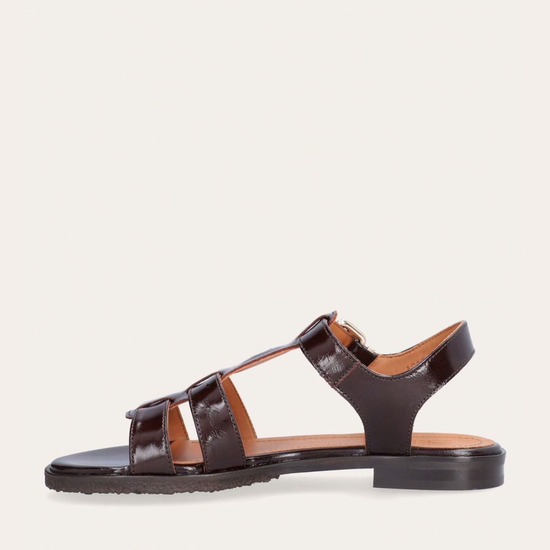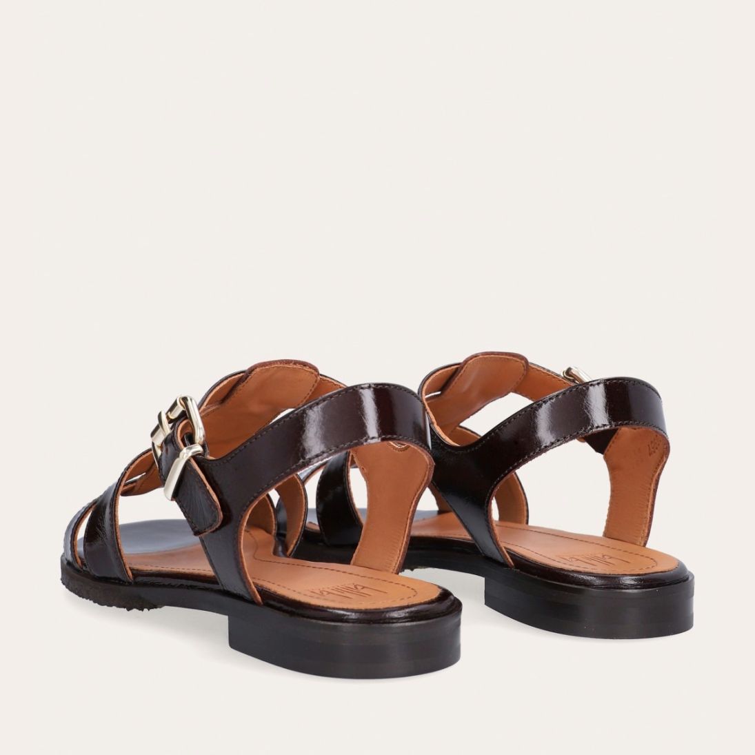 Håndlavet flad sandal, udført i mørkebrunt lakeret skind med en rund tå. Sandal er designet med to stropper foran på skoen, en gylden detalje og remmen omkring anklen lukkes med et gyldent spænde.