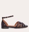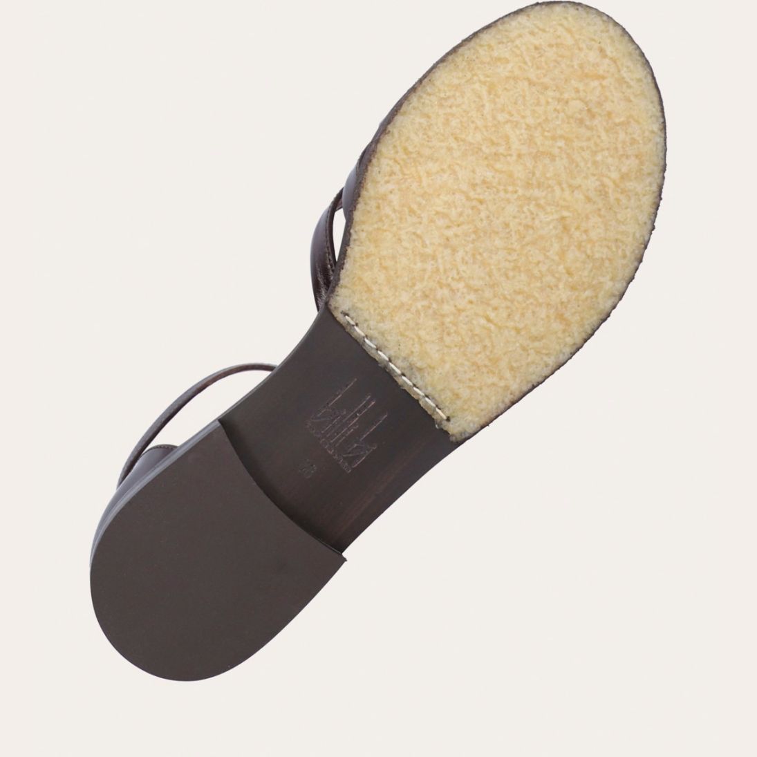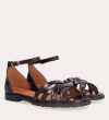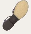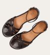 Håndlavet flad sandal, udført i mørkebrunt lakeret skind med en afrundet, åben tå. Sandalen har et elegant formet forstykke og diskrete udskæringer i siderne for et feminint udtryk. Den justerbare ankelrem lukkes med et gyldent spænde. Designet med lukket hælkappe for en raffineret silhuet.