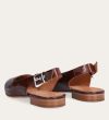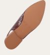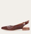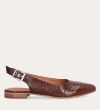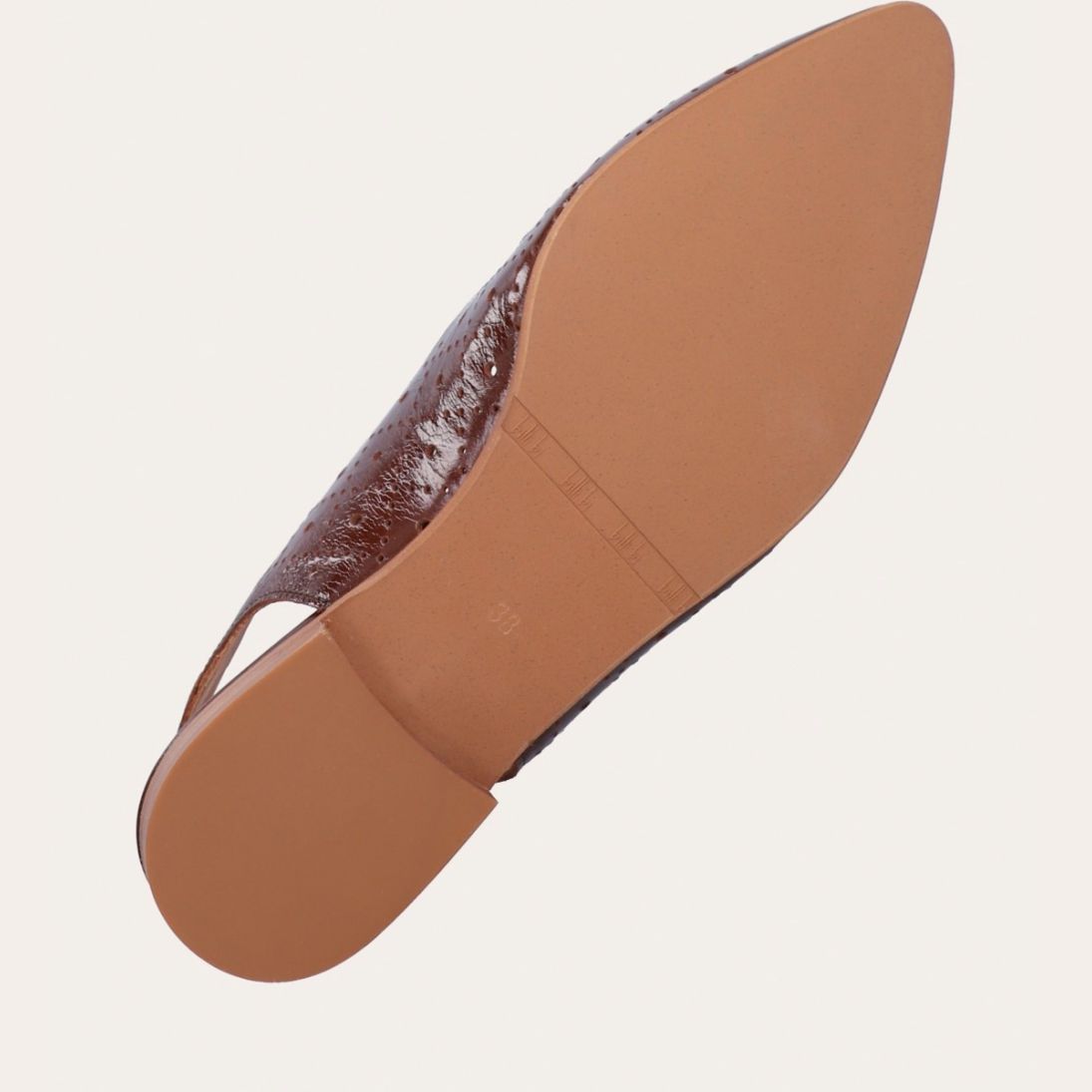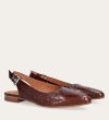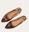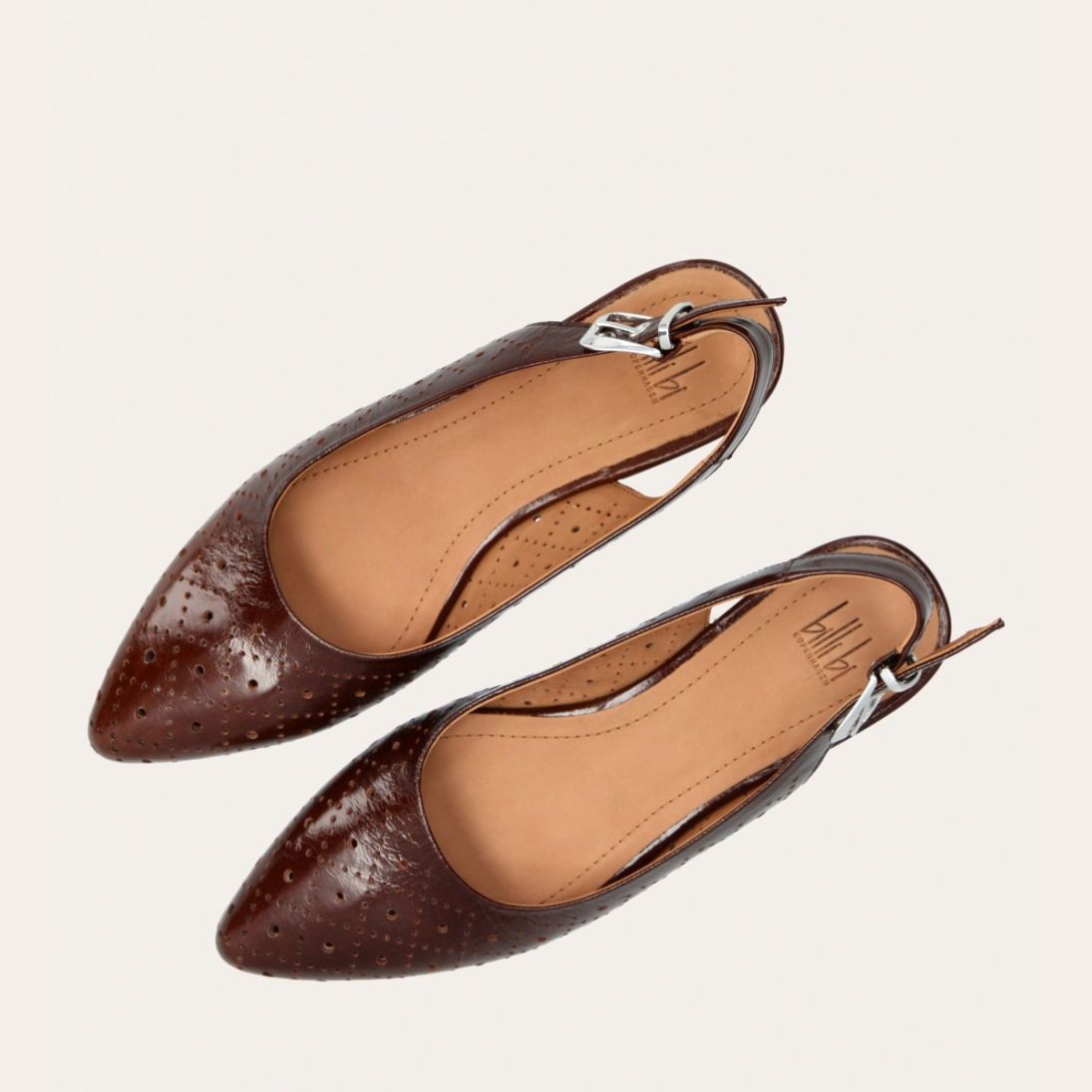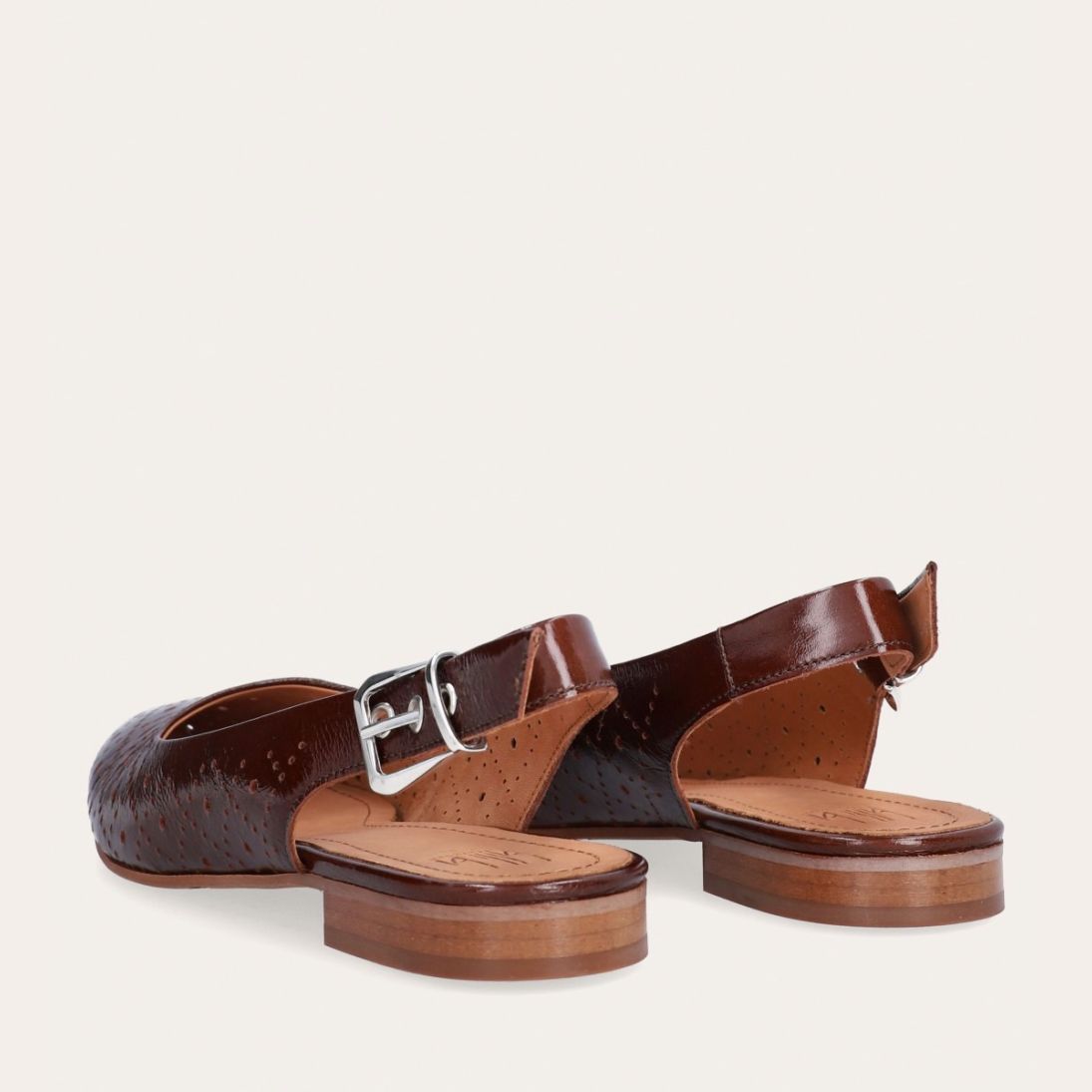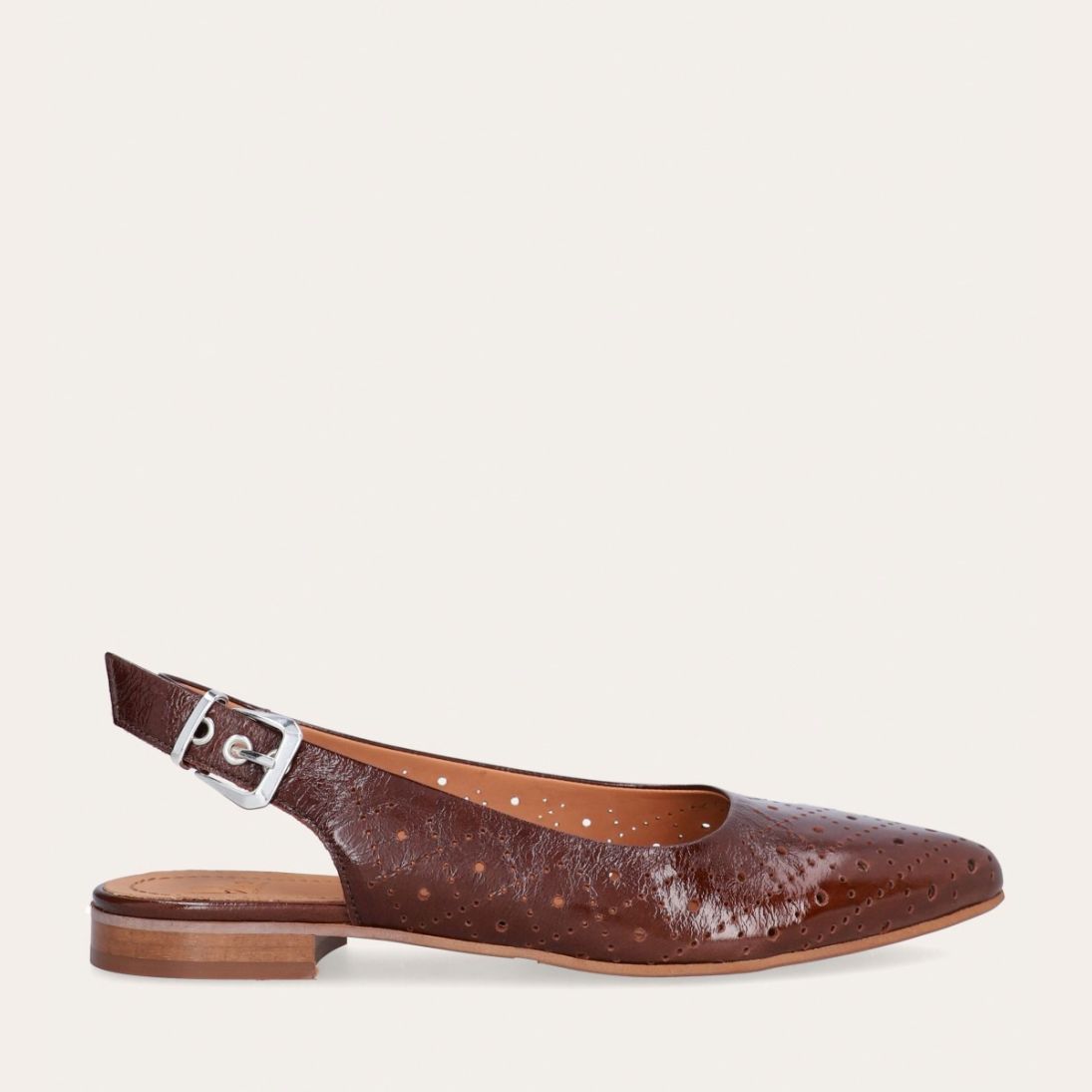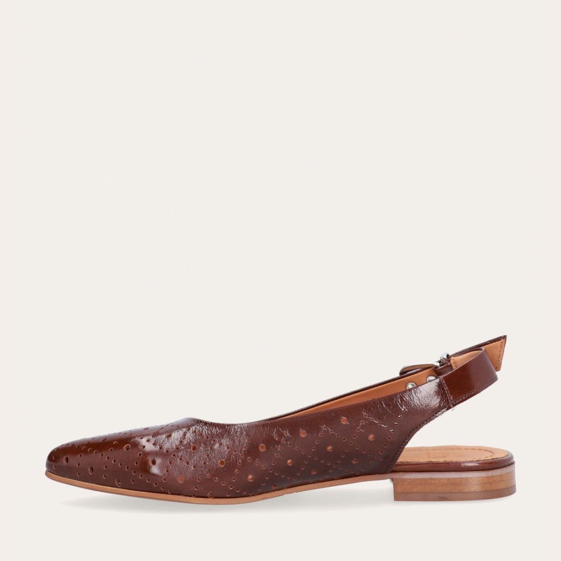 Håndlavet slingback ballerina udført i brunt lakeret skind med et perforeret mønster og spids tå. Slingback stroppen lukkes med et sølv-farvet spænde.