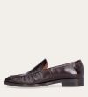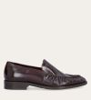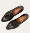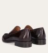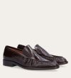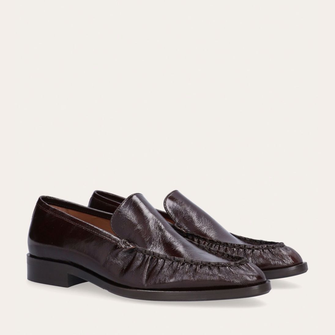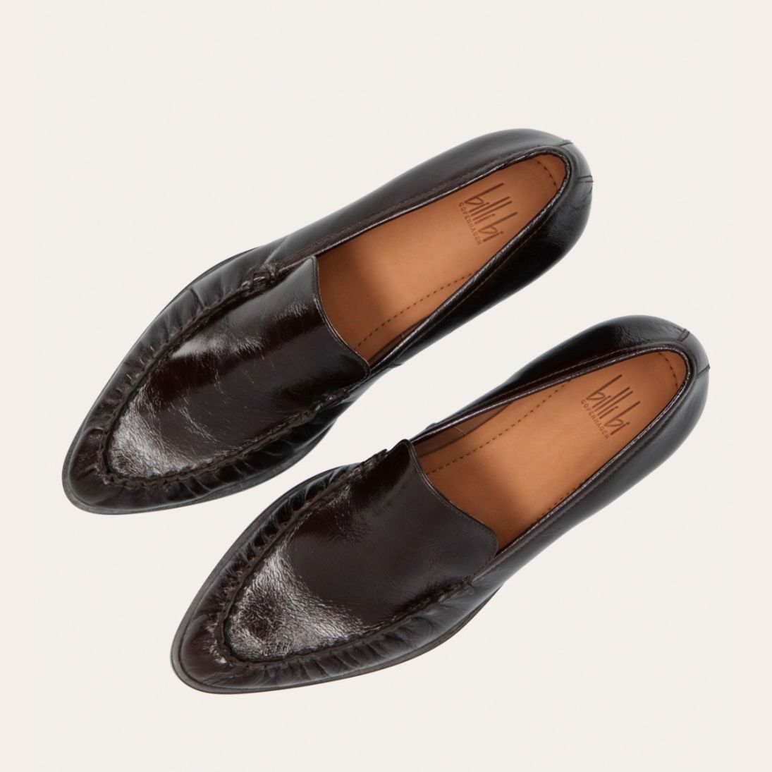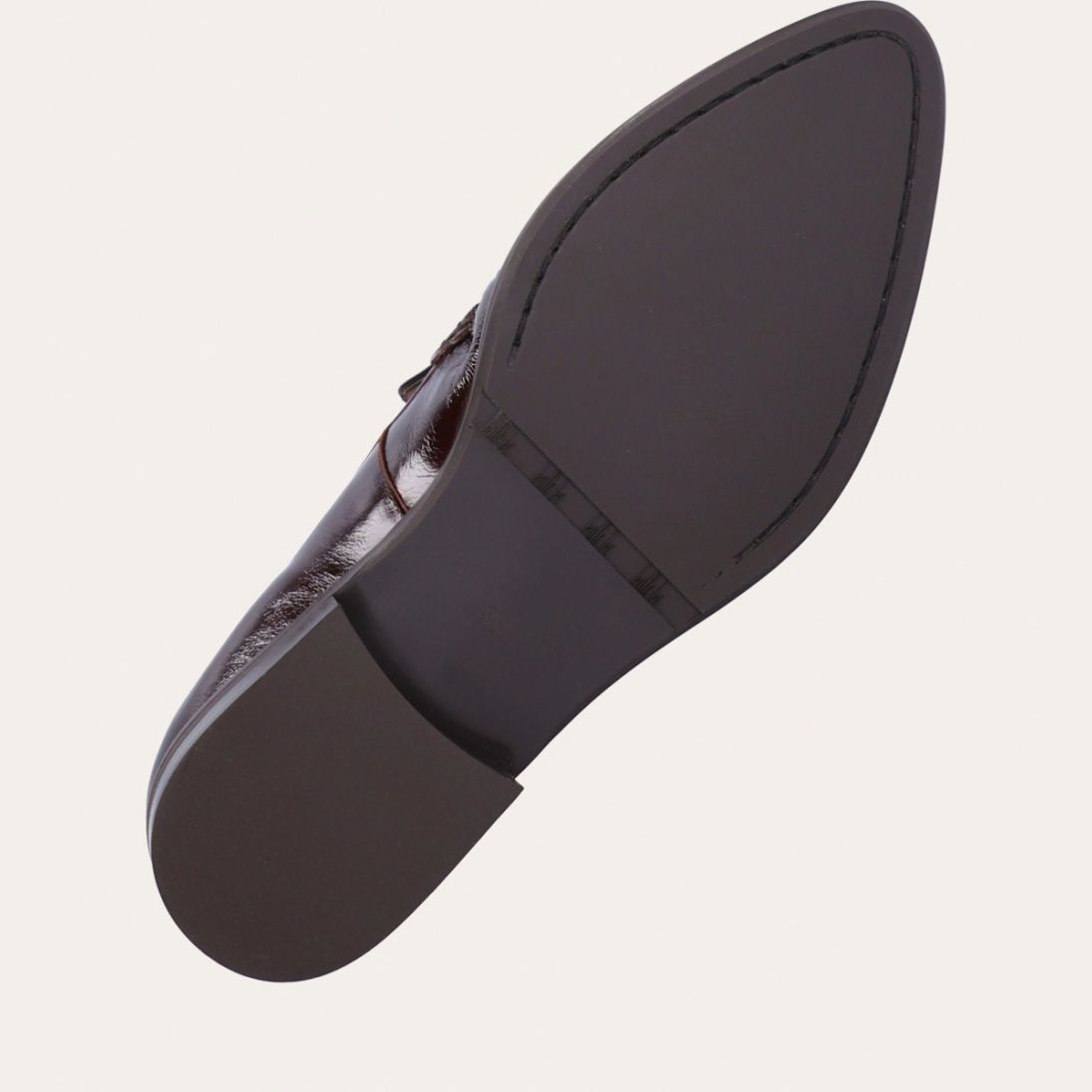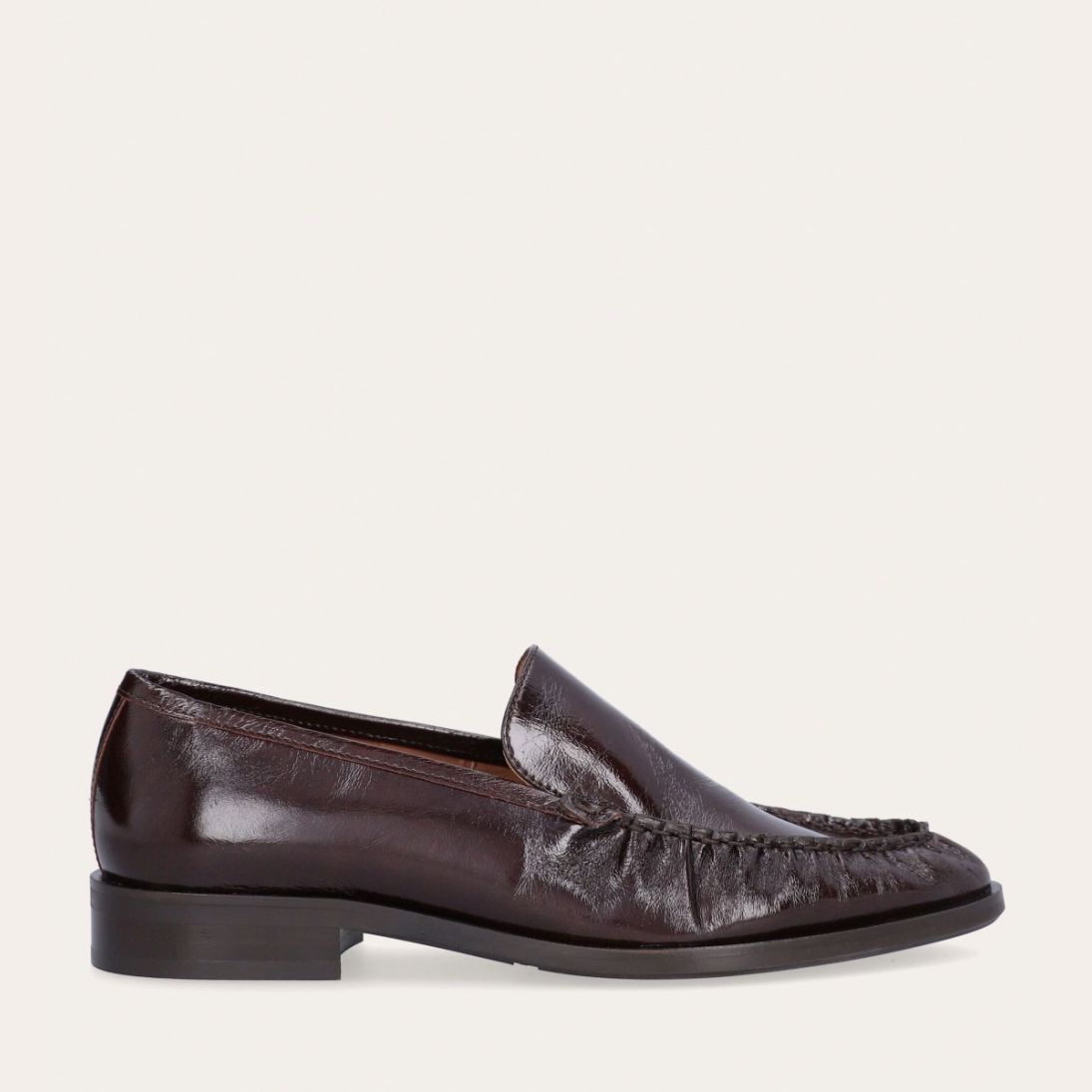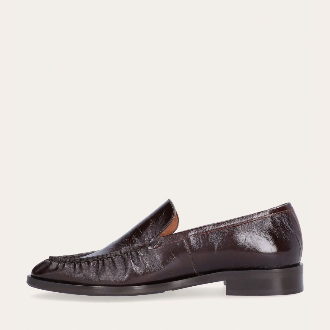 Håndlavet loafer, udført i mørkebrunt lakeret skind med spids tå. Foran er loaferen dekoreret med en markeret stikning, hvor skindet danner en let rynkning, der understreger den håndværksmæssige finish.
