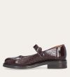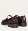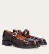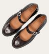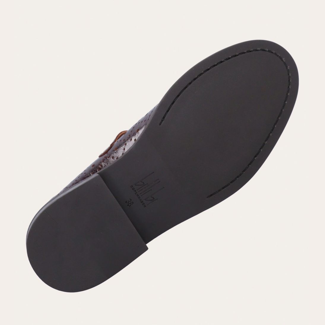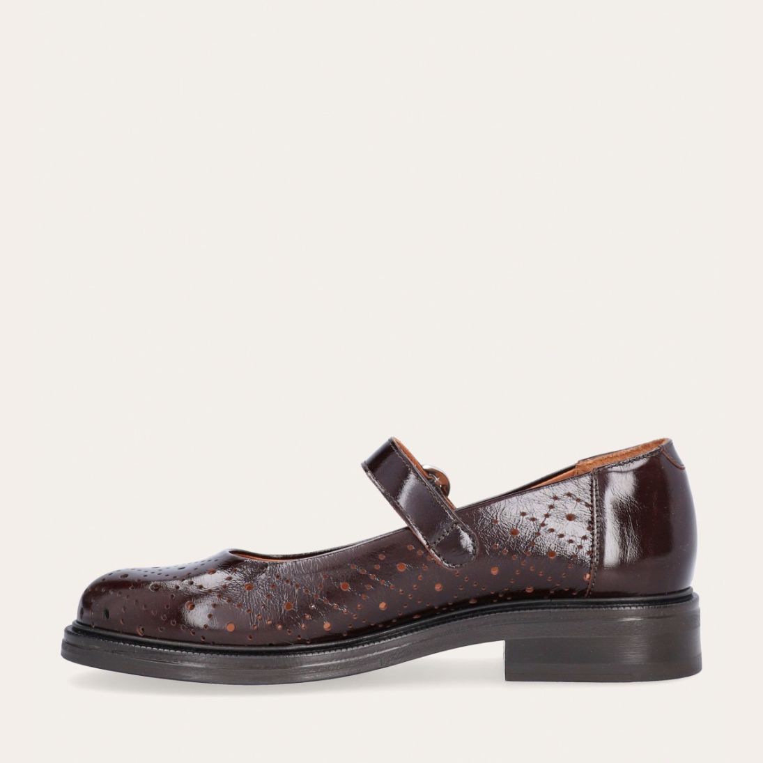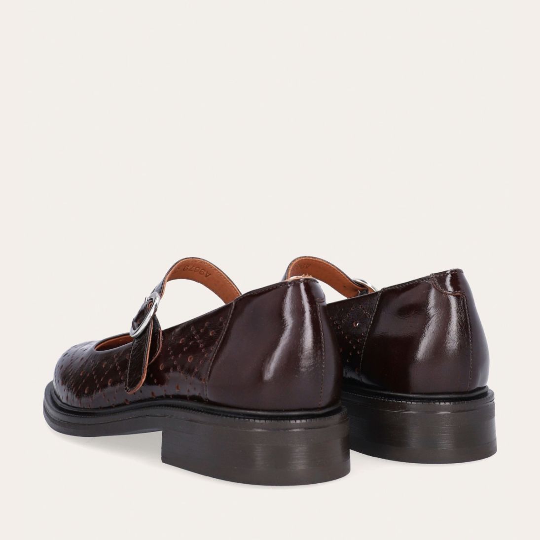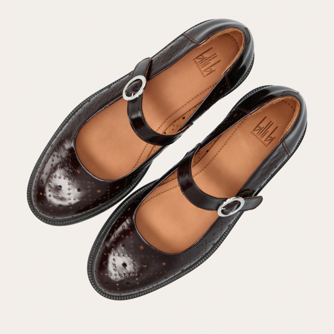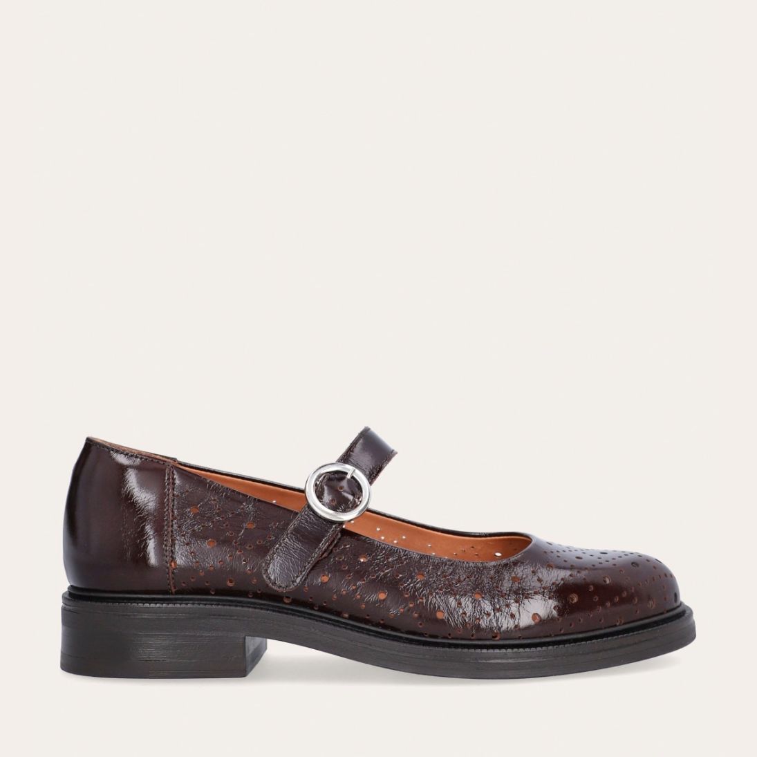 Håndlavet Mary Jane ballerina, udført i mørkebrunt lakeret skind med et perforeret mønster og en rund tå. Den har en strop henover fronten, som lukkes med et firkantet sølvspænde.