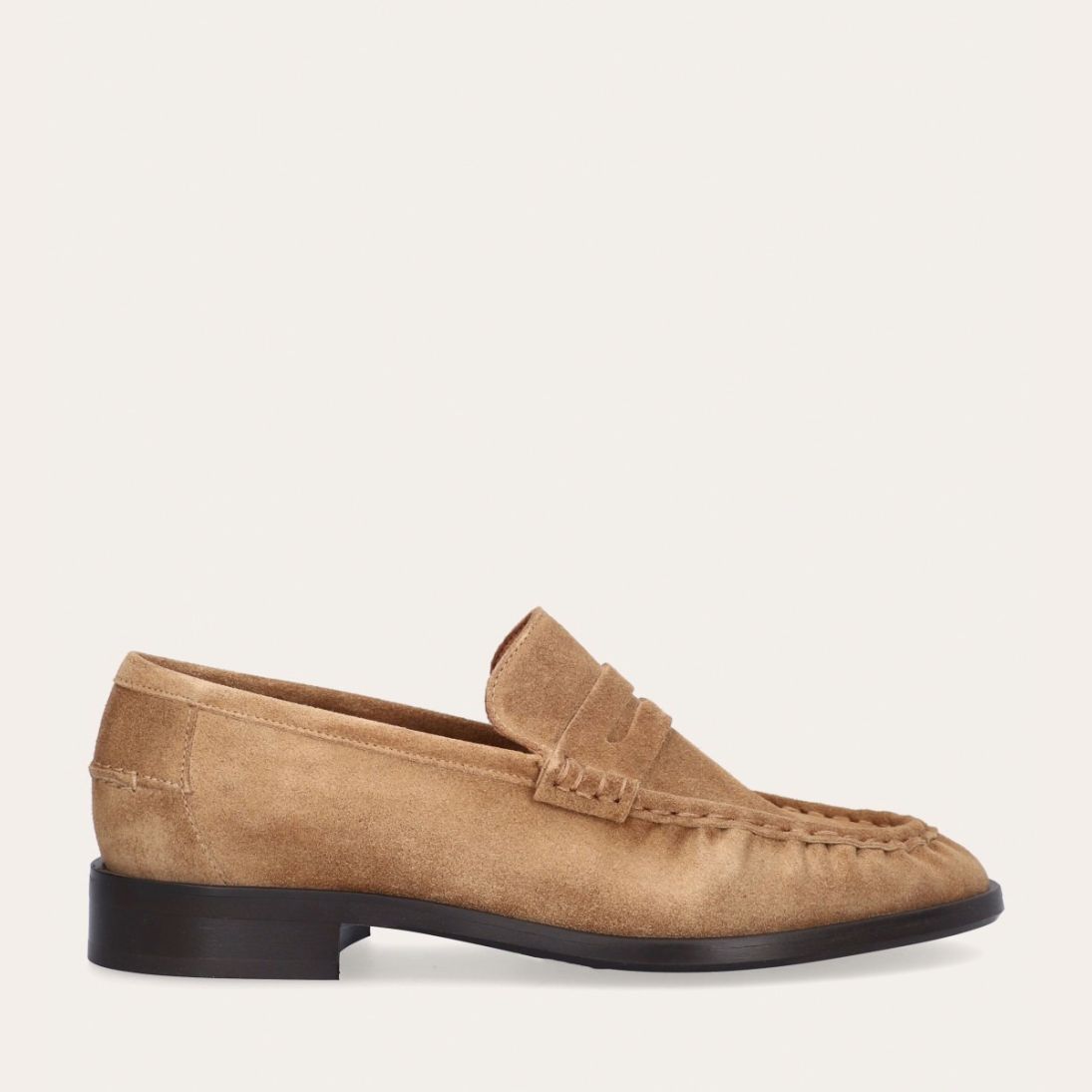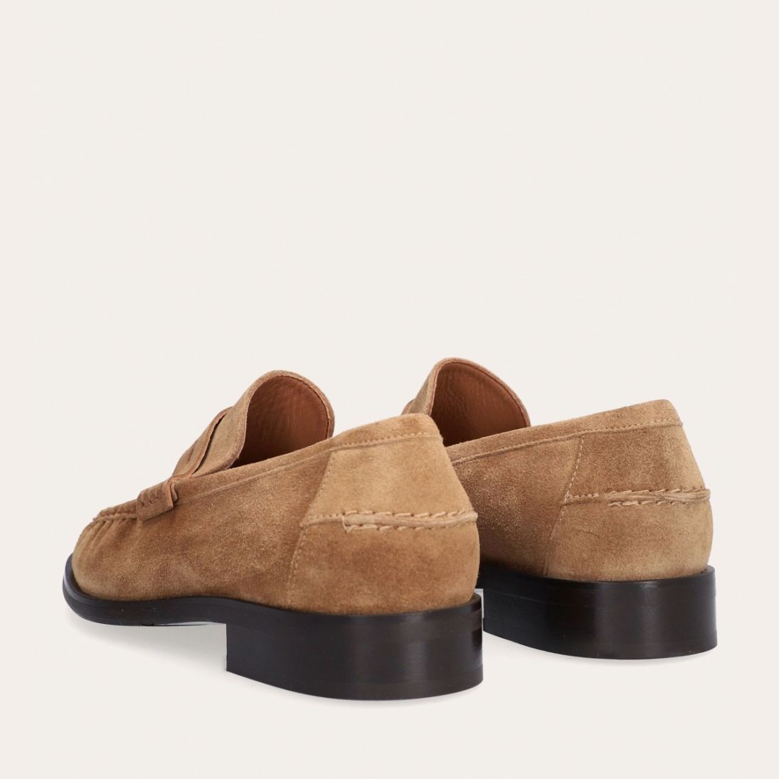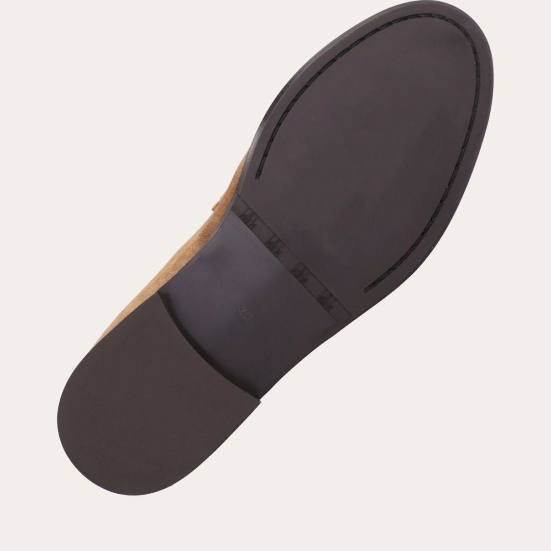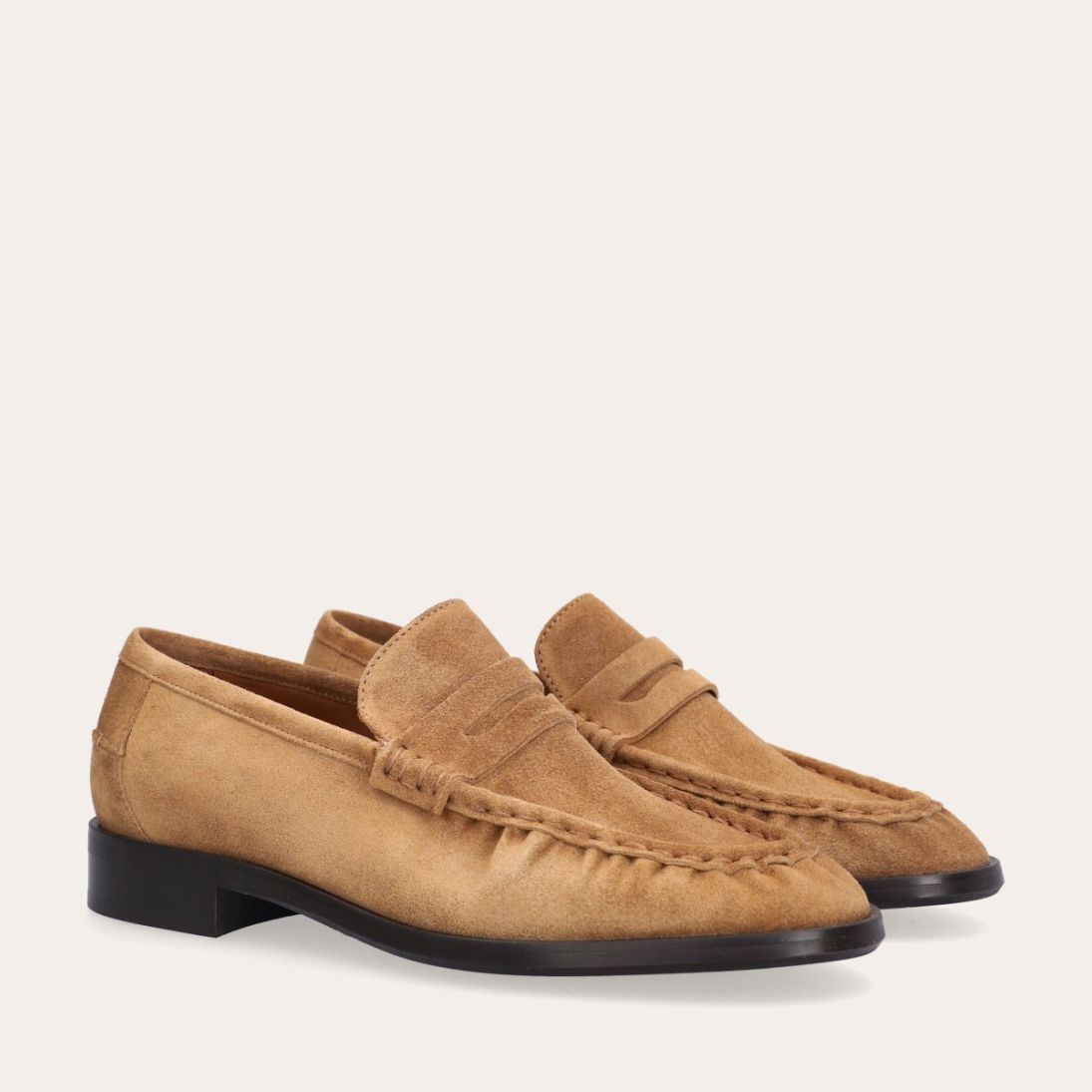 Håndlavet loafer, udført i lysebrunt ruskind med rund tå. Foran er loaferen dekoreret med en markeret stikning, hvor skindet danner en let rynkning, der understreger den håndværksmæssige finish og en strop med et dekorativt cut-out henover forfoden.