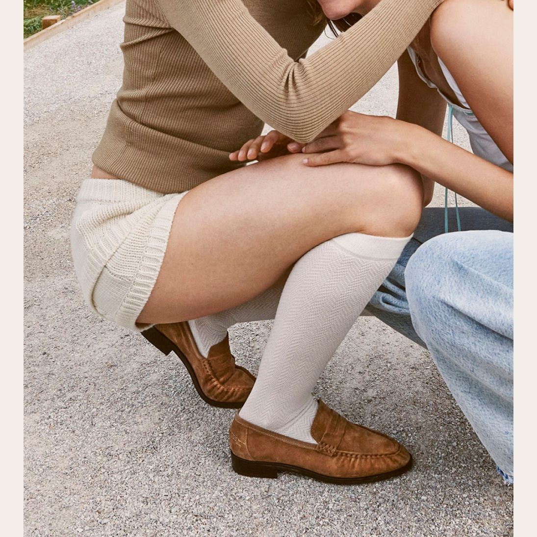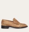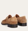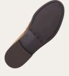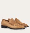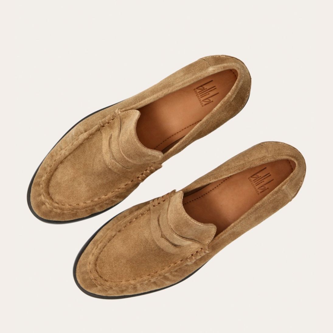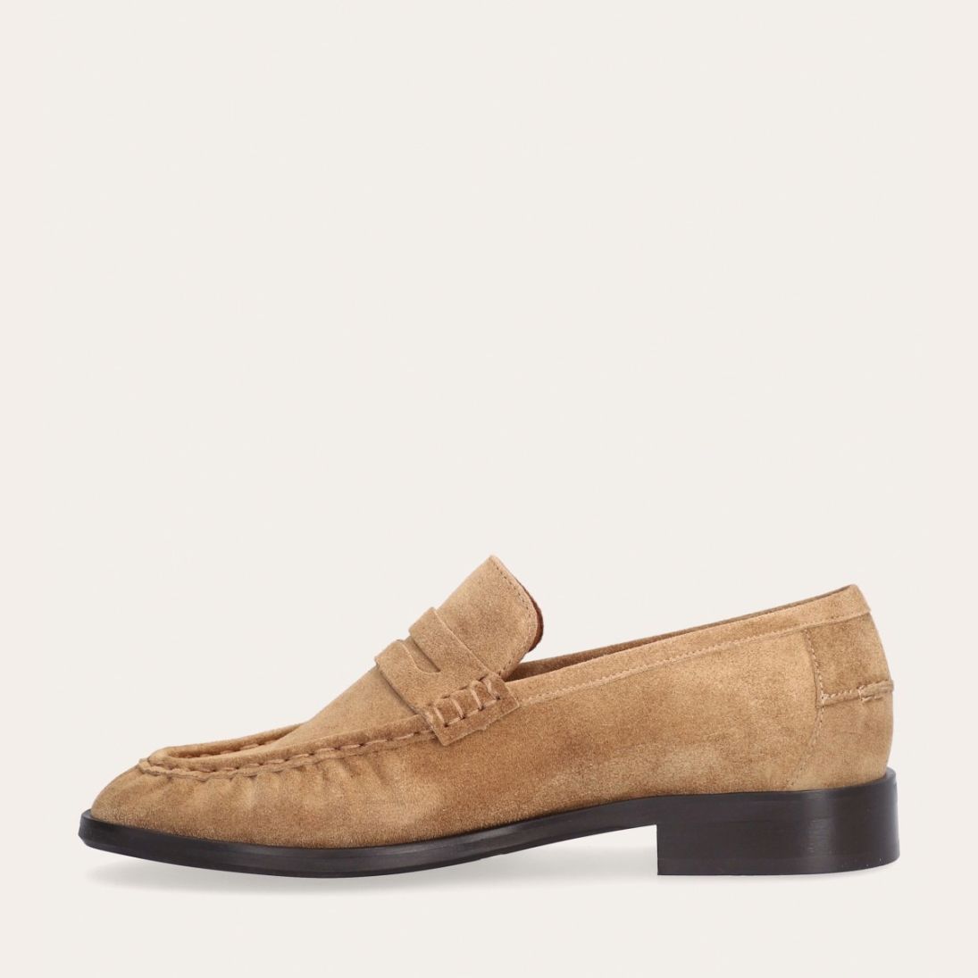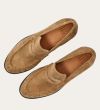 Håndlavet loafer, udført i lysebrunt ruskind med rund tå. Foran er loaferen dekoreret med en markeret stikning, hvor skindet danner en let rynkning, der understreger den håndværksmæssige finish og en strop med et dekorativt cut-out henover forfoden.