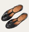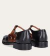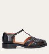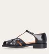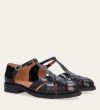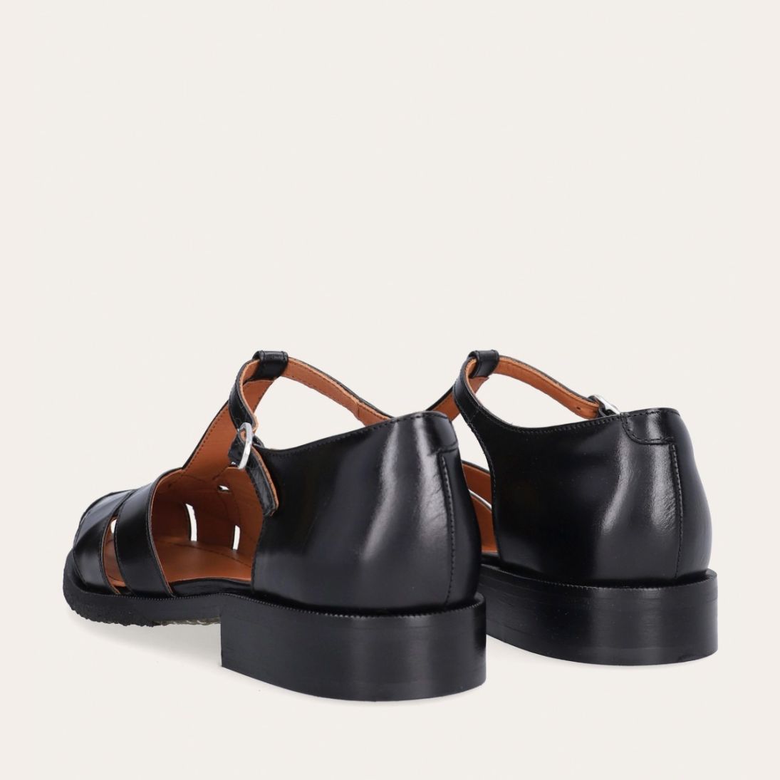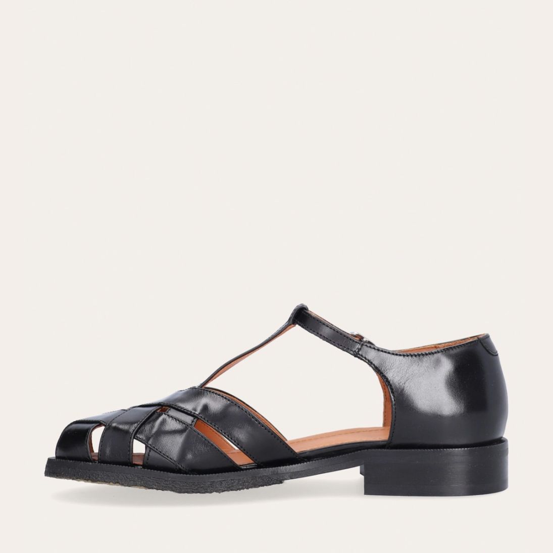 Håndlavet flad fishermen sandal, udført i sort glat skind med rund tå. Sandalens front er konstrueret af stropper i skind, som er vævet ind mellem hinanden. Sandalen lukkes med et lille sølv-farvet spænde. Designet med lukket hælkappe for en raffineret silhuet.