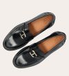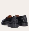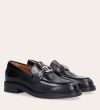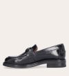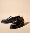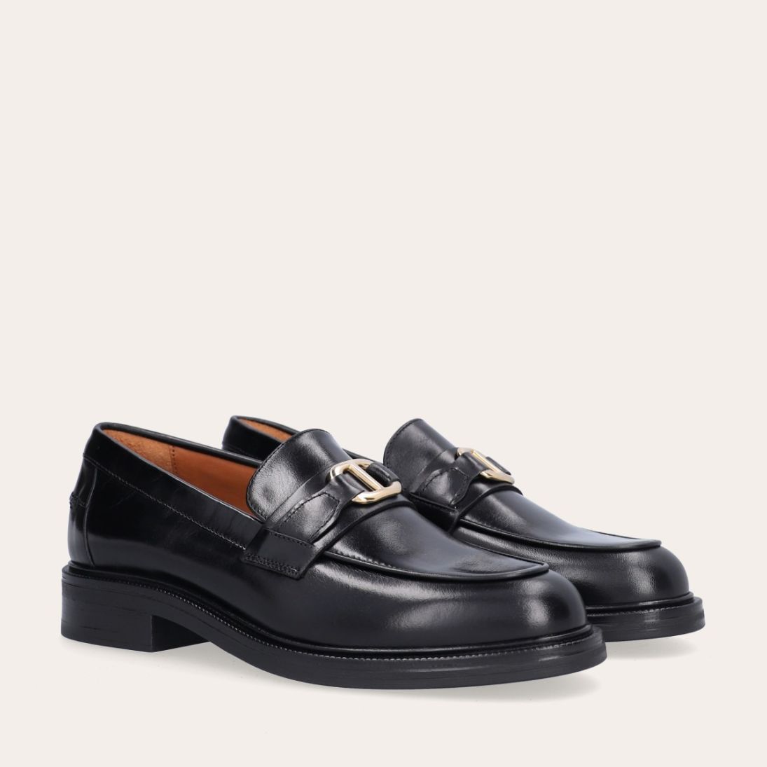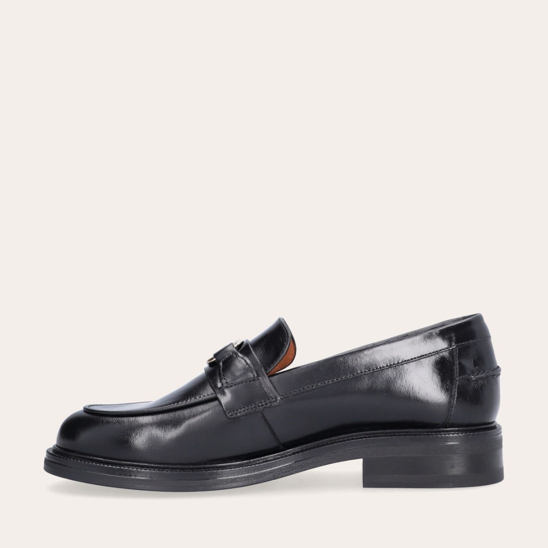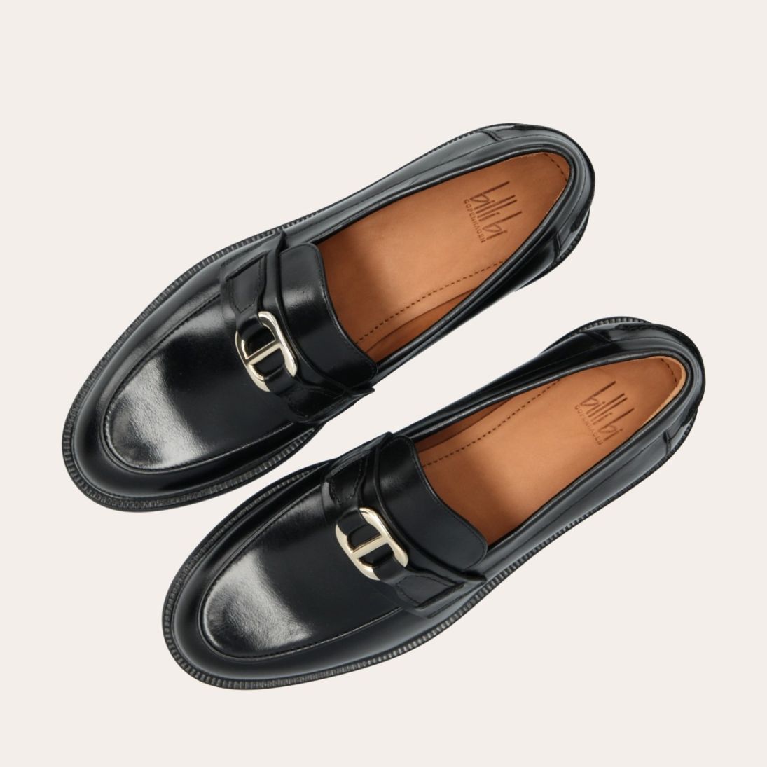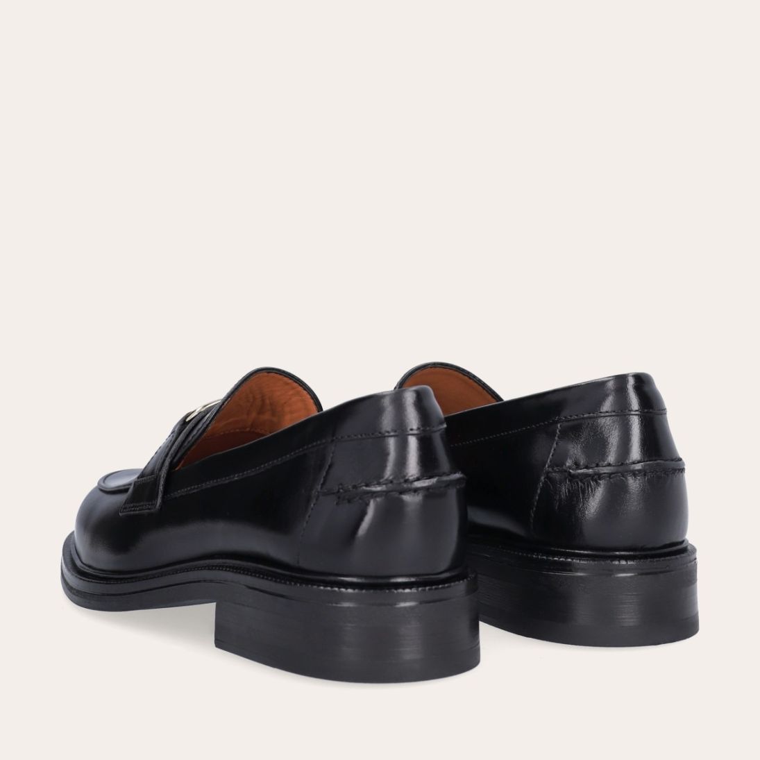 Håndlavet loafer, udført i sort glat skind med rund tå. Loaferen er dekoreret med en skindstrop med sølv spænde på forfoden samt piping foran og bagpå.
