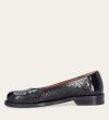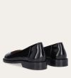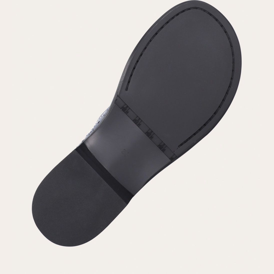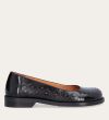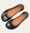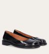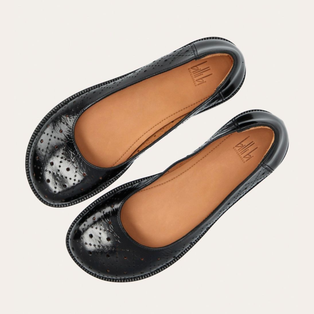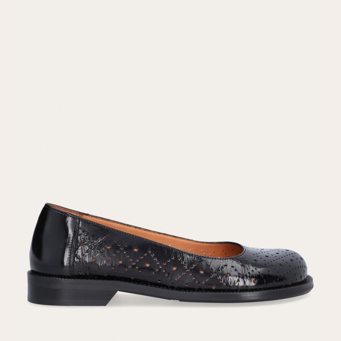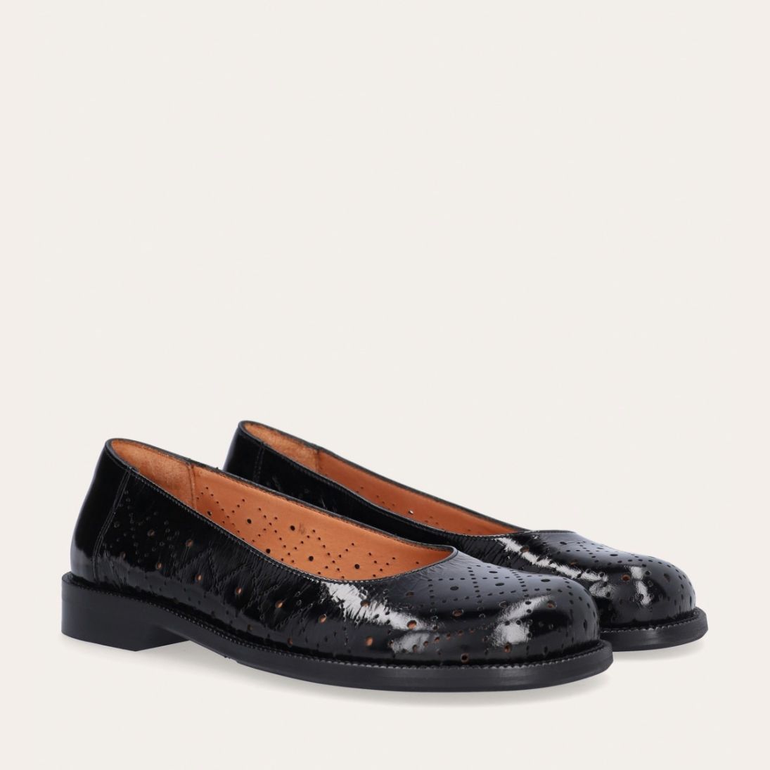 Håndlavet ballerina udført i sort lakeret skind med en rundet tå. Ballerinaen er designet med et elegant perforeret mønster i skindet.